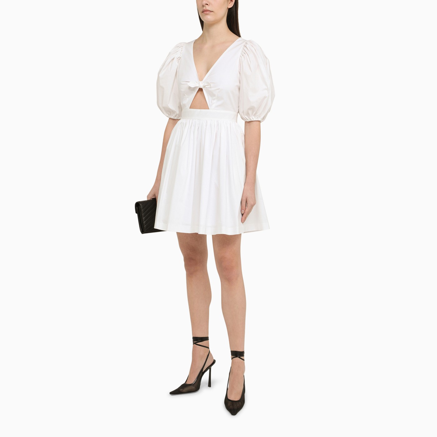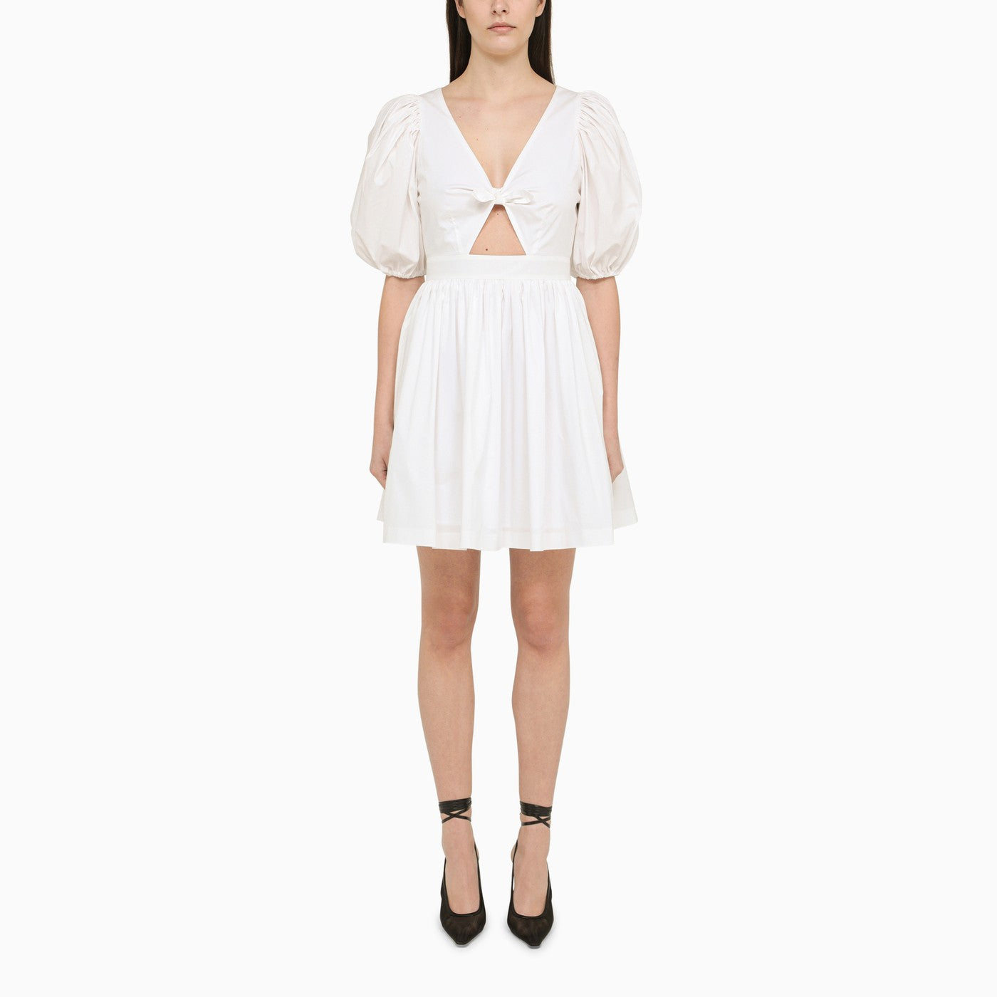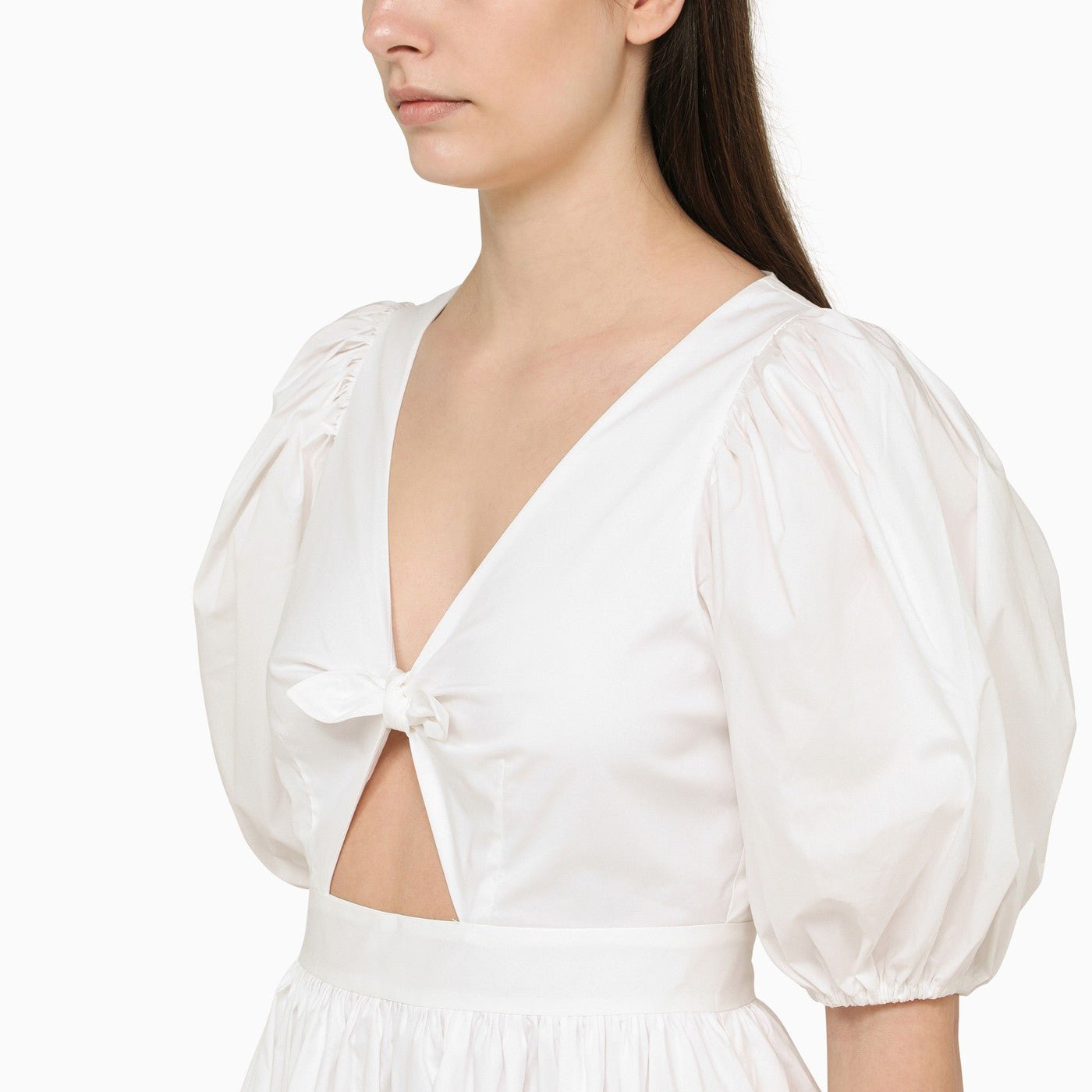 White organic cotton blend mini dress from Rotate featuring puff sleeves, front cut out with bow, V-neck and back zip fastening.