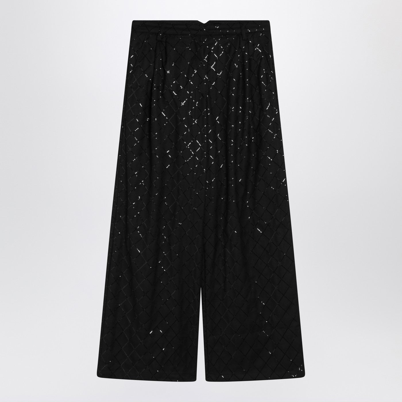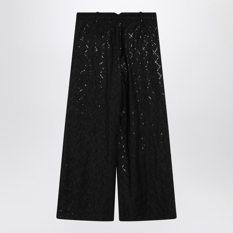 Wide trousers from Rotate in black recycled fabric, featuring front zip and hook fastening, waist loops, two side welt pockets, two back welt pockets and all-over sequin diamond pattern.