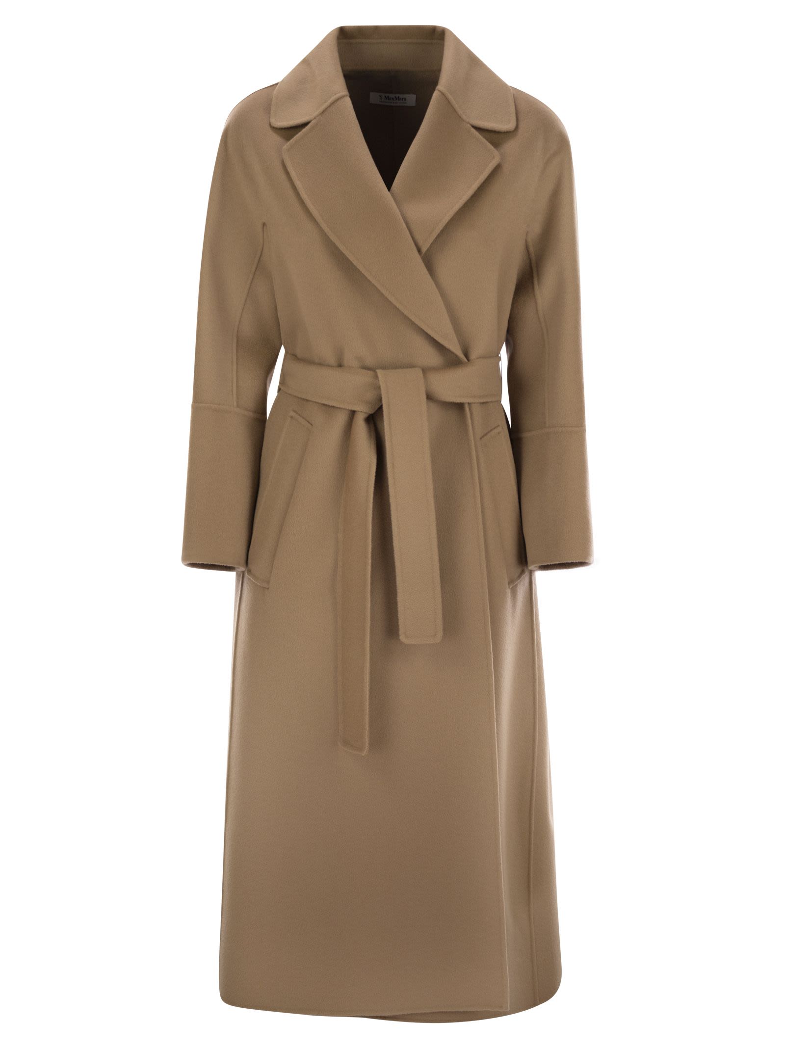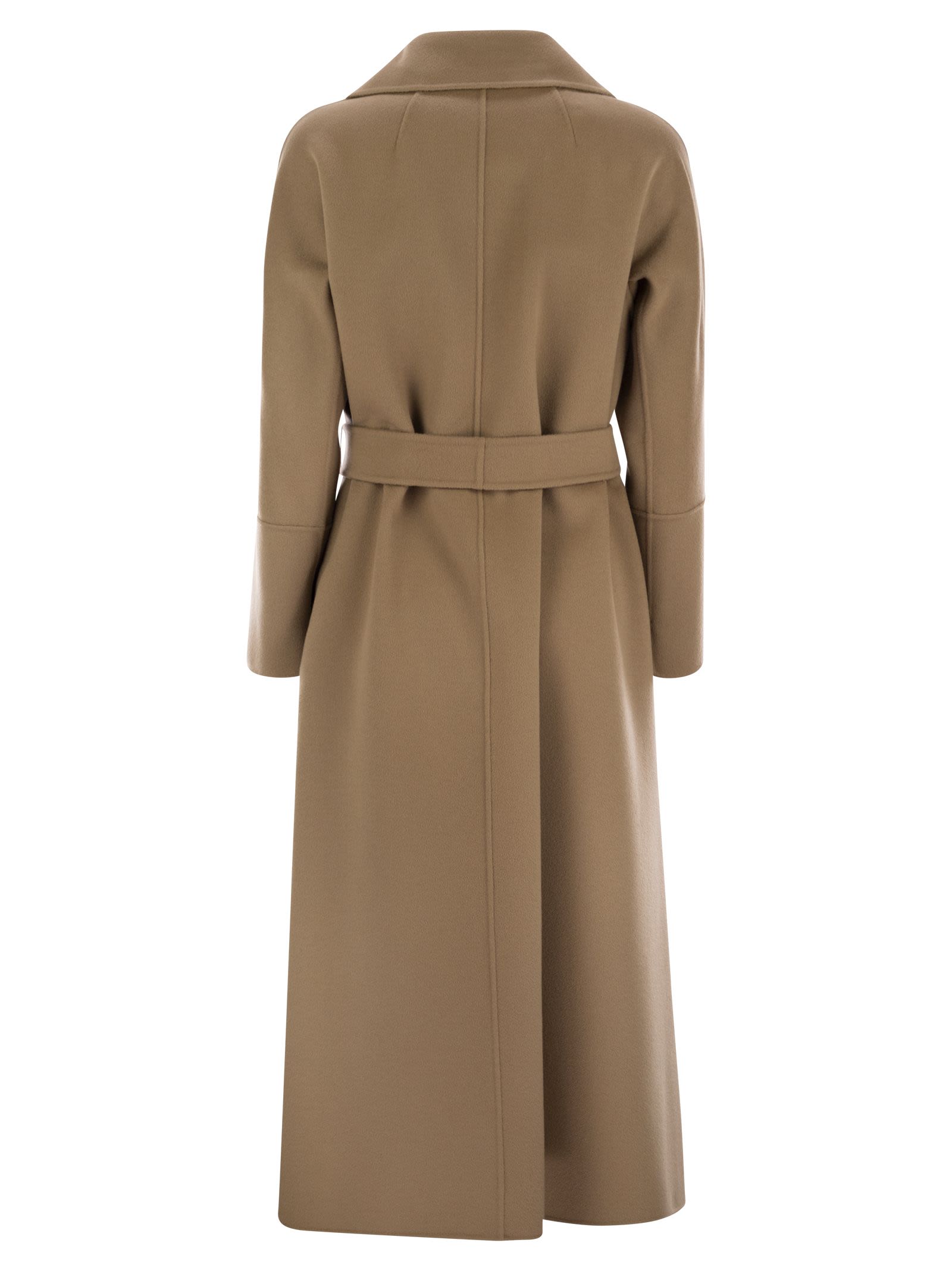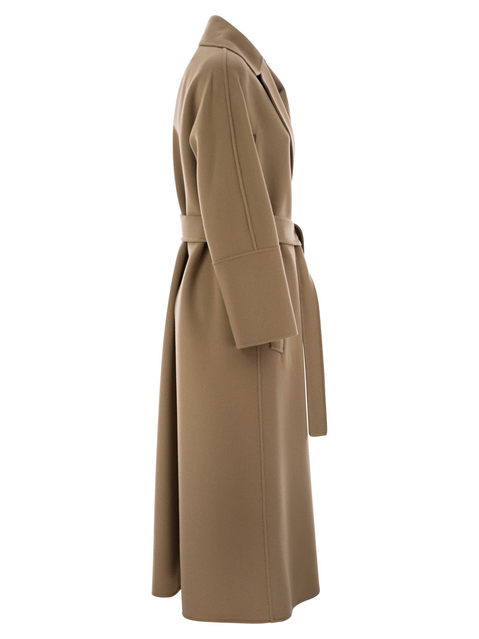 Long coat in hand-sewn pure wool double fabric, with lapel collar and welt pockets. Slightly flared line at the bottom. Fastened with matching belt. - Soft fit DESIGNER ID: 2519011081600 033