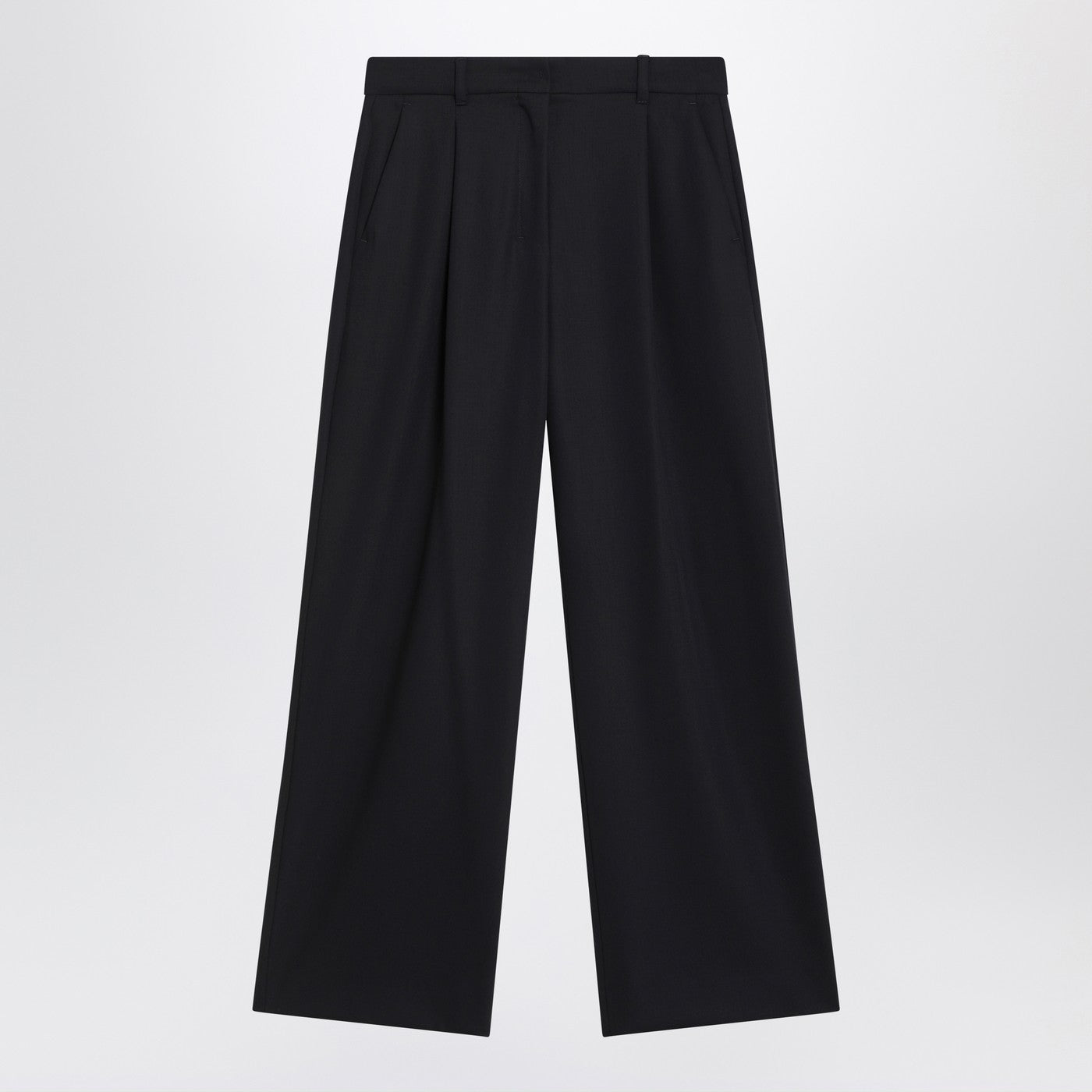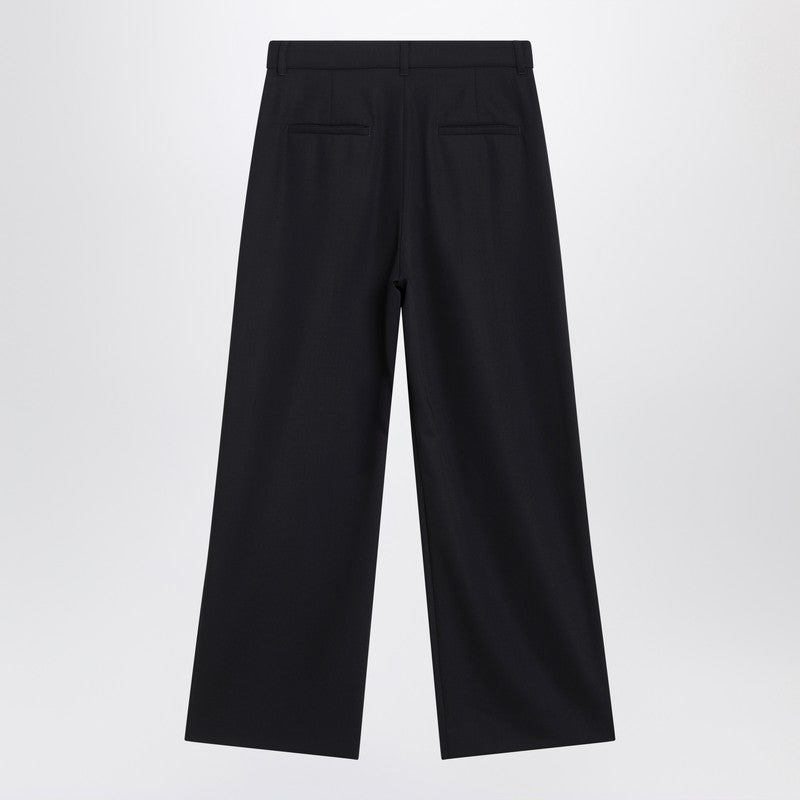 'S Max Mara navy blue virgin wool trousers, characterized by a front closure with zip and hook, belt loops, two side welt pockets, and two back welt pockets.