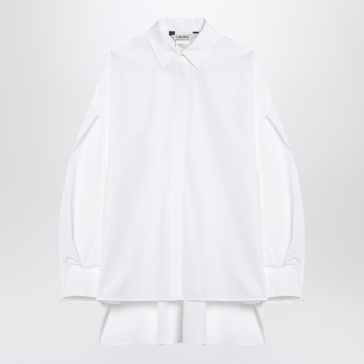 'S Max Mara white cotton poplin shirt, characterized by hidden front buttoning, classic collar, long sleeves with button cuffs, asymmetric hem, and loose fit.