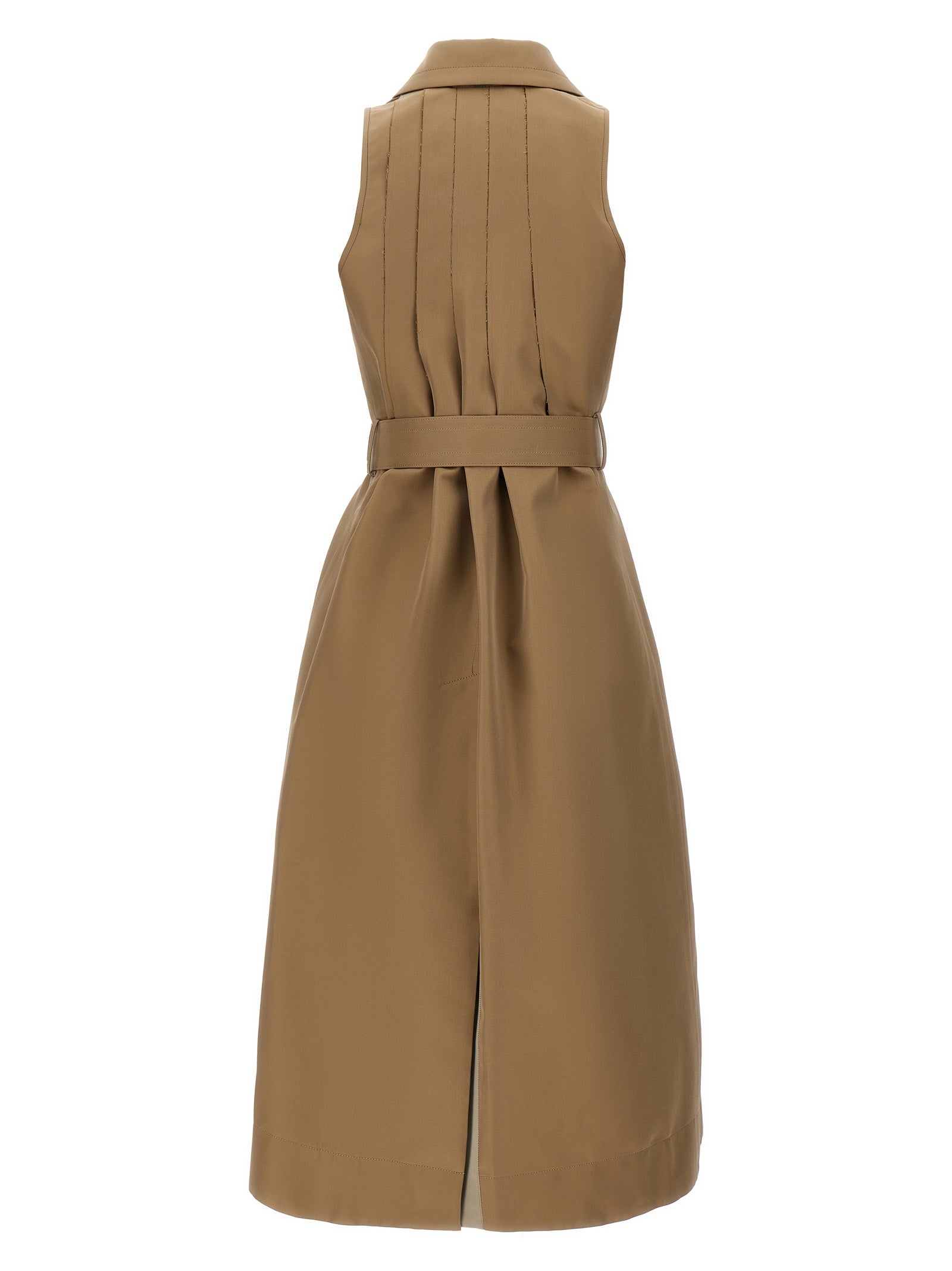 Sleeveless cotton gabardine trench coat dress with covered button closure and shirt-style collar and removable belt.