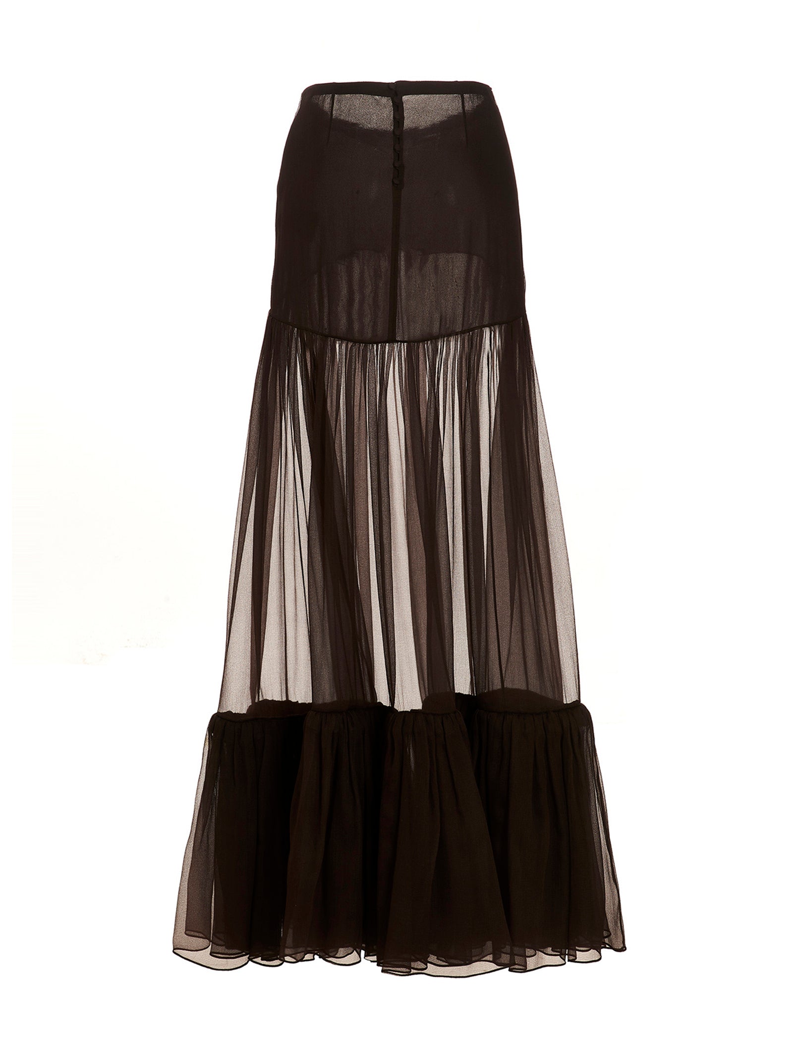 Flounced silk long skirt with back button closure, asymmetric hem and silk lining.