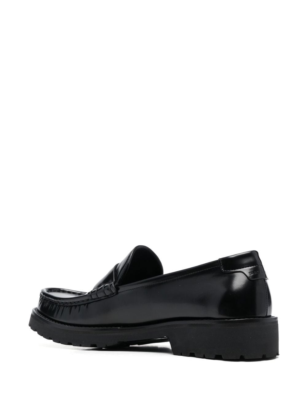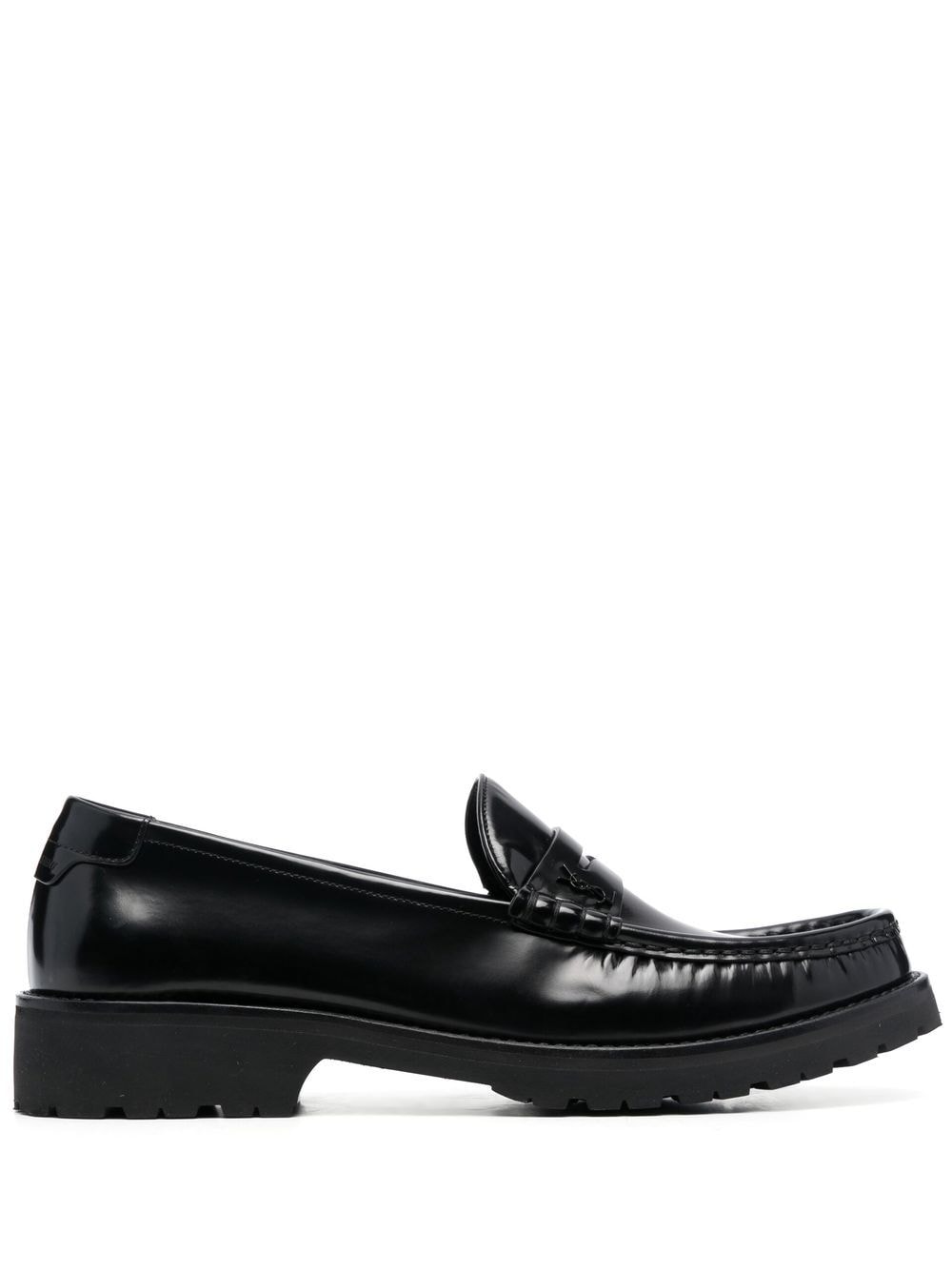 Le Loafer high-shine finish flat shoes from SAINT LAURENT featuring black, calf leather, patent finish, round toe, signature YSL logo plaque, branded insole and low block heel.