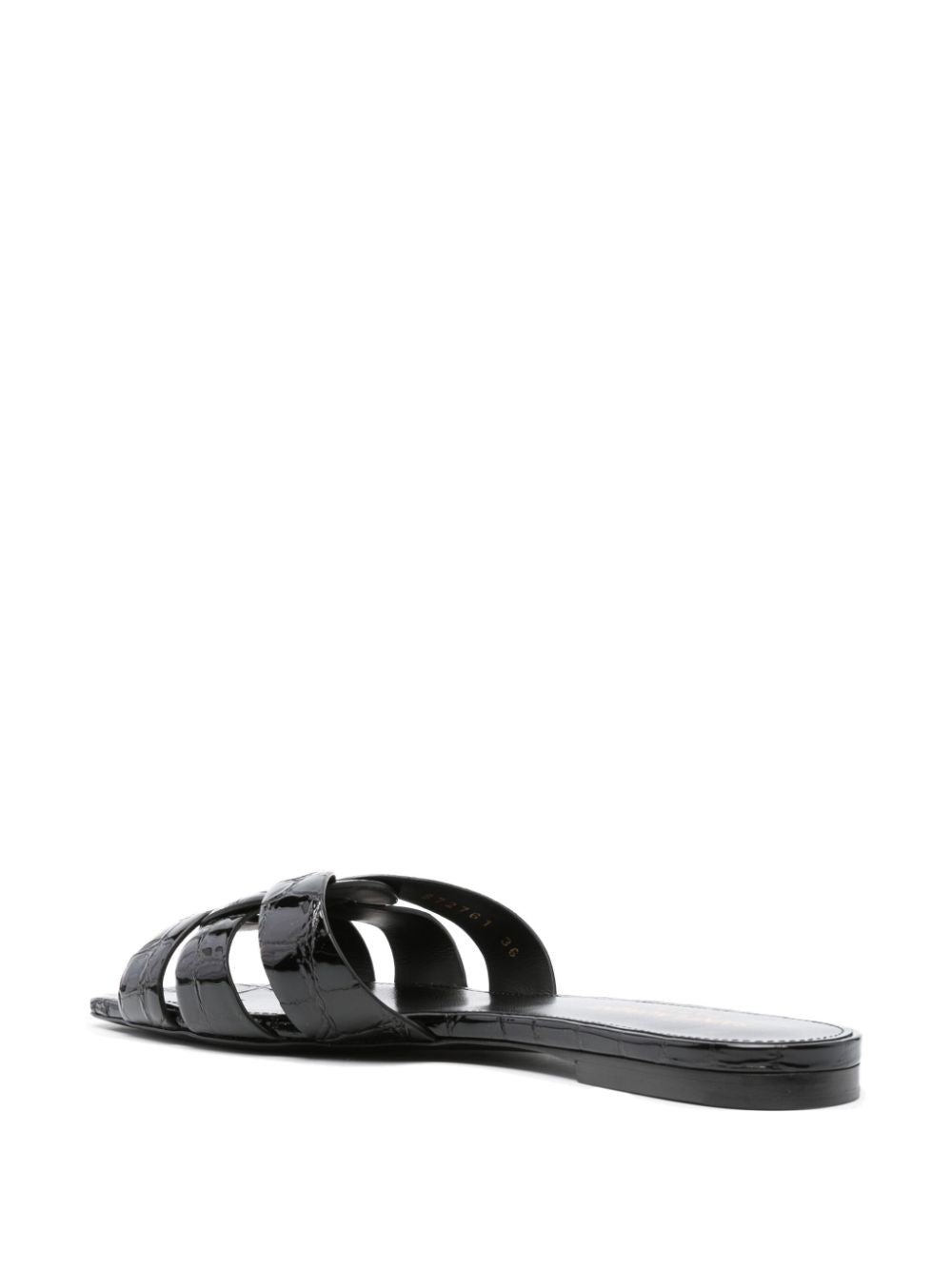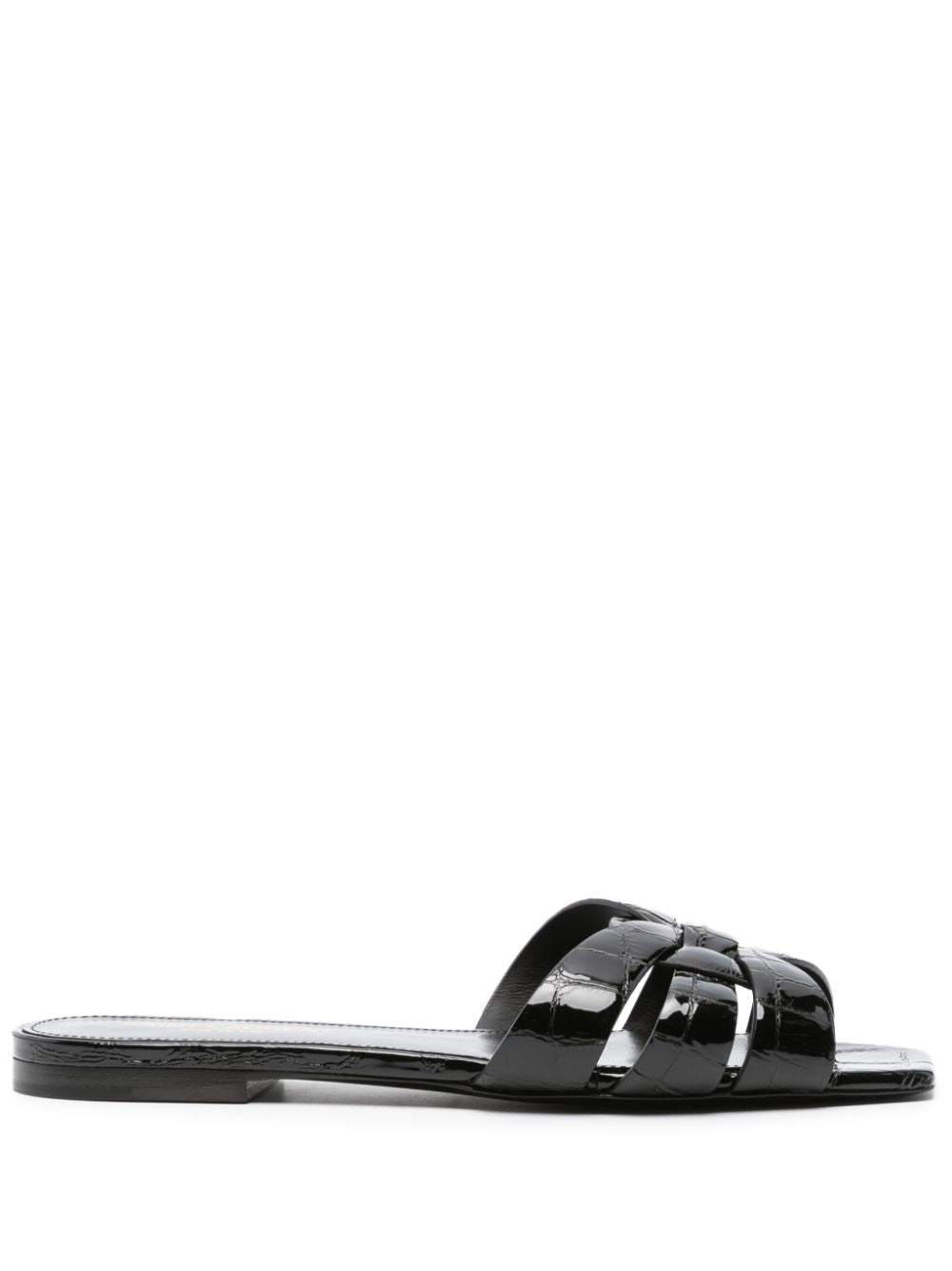 Tribute embossed-crocodile leather slides from SAINT LAURENT featuring black, calf leather, embossed crocodile effect, crossover strap at the toe, square open toe, slip-on style, branded leather insole and flat leather sole.