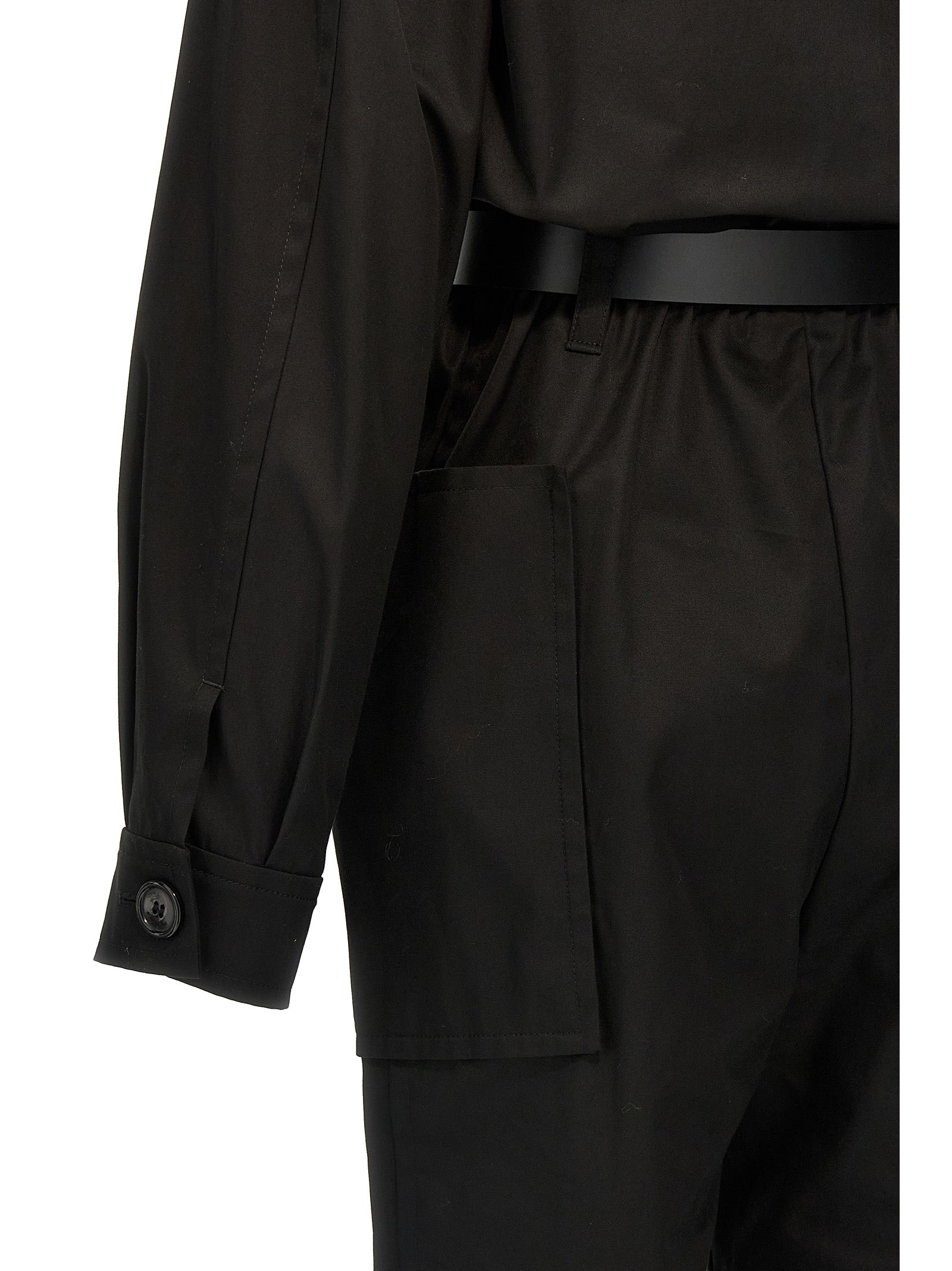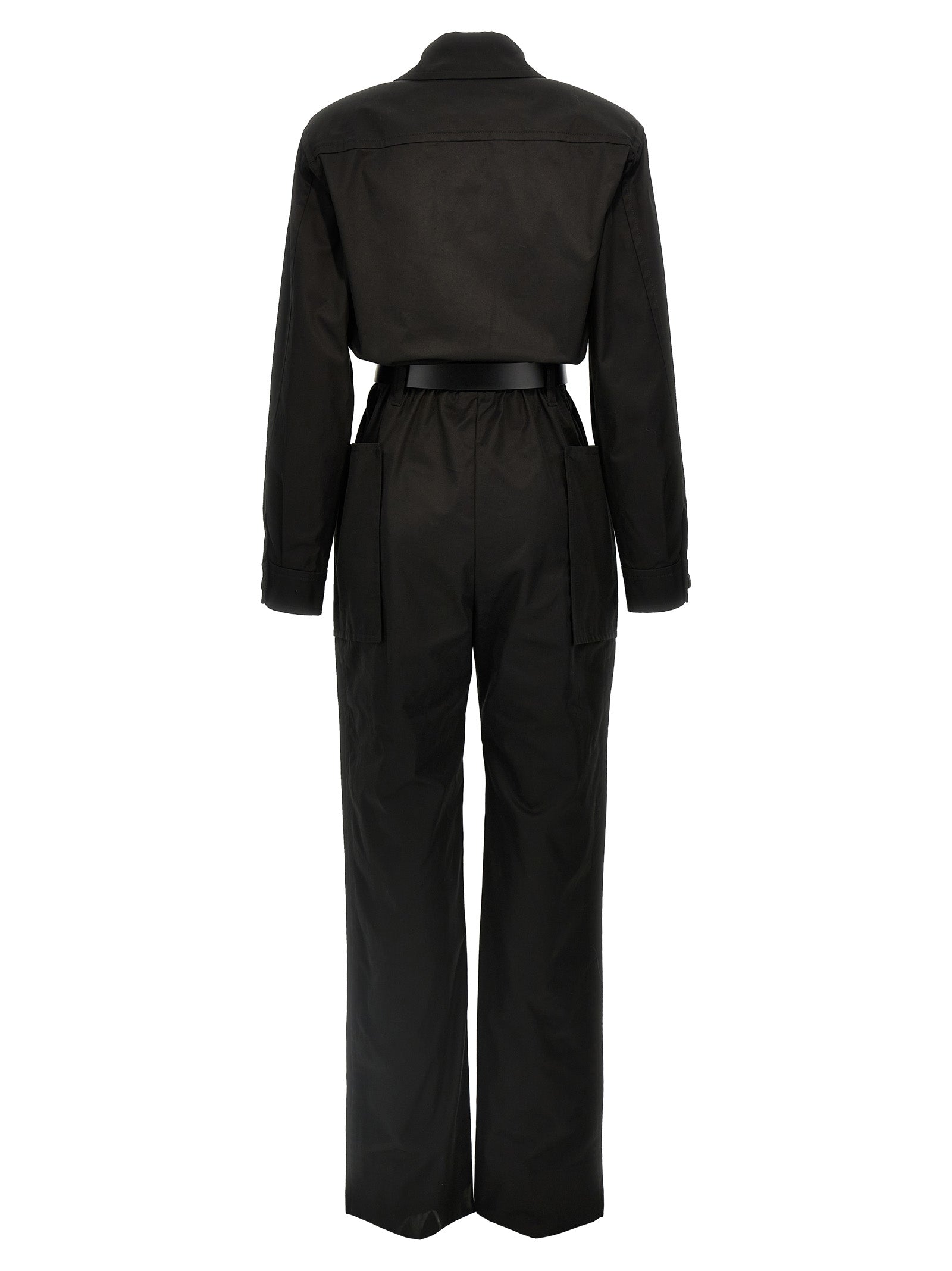 Cotton twill one-piece jumpsuit with front zip closure, pockets, leather belt at the waist, long cuffed sleeves.