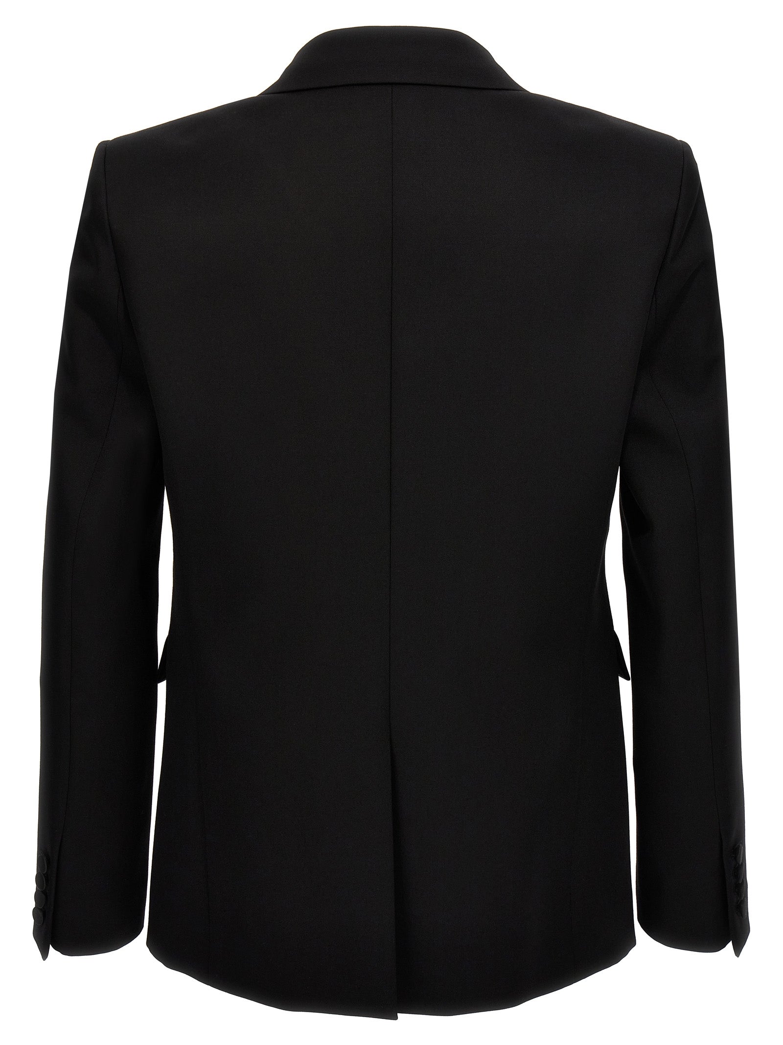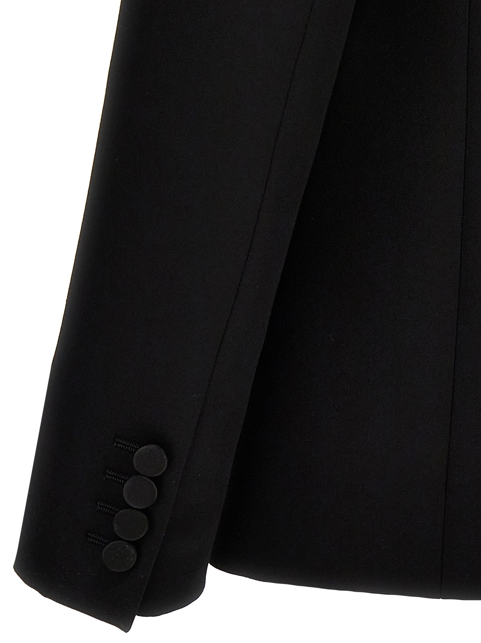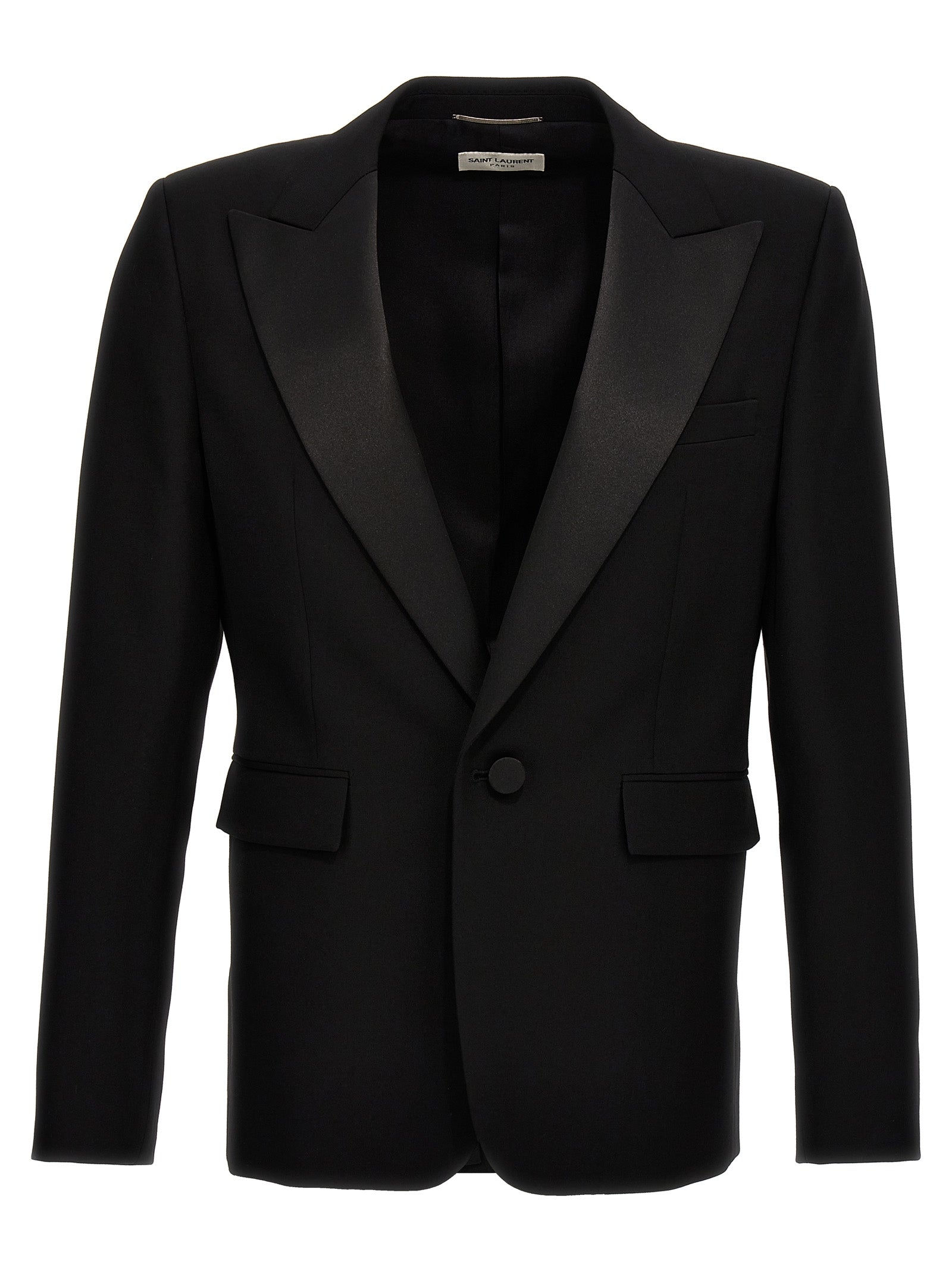 Tuxedo single-breasted blazer in grain de poudre wool with button closure, pockets, long sleeves, back vent.