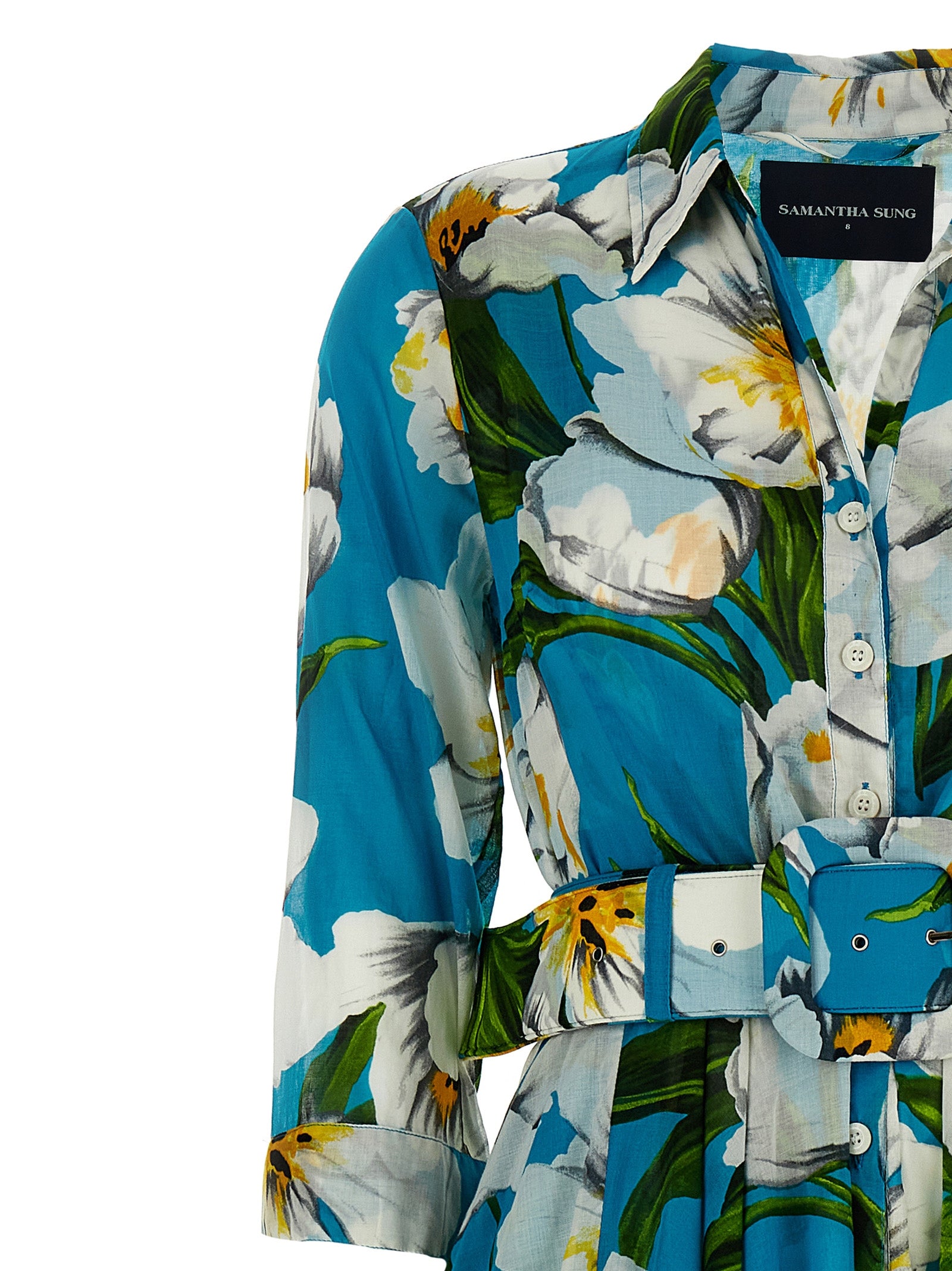 All-over print cotton muslin 'Aster' midi dress, chemisier style with front button closure, 3/4 sleeve, full skirt, underskirt, pockets, removable matching belt and sash.