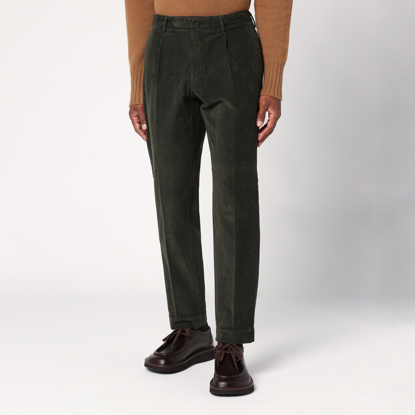 Dark green corduroy Santaniello trousers featuring a front fastening, waist loops, two side welt pockets and two back welt pockets with flap and button fastening.