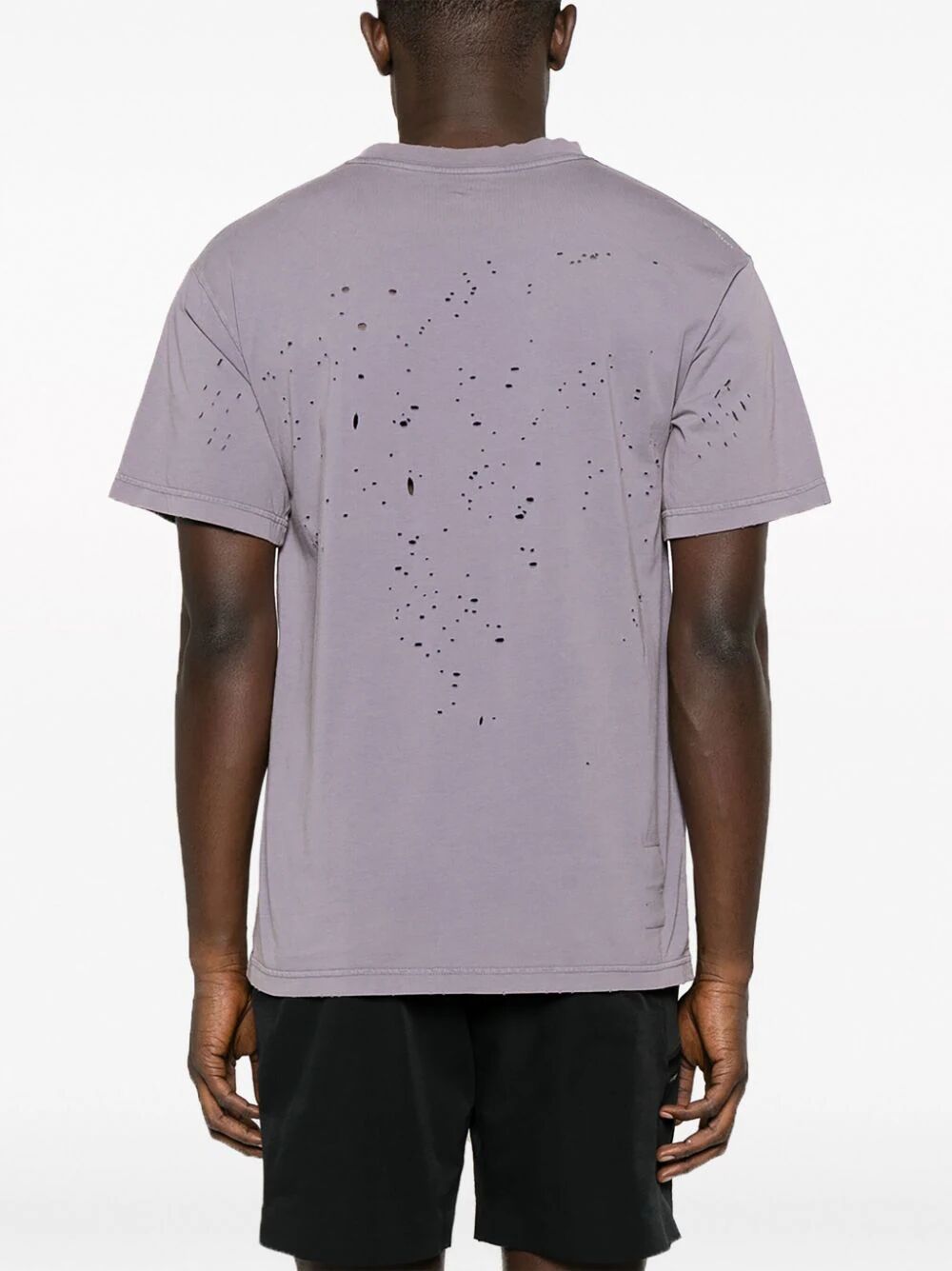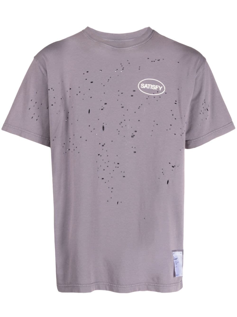 Mothtech organic-cotton T-Shirt from SATISFY featuring light purple, organic cotton, jersey texture, distressed effect, logo print to the front, logo print to the rear, crew neck, short sleeves and straight hem. This item is made from at least 50% organic materials.. Learn more about what makes a product Conscious on our Conscious Criteria page.