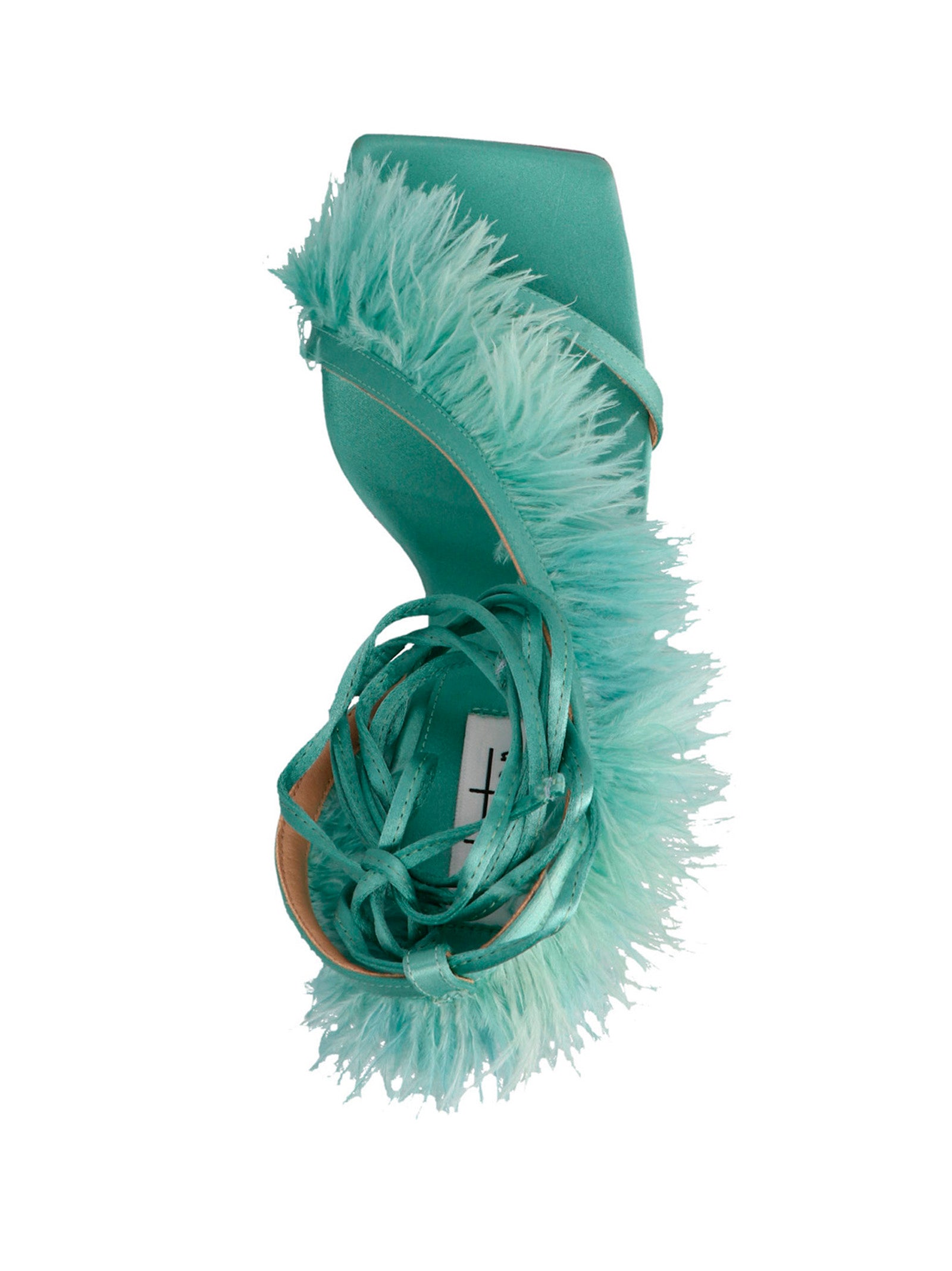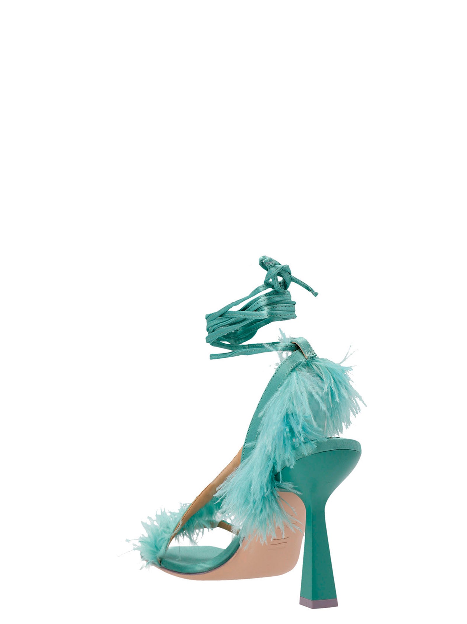 ‘Feather Wrap' satin sandals with feather appliqués, and ankle laces, a squared toe and a sculpted heel.