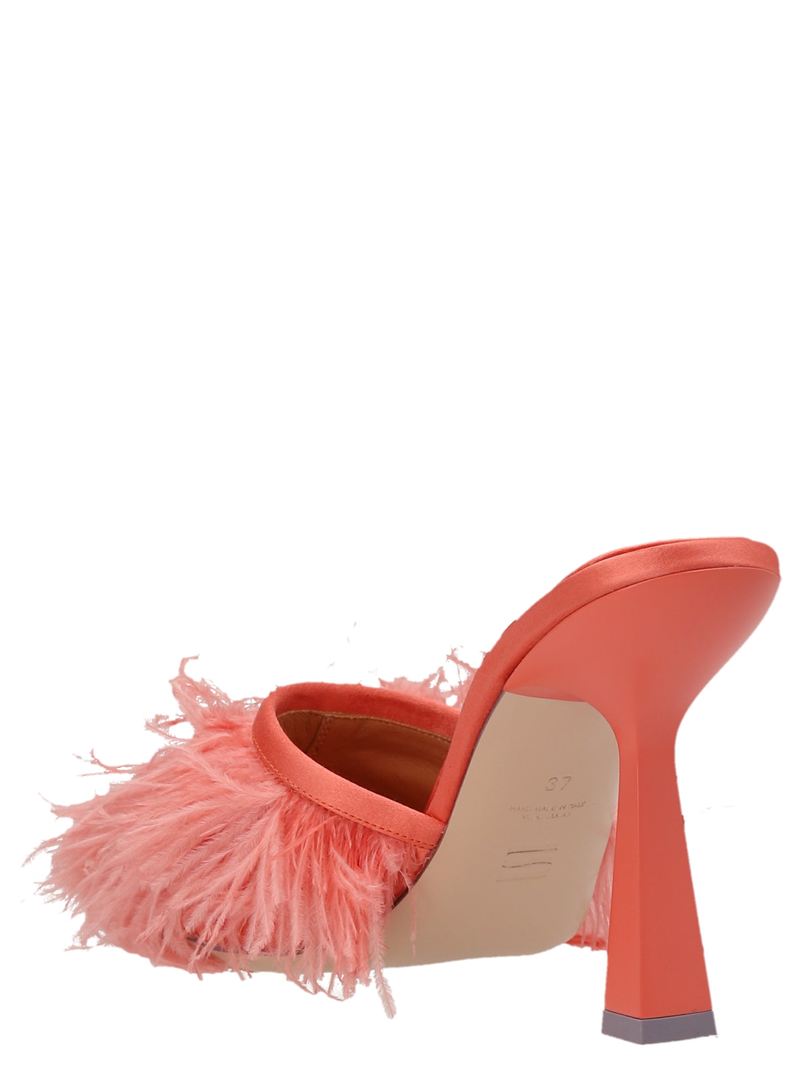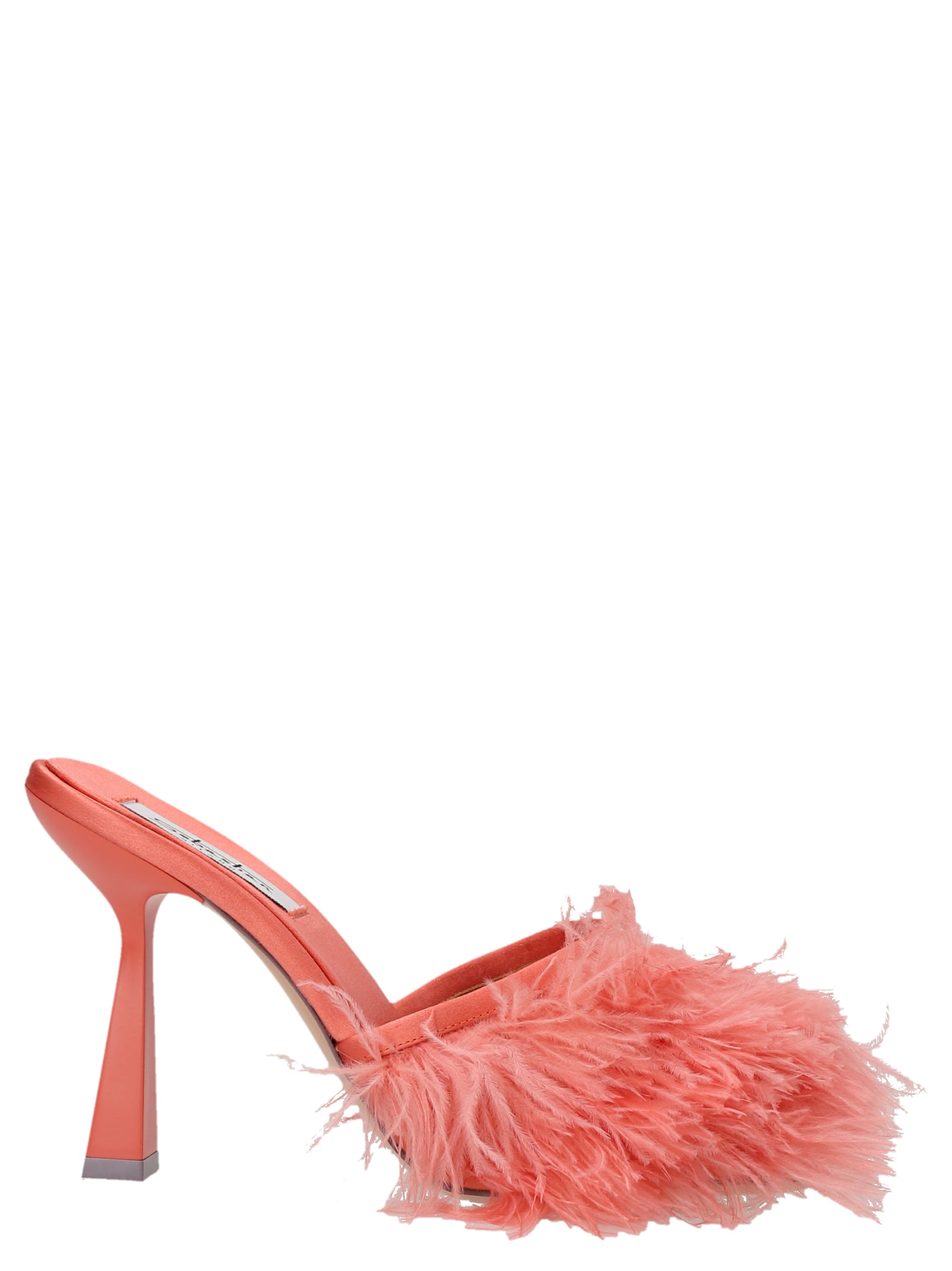'Ross' satin mules with ostrich feather appliqués and sculpted heel.