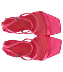 Sergio Levantesi Telen sandal crafted in fuchsia satin, featuring a slightly squared toe and ankle strap. Leather insole and leather sole with spool heel, height 10 cm.