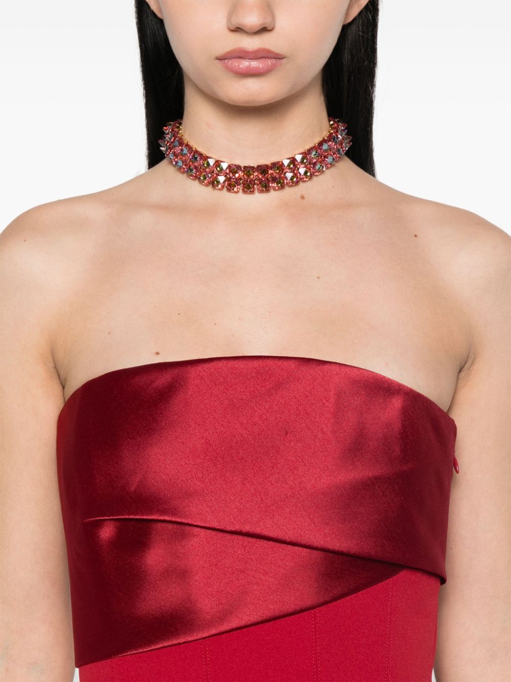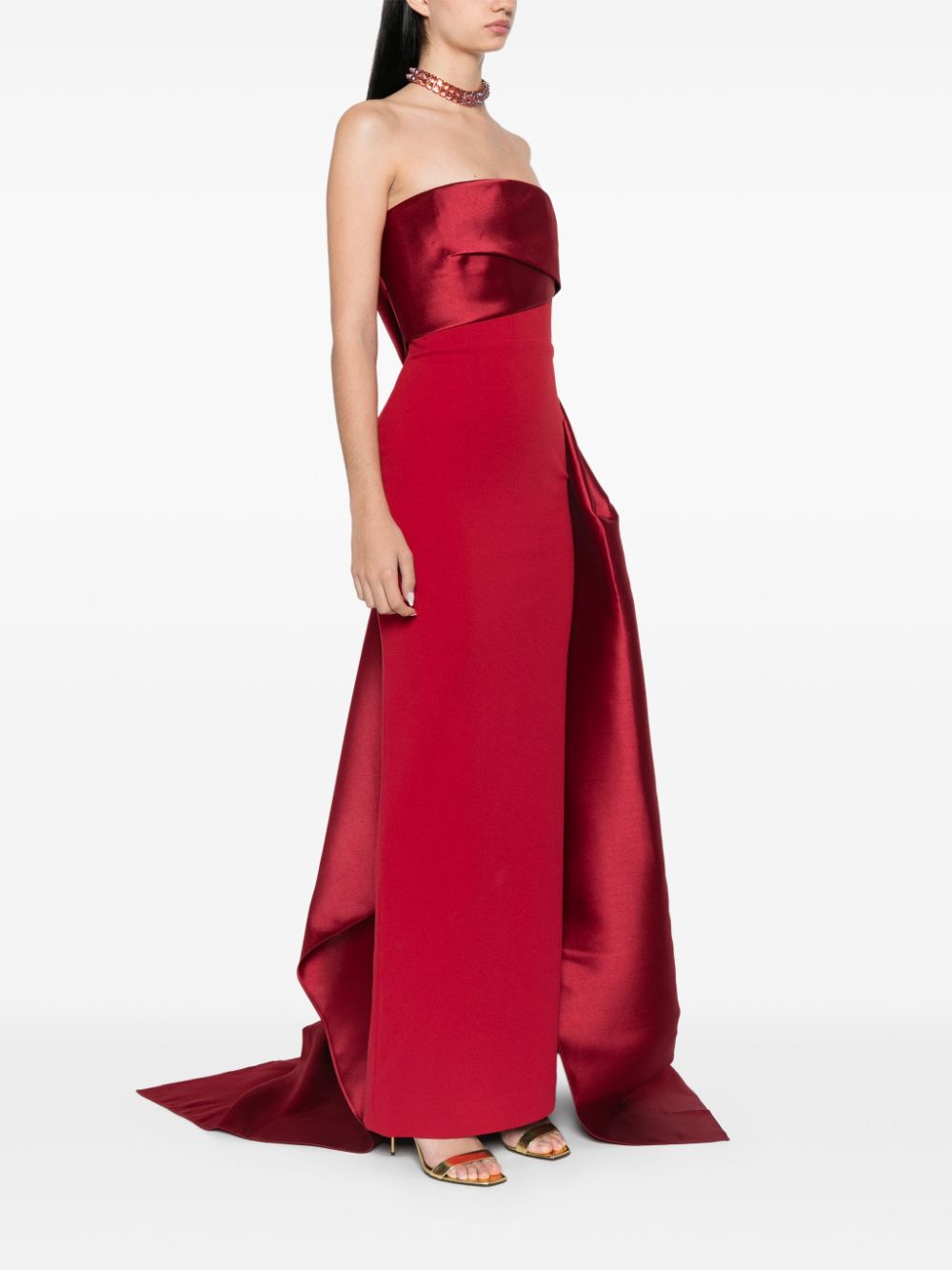 Ruby red, hidden back zip closure, off-the-shoulder design, pleated details and train.
