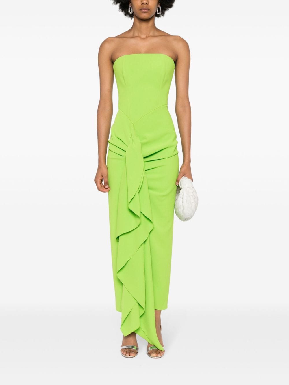apple green crepe texture strapless boned bodice fitted waistline ruffled detailing to the front ruched detailing front slit ankle-length straight hem concealed rear hook and zip fastening