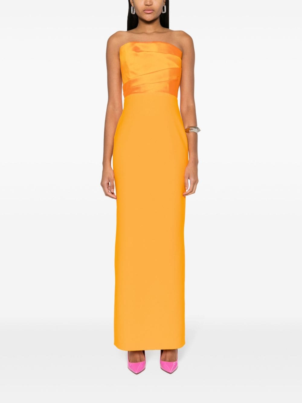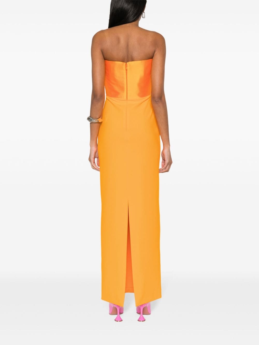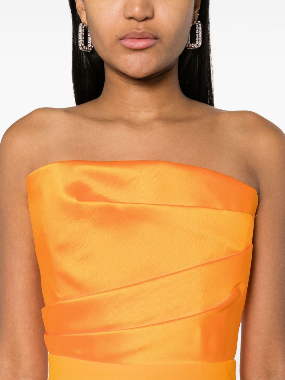 tangerine orange stretch-design duchess satin weave/crepe texture panelled design strapless draped panel detail pleat detailing to the side boned bodice full-length straight hem rear slit full lining concealed rear hook and zip fastening