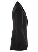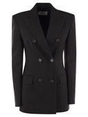 A double-breasted blazer with a tailored construction, made of pure natural stretch wool canvas. The lance lapel neckline, diagonal breast pocket and flap pockets are male-inspired, while the double darts design the silhouette emphasising femininity. Buttoned cuffs, inner lining and below-the-waist length. - Tight fit at the hips - Button fastening - Double breasted DESIGNER ID: 2422046061600 004
