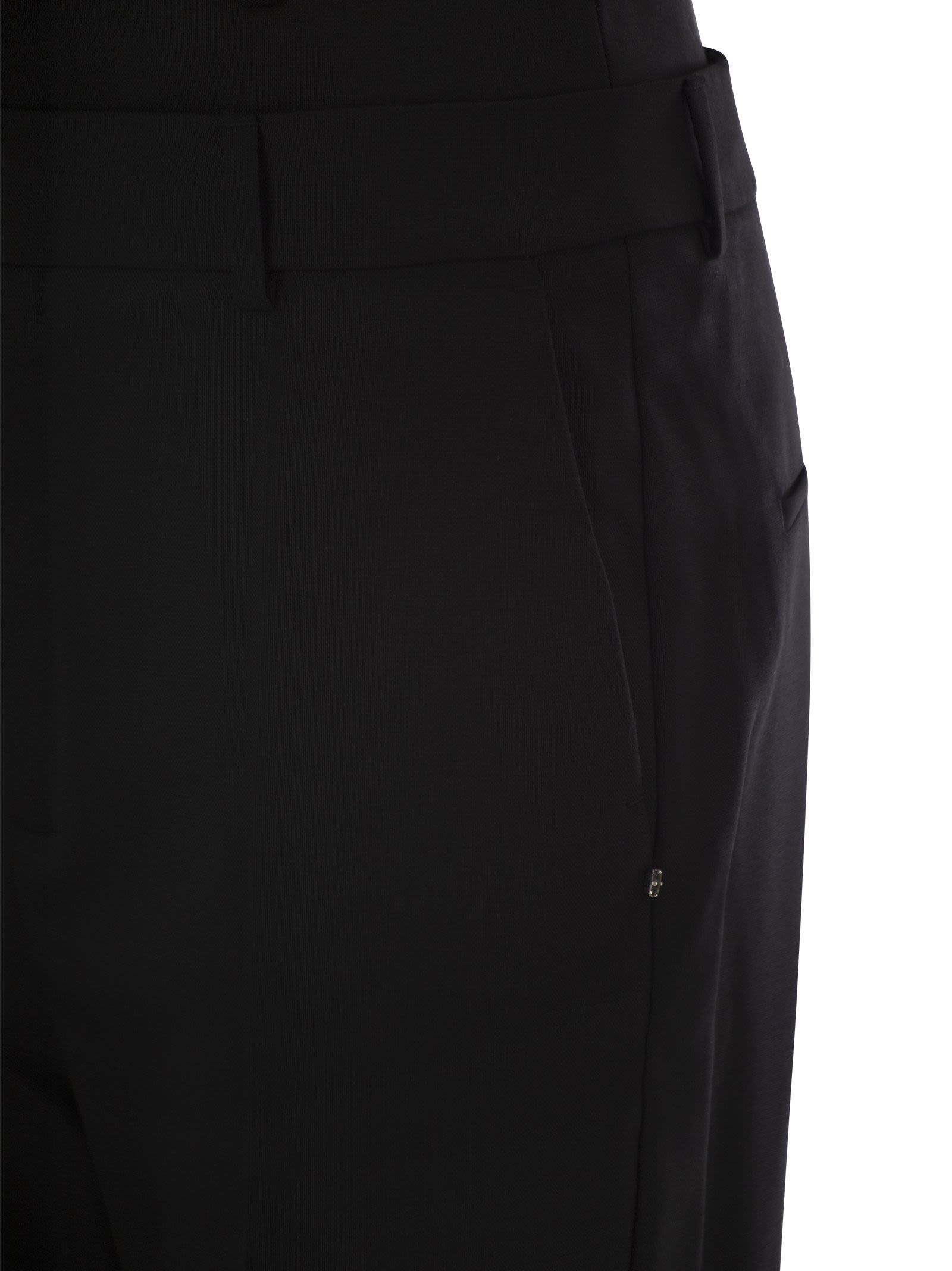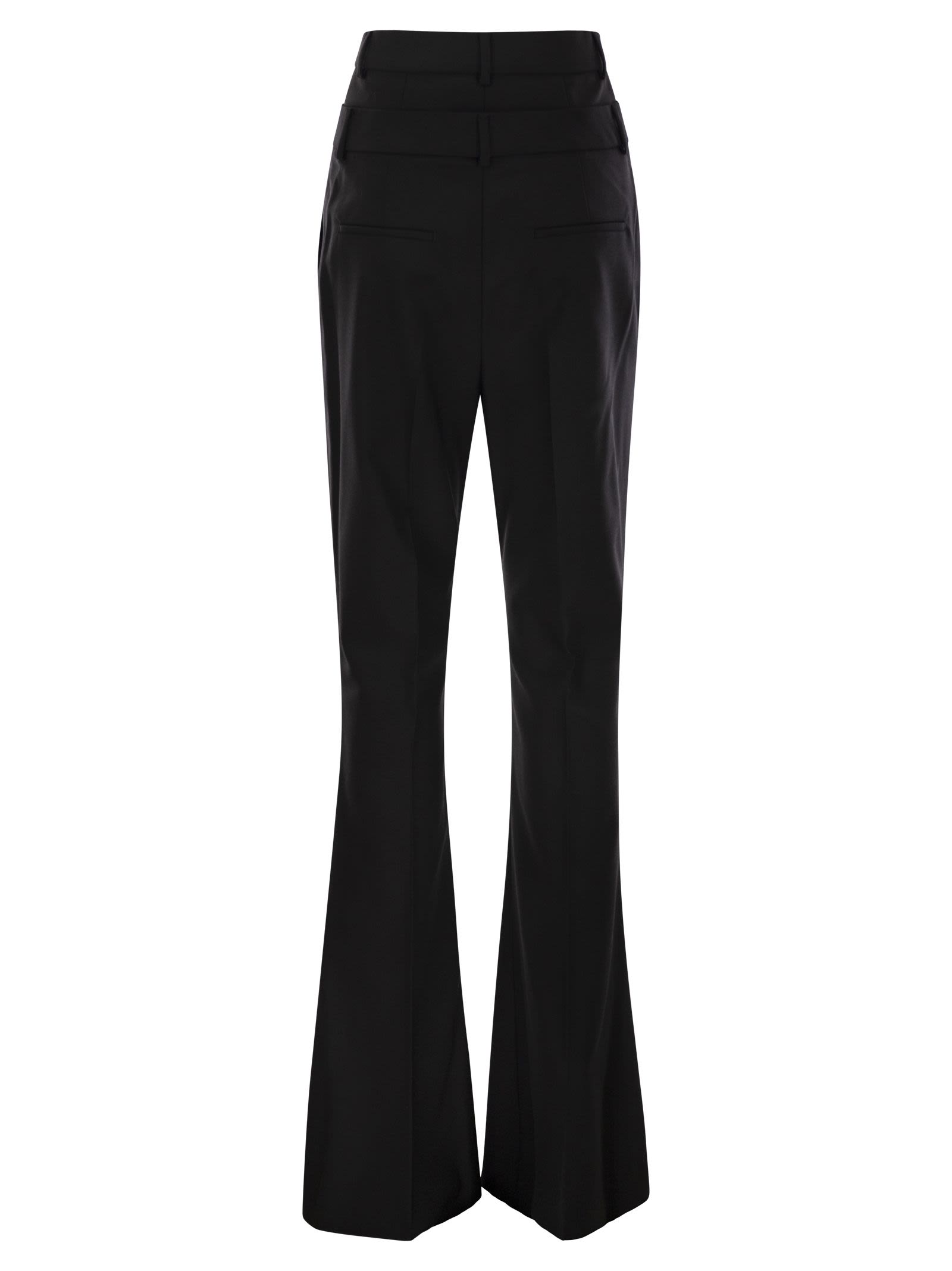 Tailored trousers in pure natural stretch wool canvas, with masculine inspiration and double lacing at the waist for an overlapping effect. The fit remains soft on the leg, with a front and back pleat that emphasises the flare line at the bottom. French and welt side pockets at the back. - Stretch crease at front - Flare line - Side pockets DESIGNER ID: 2422136072600 003