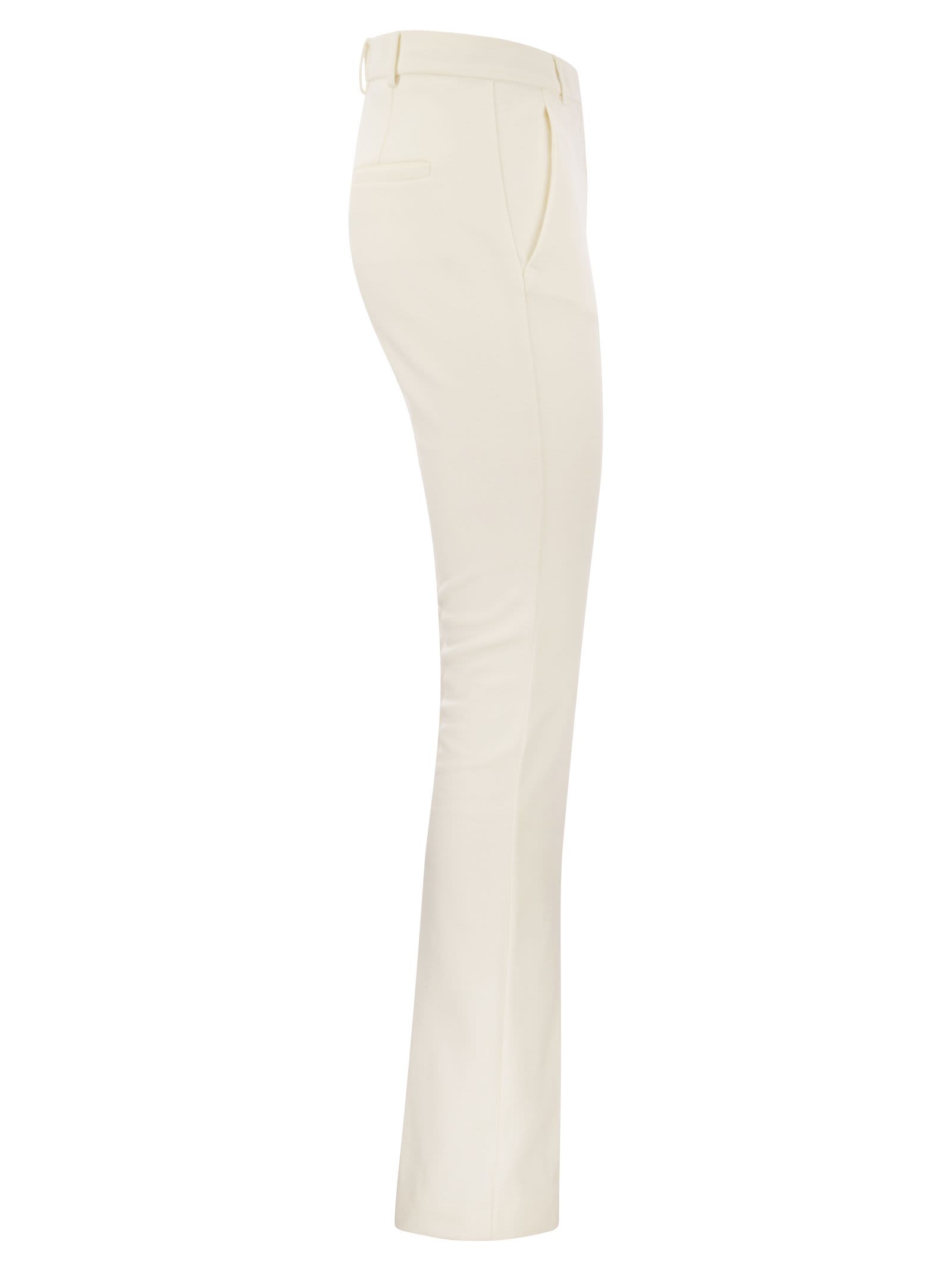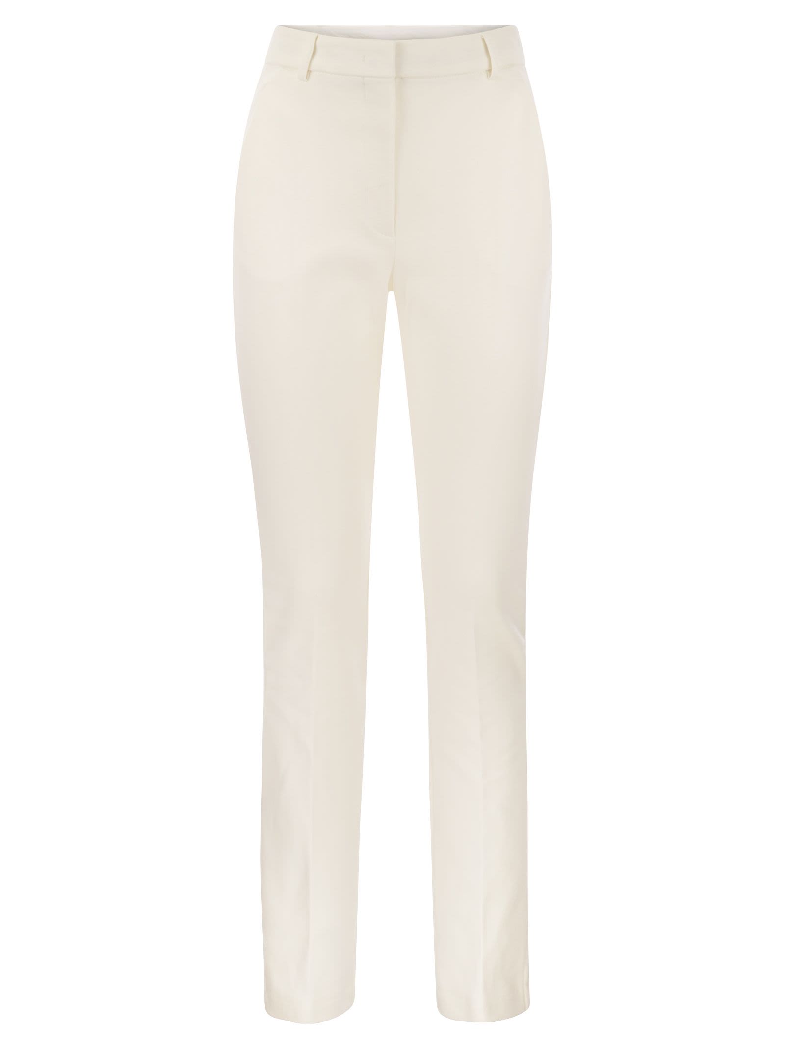 Trousers made of pure cotton jersey with Milano stitch work, for a compact and elegant effect. The construction is masculine, with a covered hook at the waist and a pre-constructed inner belt like the tailored models. The fit is slim, with straight legs emphasised by the ironed crease at the front and back. - Hip and welt pockets on the back - Slim fit DESIGNER ID: 2412781031600 001