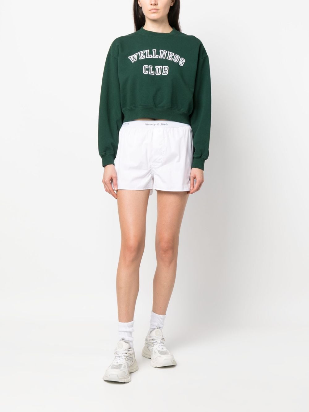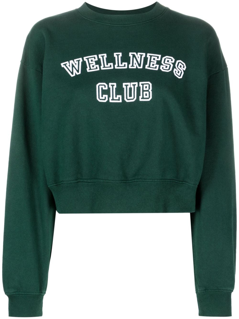 Wellness Club cropped cotton sweatshirt from Sporty & Rich featuring forest green, optical white, cotton, slogan print to the front, flocked finish, logo print to the rear, crew neck, drop shoulder, long sleeves, ribbed cuffs and hem, straight hem and cropped.