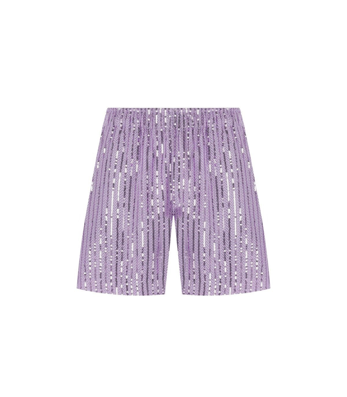 Stine Goya Anne shorts made of recycled lilac polyester fabric, covered in tonal sequins. Elasticated waist, pockets on the sides, and small side slits. This item runs large, we recommend purchasing a size smaller than usual. The model is 174 cm tall and wears size XS. Composition: 100% recycled polyester.