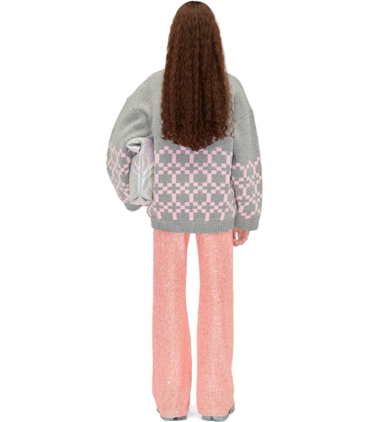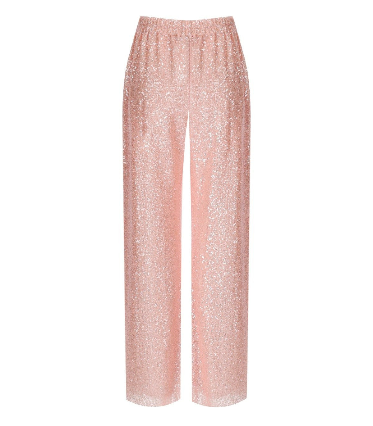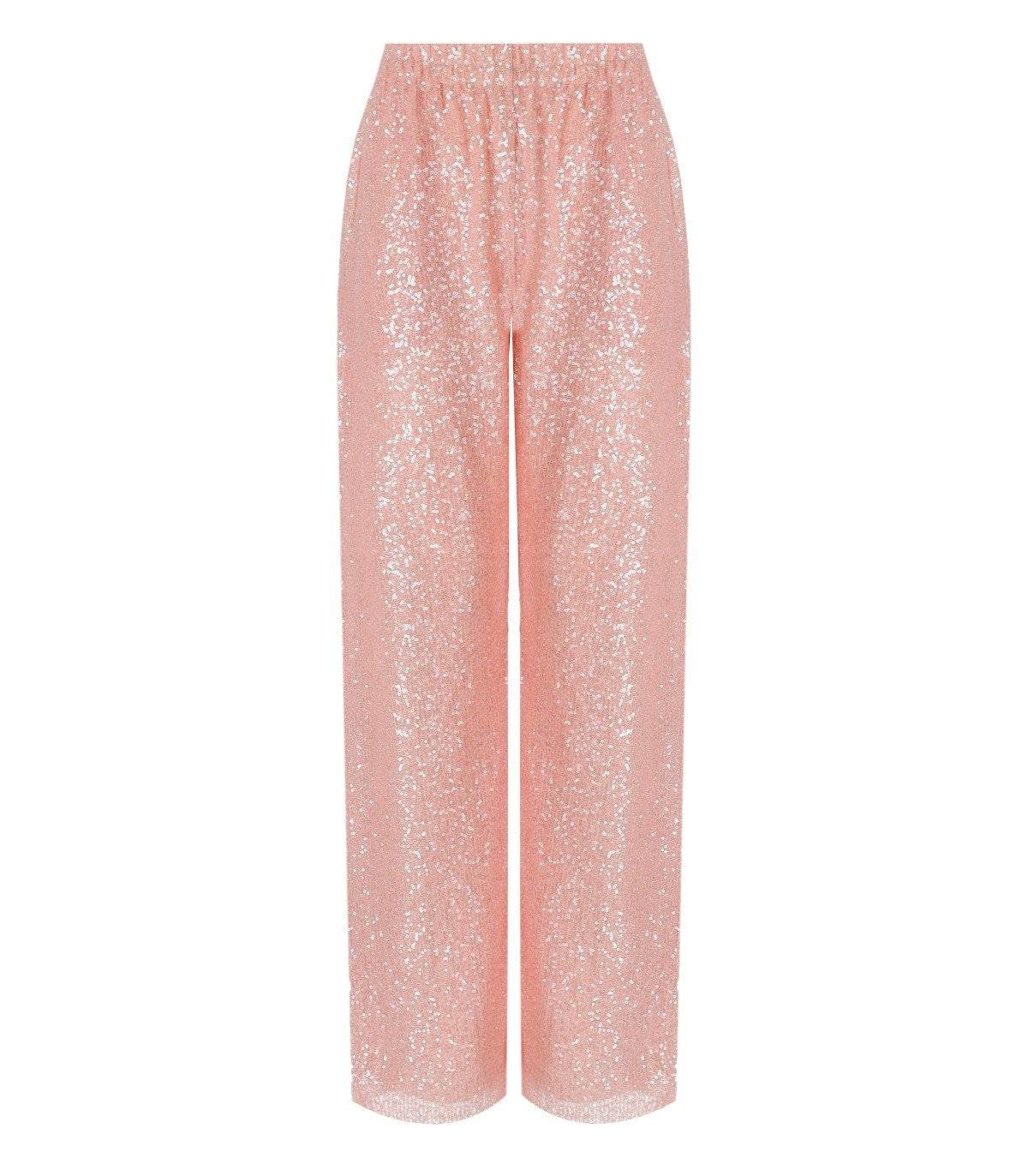 Fatou trousers by Stine Goya made of recycled polyester fabric covered with sequins in shades of pink, featuring an elasticated waist, straight and soft leg. The model is 176 cm tall and wears size XS. Composition: 65% recycled polyester, 35% polyester. Lining: 100% polyester.