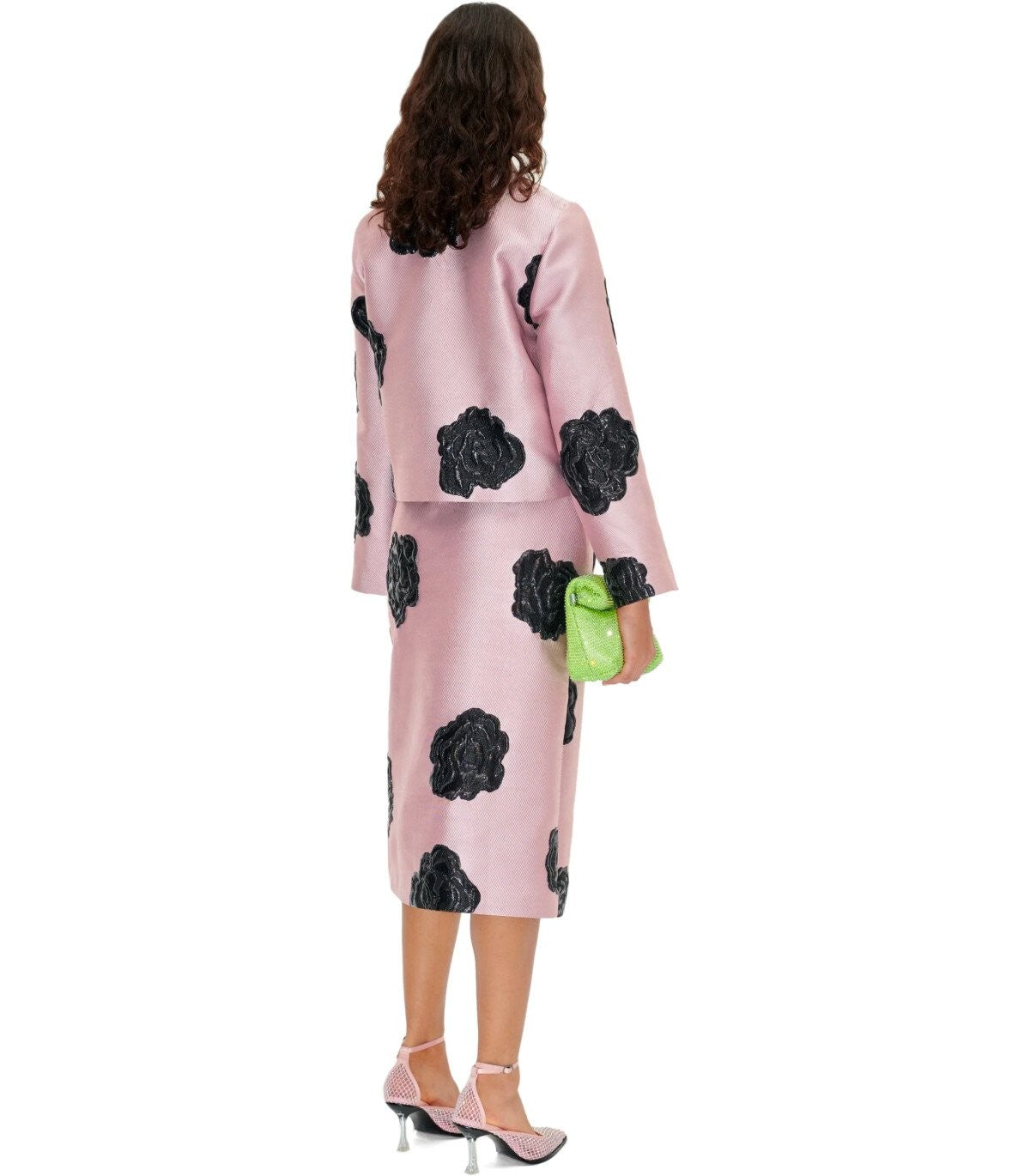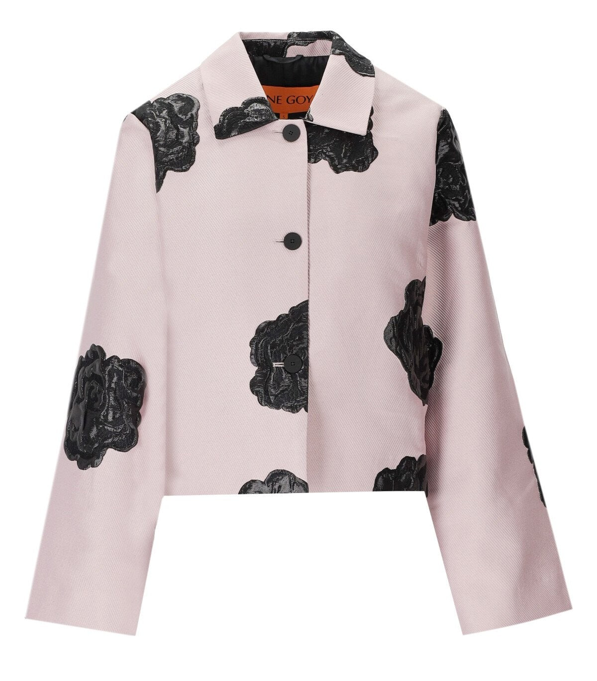 Stine Goya Kiana jas made of old pink polyester blend, decorated with embroidered black roses. Interior with logoed lining and button closure. Loose fit. Depending on the fabric cut, the pattern may vary slightly from piece to piece. The model is 178 cm tall and wears size XS. Composition: 60% polyester, 21% metallic material, 13% polyamide. Lining: 100% recycled polyester.