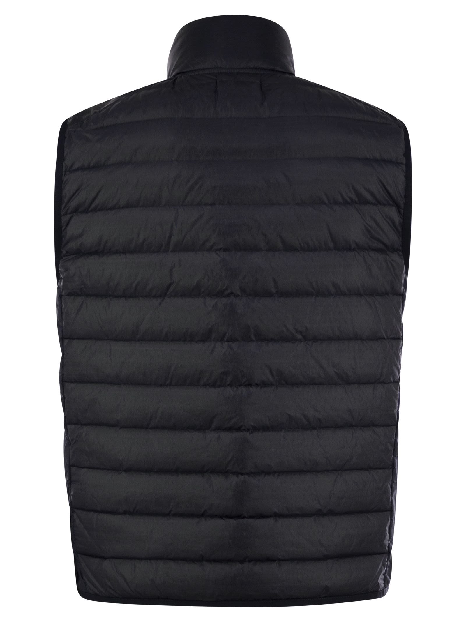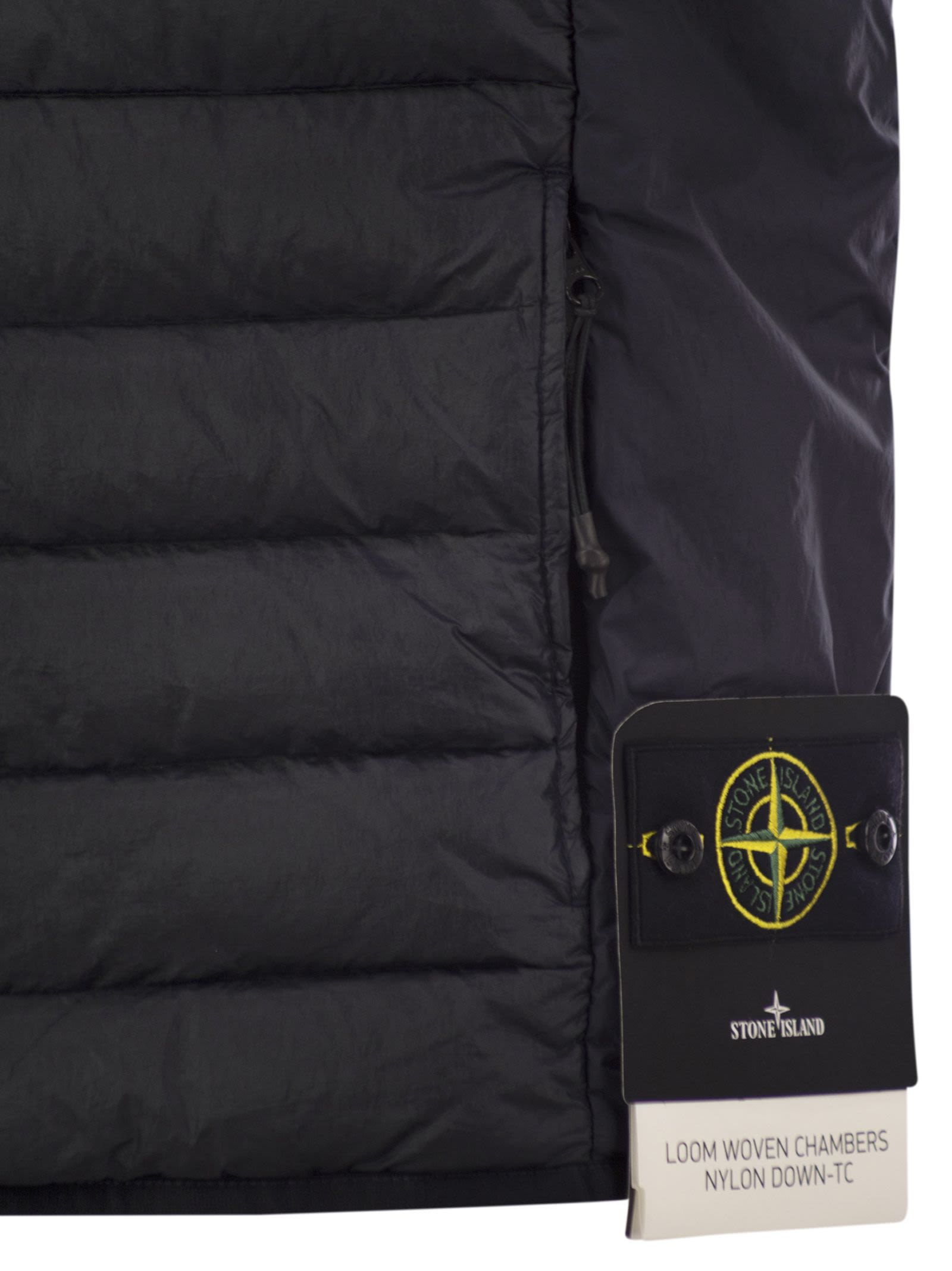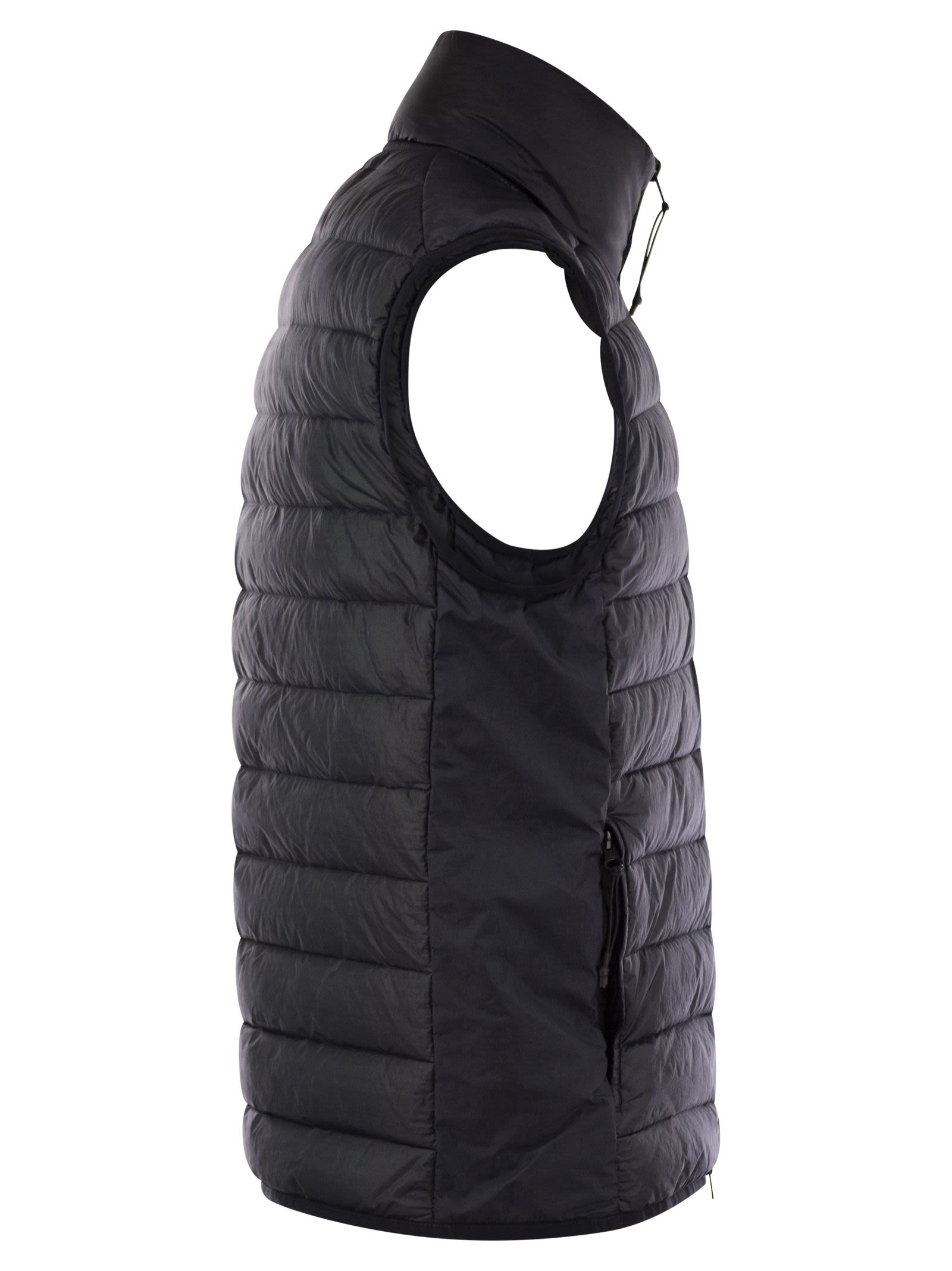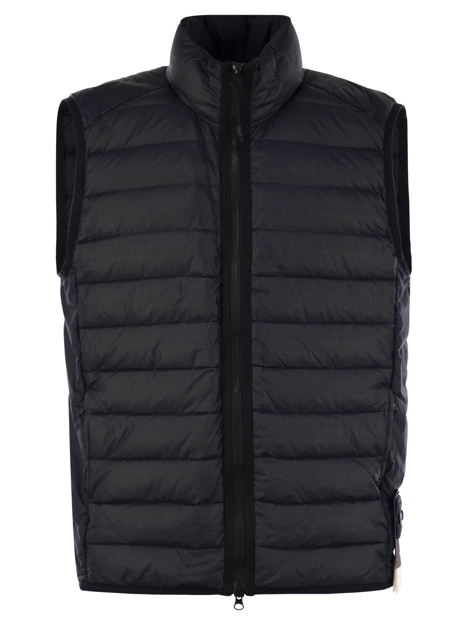 Nylon Metal waistcoat with ECONYL® regenerated fibres and filling with the finest feathers. Garment-dyed model with a double dye recipe and the addition of a anti-drip agent. - Zip fastener - Stone Island badge on the left side - Sleeveless DESIGNER ID: K1S15G100007S0024 V0020
