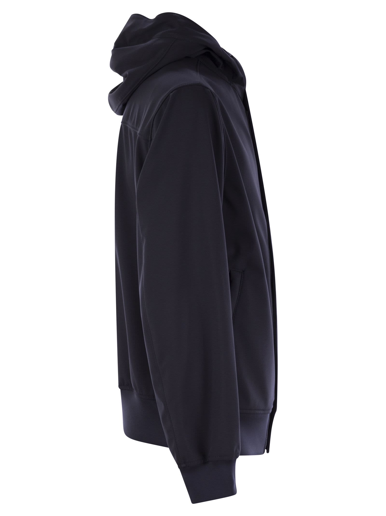 Hooded jacket in three-layer technical material with an 8000 mm water column. The stretch polyester canvas outer surface is woven with e.dye® Waterless Color System™ technology, the innovative yarn colour saturation system. The fabric is laminated to a breathable, water- and wind-resistant inner membrane, protected by a backing layer of textured polyester jersey. The outer structure of the material gives the garment unparalleled comfort and flexibility. - Hood with drawstring - Double-slider zip - Snap fastener DESIGNER ID: K1S154100090S0A22 V0020
