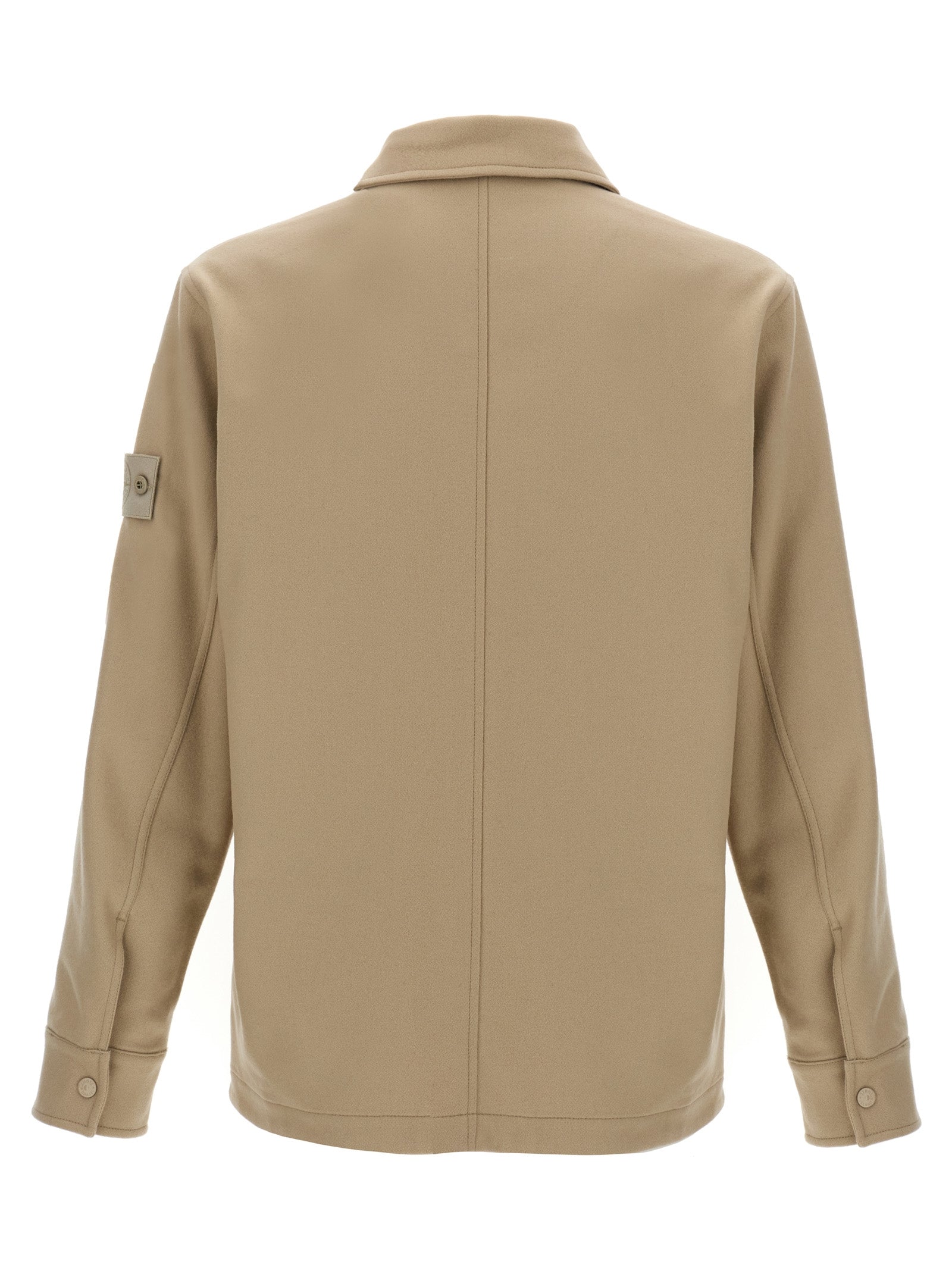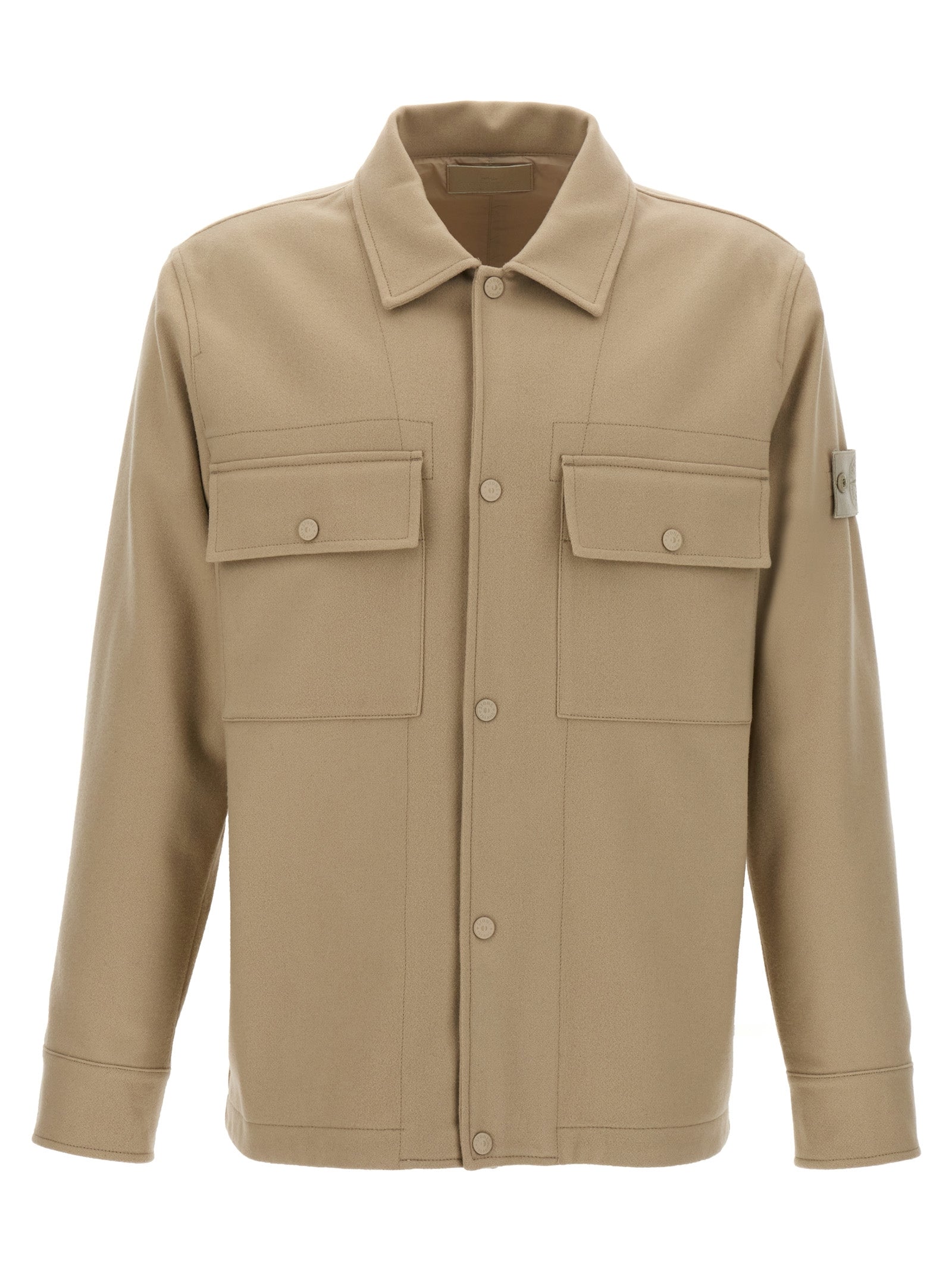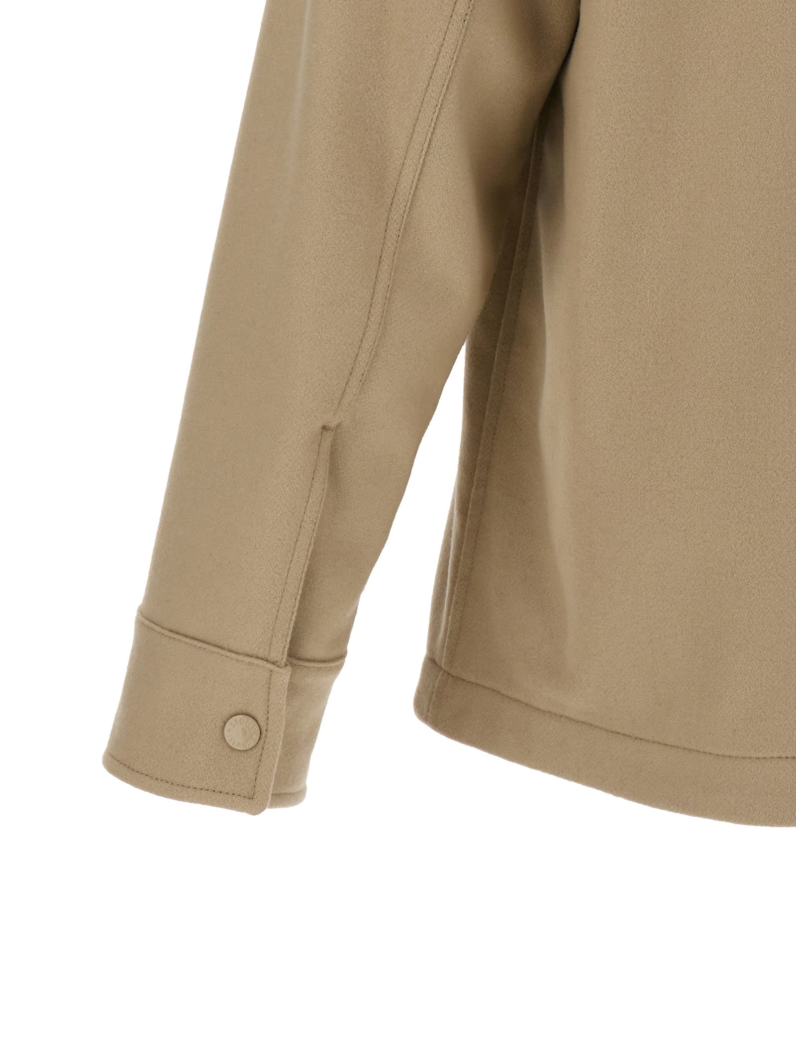 Wool blend overshirt, nylon lined interior, logo badge on the sleeve, button closure, front pockets, long cuffed sleeves.