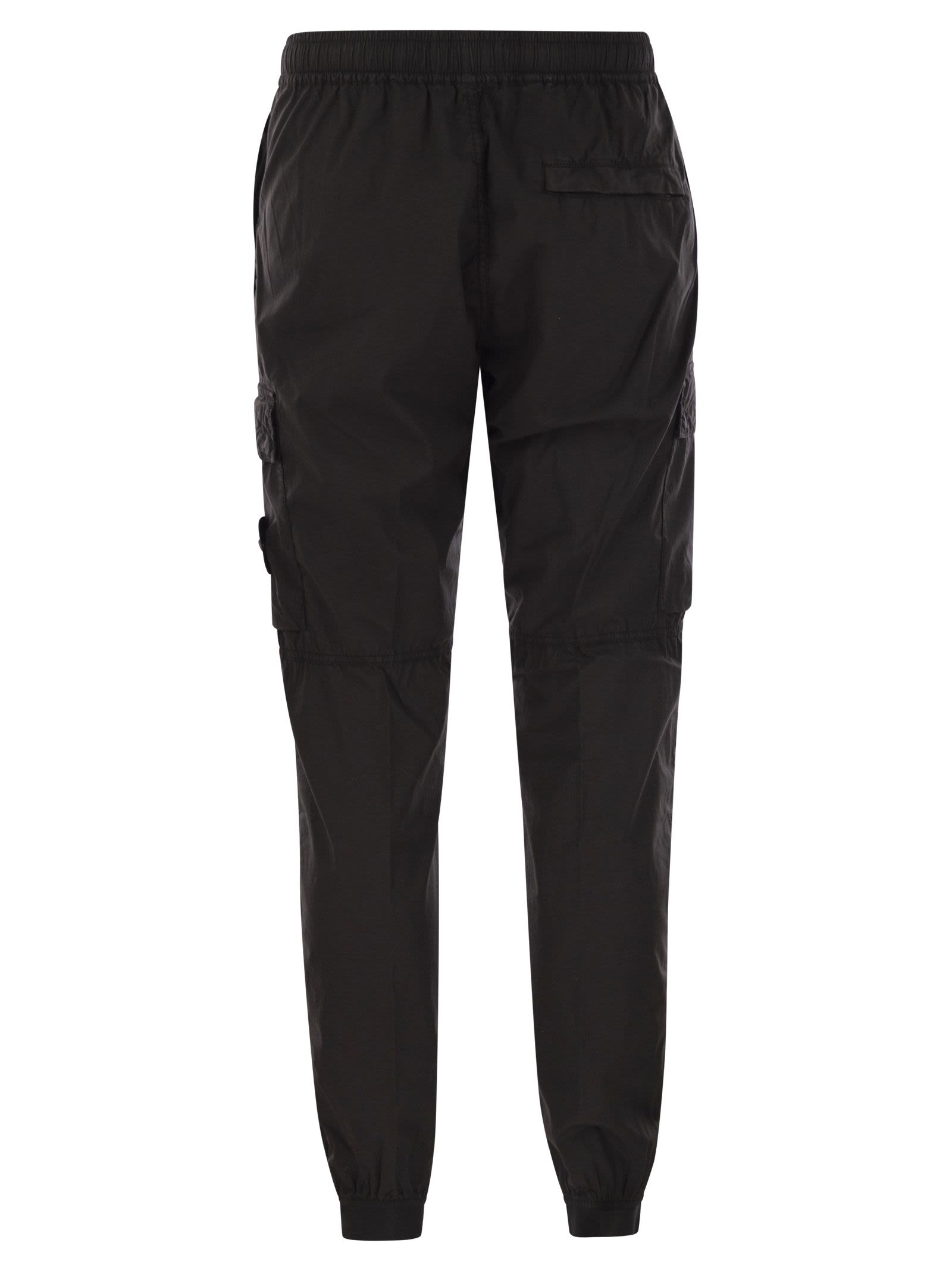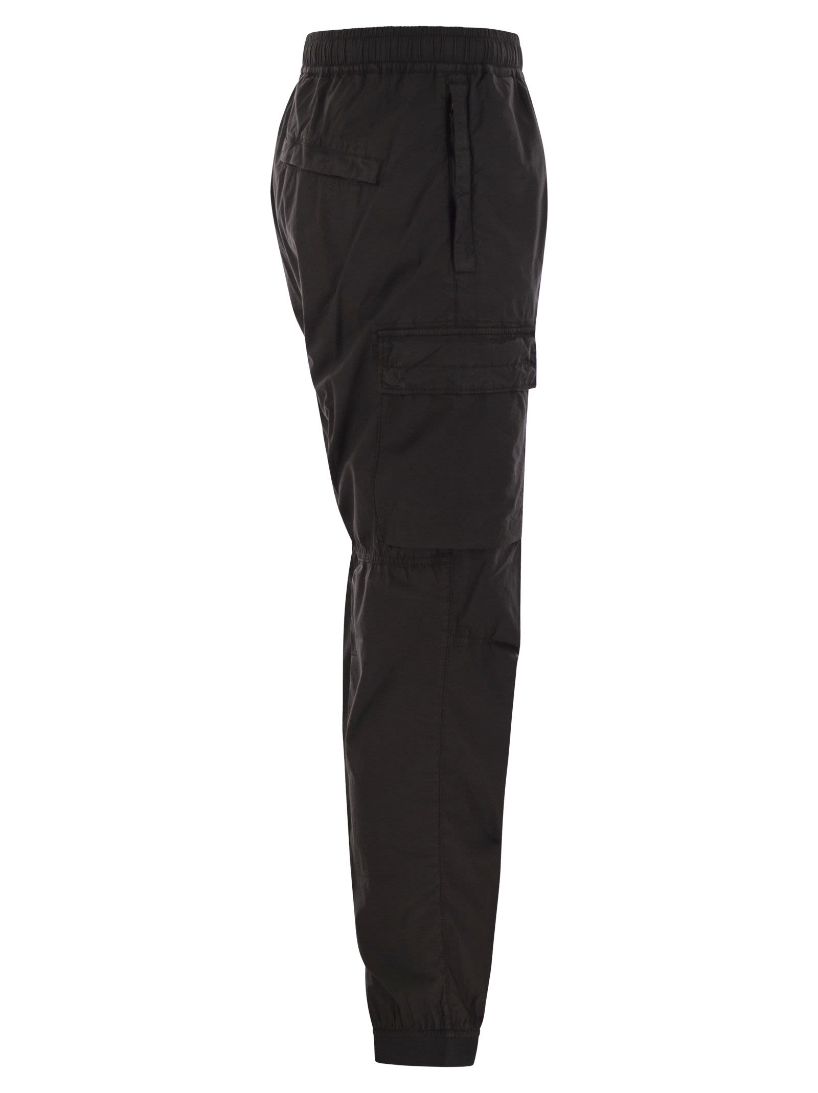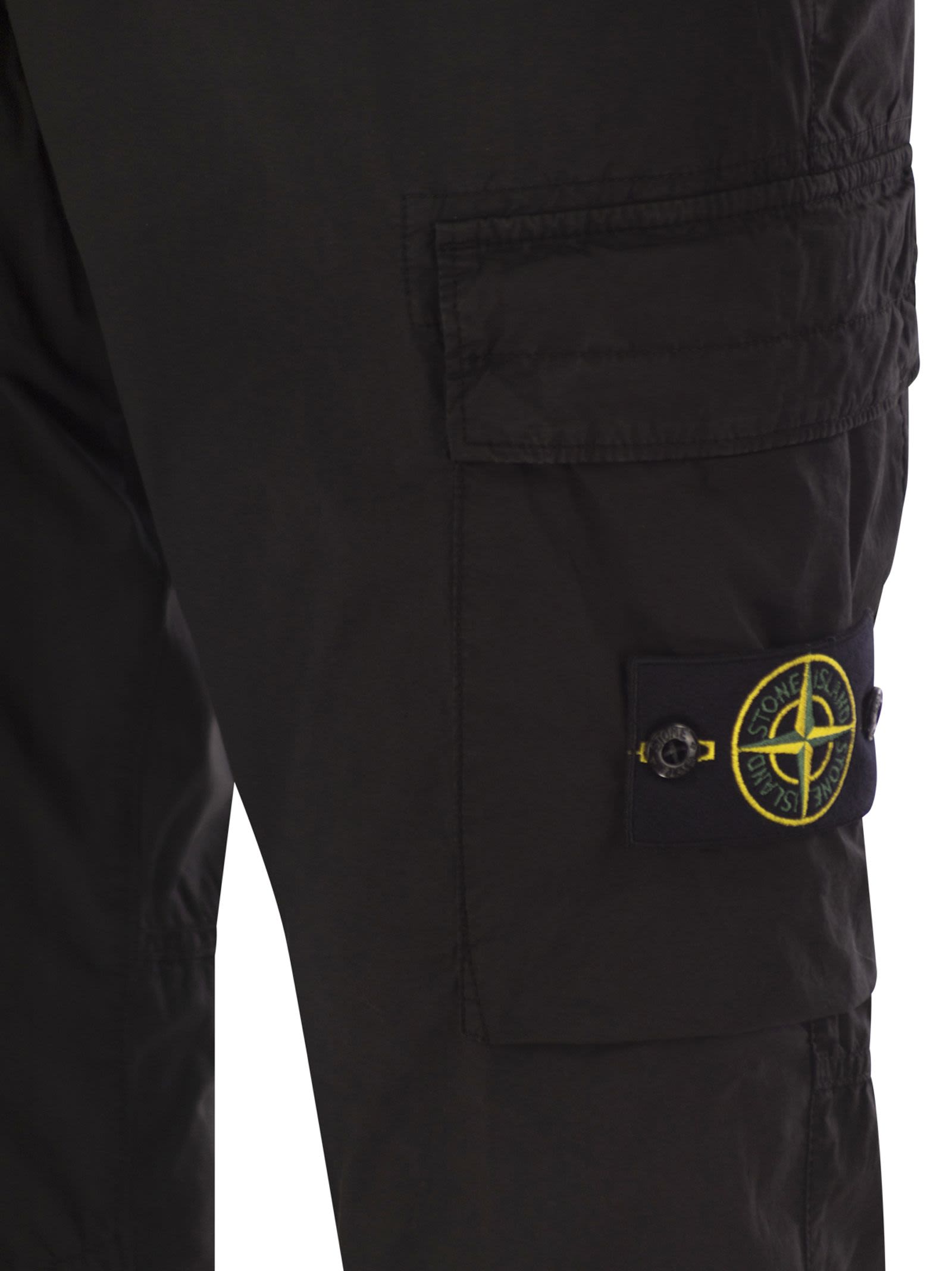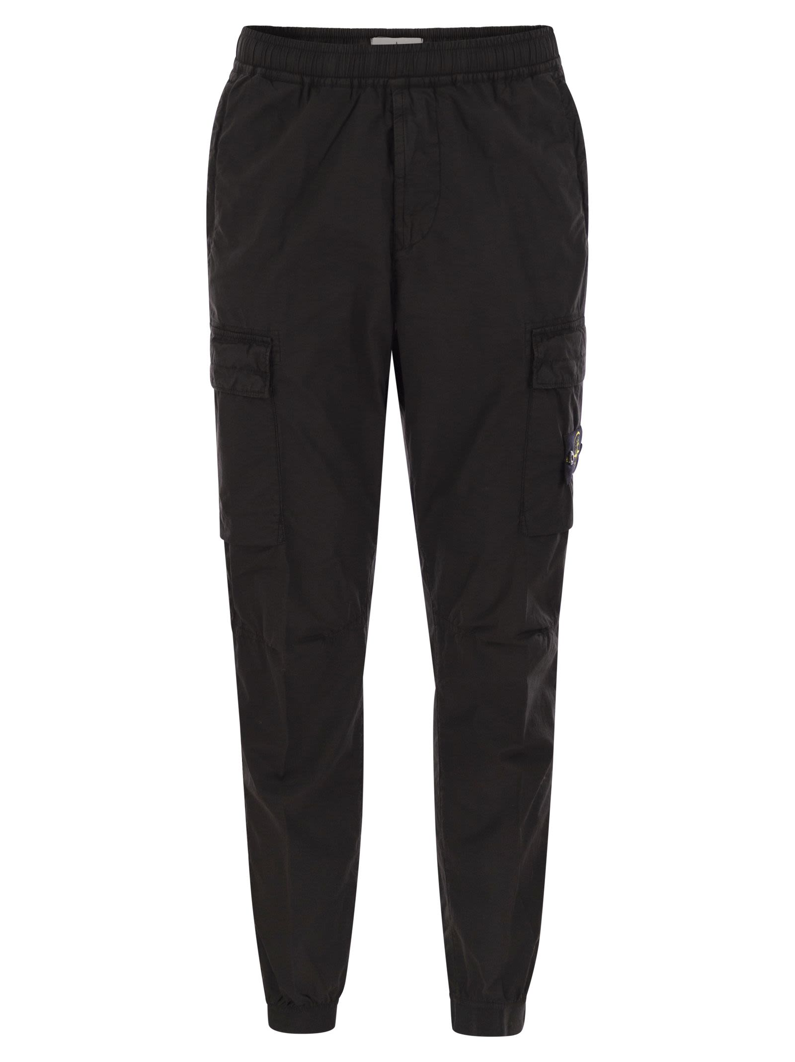 Cargo trousers in lightweight stretch cotton canvas with standing pockets with concealed zip. One back slit pocket with concealed snap button. Bellows leg pocket with flap and concealed snap button; Stone Island badge on the left pocket. Leg bottoms with elasticated tape. Elasticated waistband with internal drawstring. - Zip flap - Regular tapered fit - Garment dyed DESIGNER ID: K1S153100031S0003 V0029