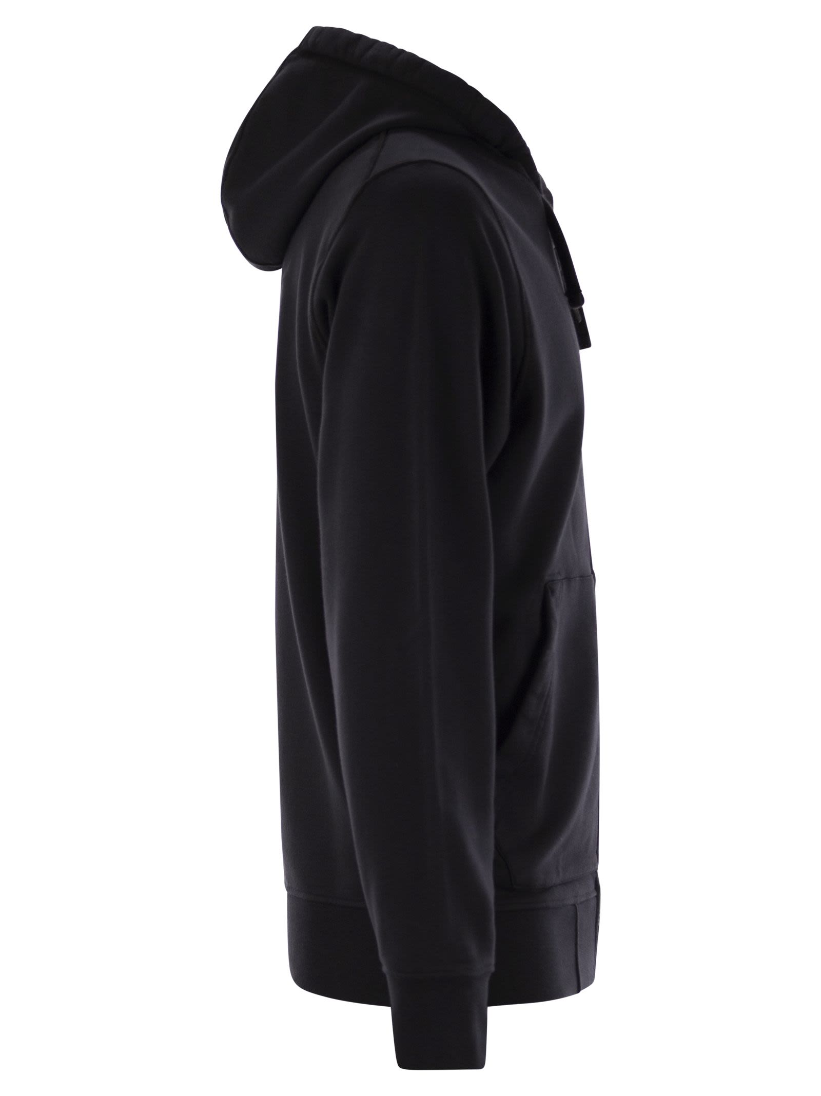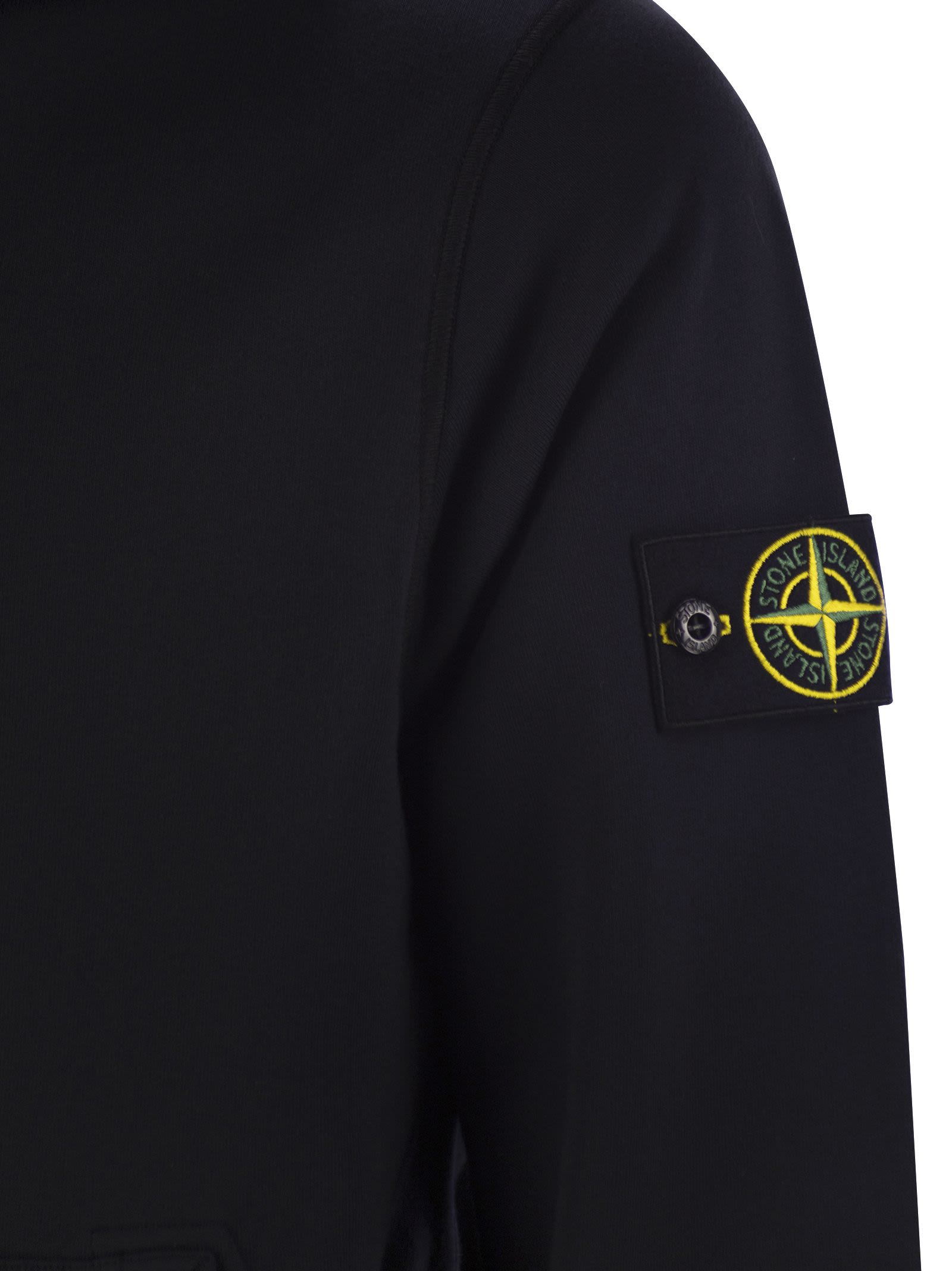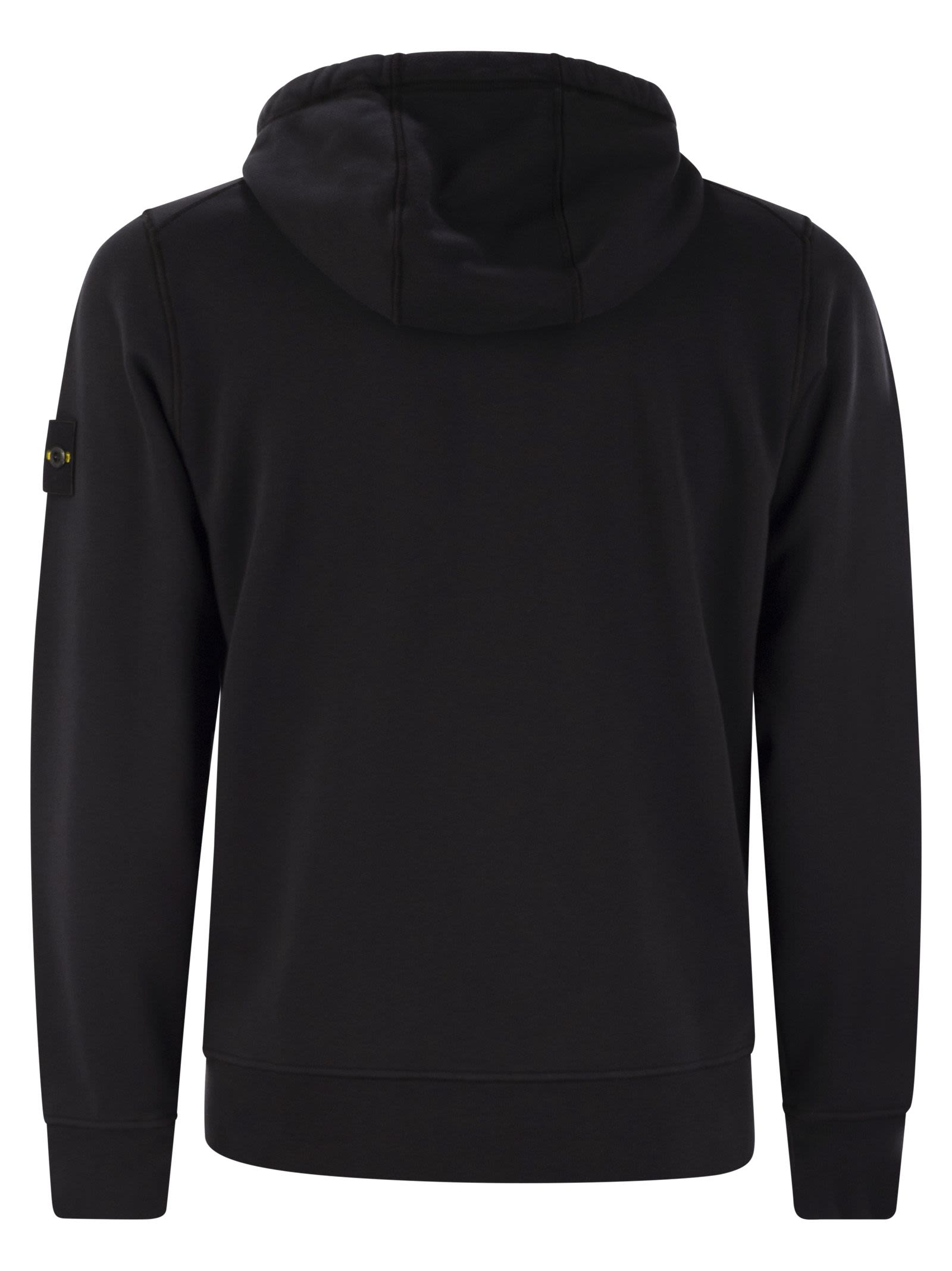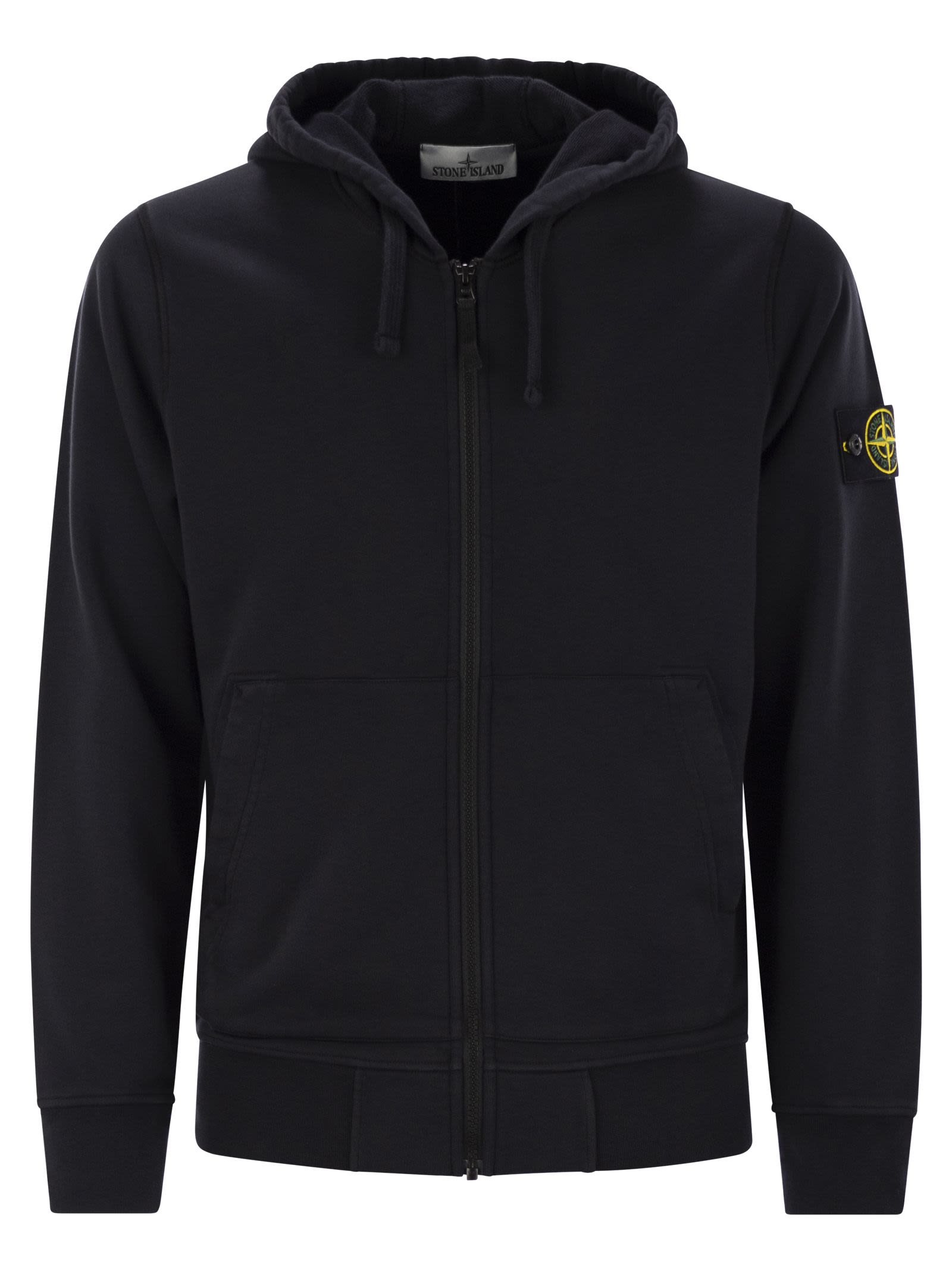 Organic cotton fleece sweatshirt with full-length zip, shaped drawstring on hood, slanted patch pockets. Stone Island badge on left sleeve. Overlock stitching on hood, shoulders, armholes and sides. Bezel with inner lining under the back neckline. - Ribbed cuffs and bottom band. - Zip fastening - Regular fit DESIGNER ID: K1S156100042S0051 V0020