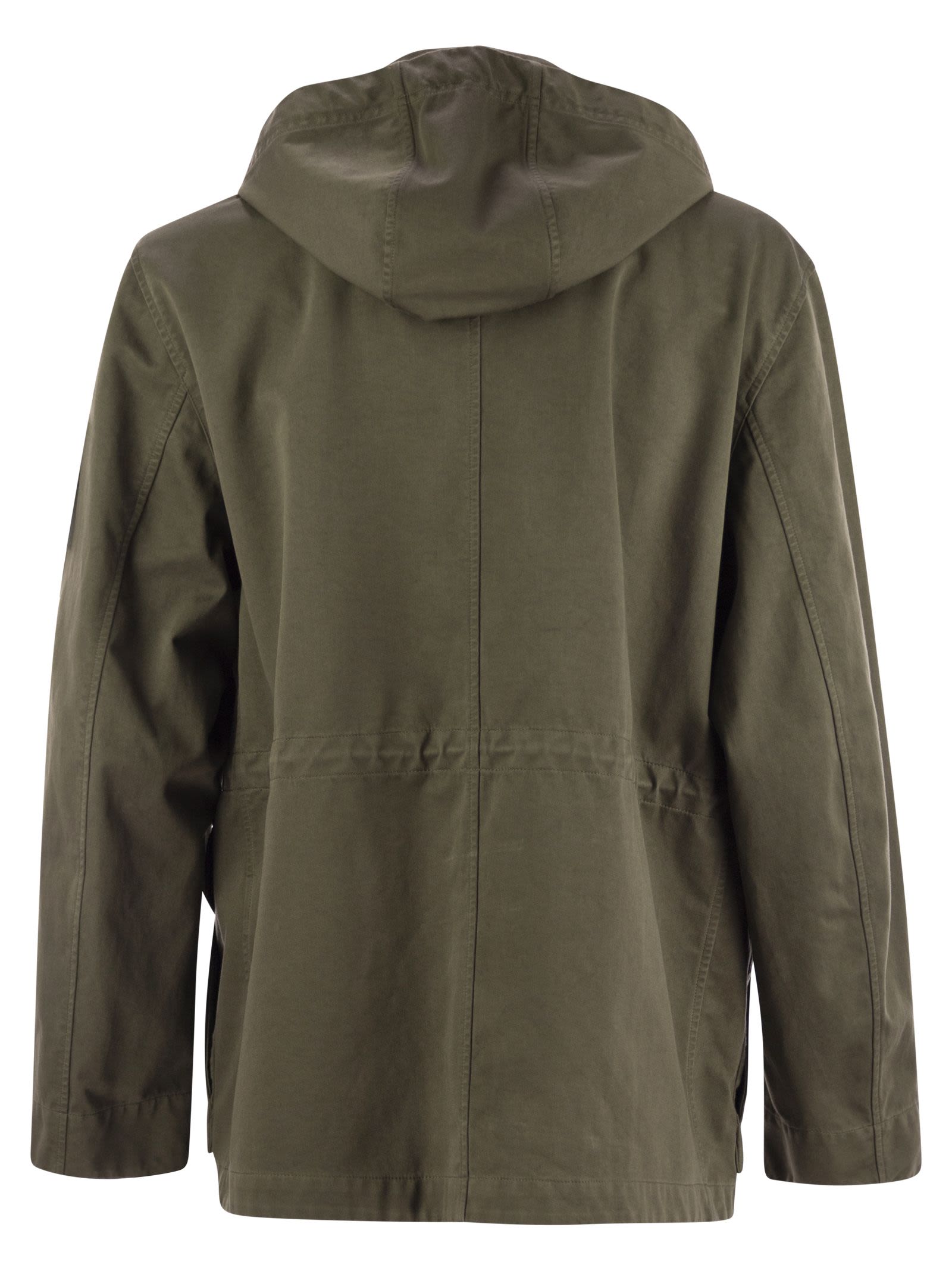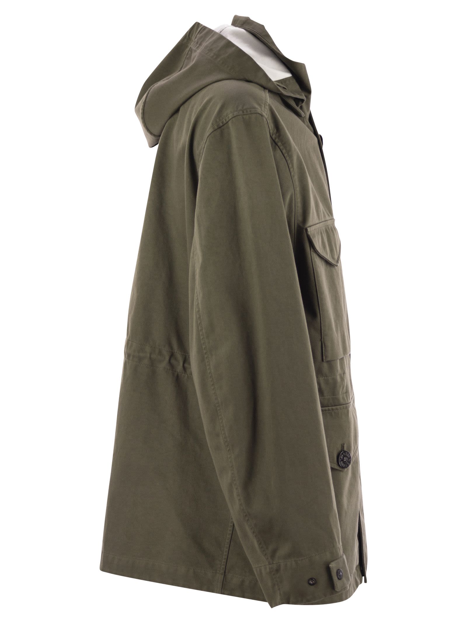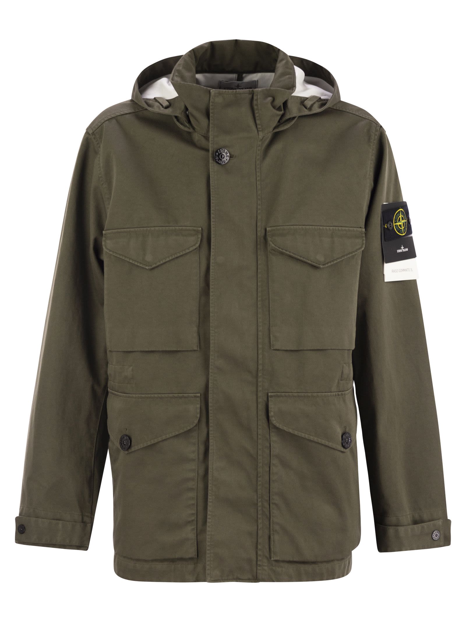 Field jacket in Raso Gommato 3L. An evolution of the iconic Stone Island Raso Gommato fabric, this high-performance version protected by a polyester mesh is made from military-inspired cotton satin, coated with a breathable, waterproof and windproof membrane. Garment dyed using specific recipes with the addition of a special anti-drip agent. - Contoured drawstring on removable hood - Rigid collar - Bellows pockets on chest with flap and snap button - Double front pockets, one with flap and button and the other, slanted, higher up - Internal drawstring at waist - Stone Island badge on left sleeve - Adjustable snap fastener at cuffs - Concealed two-way zip with press studs DESIGNER ID: K1S154100064S0034 V0054