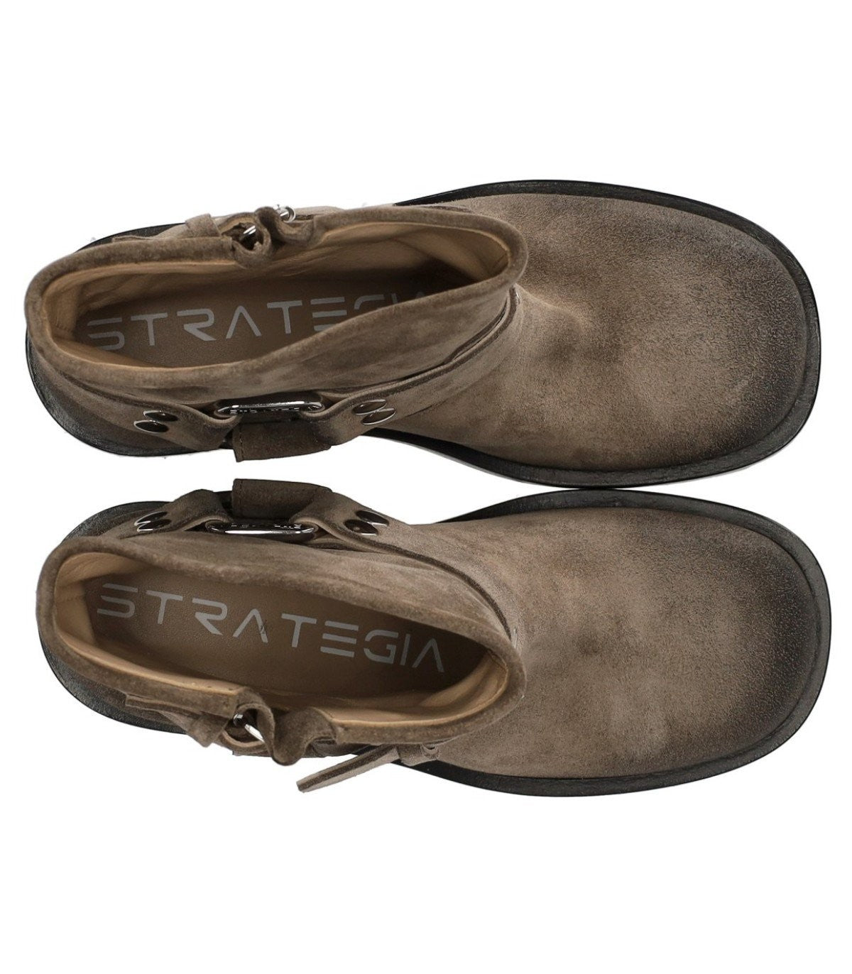 Beige suede ankle boot with vintage effect details, featuring adjustable buckle straps on the side. Soft leather interior, black rubber sole. Heel height 5 cm.