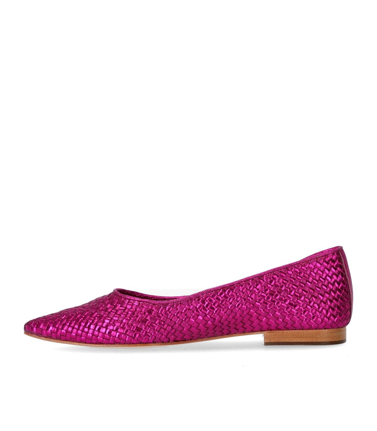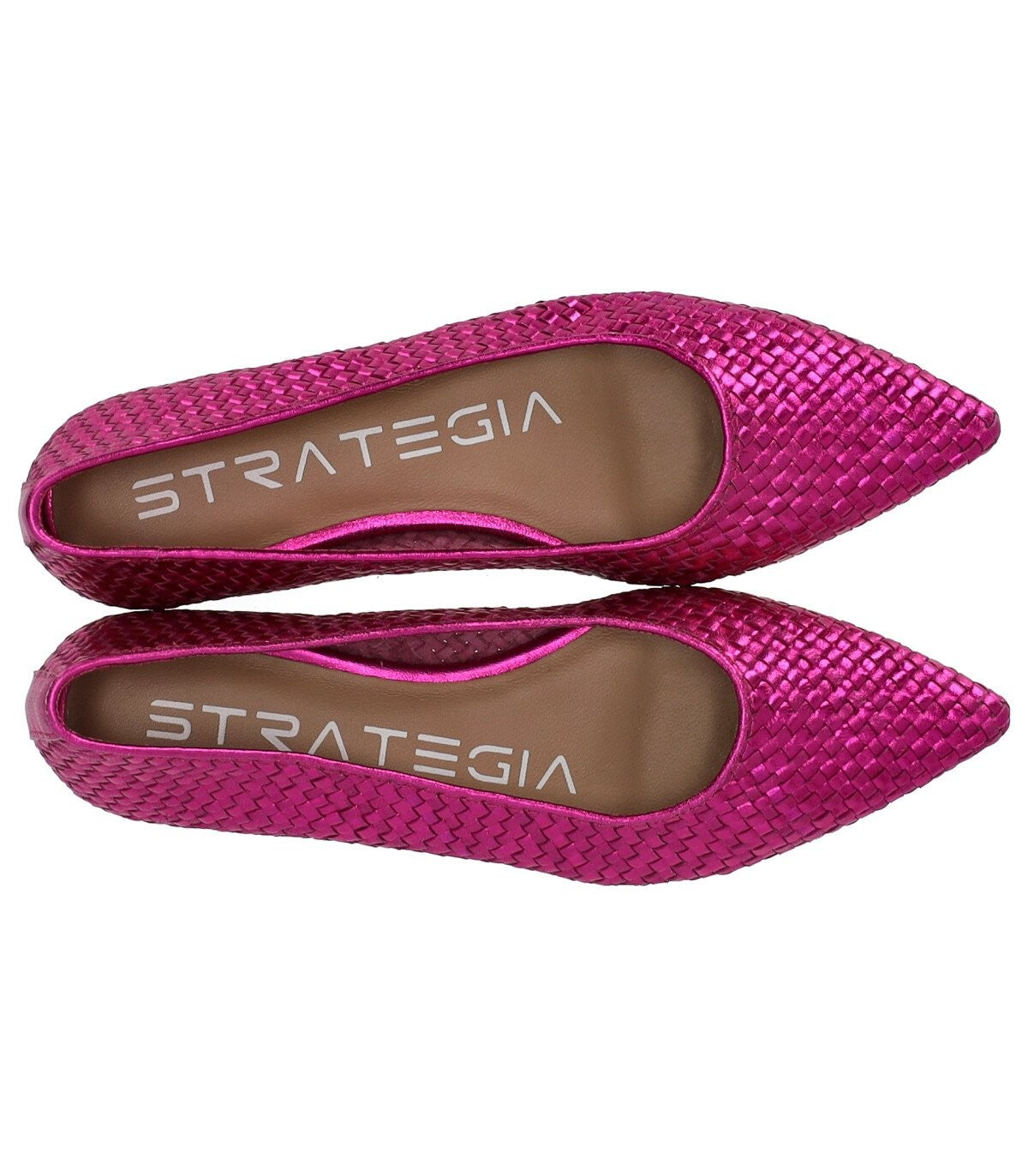 Strategia Liya flat shoe made of fuchsia laminated leather with woven effect. Tapered toe, lining and insole in soft leather. Leather sole, height 1 cm.