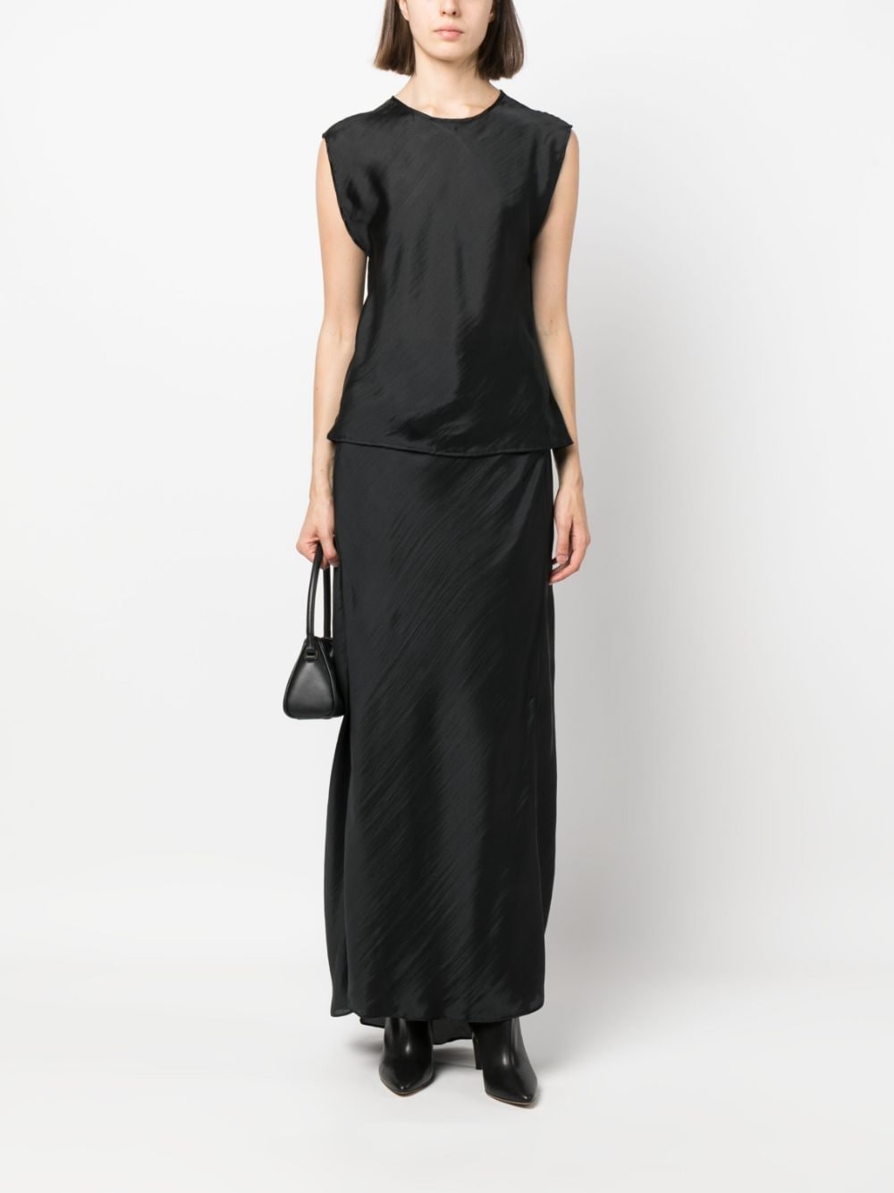 satin-finish maxi skirt from FORTE FORTE featuring jet black, silk blend, satin finish, concealed rear zip fastening, high waist, high-low hem and long length.