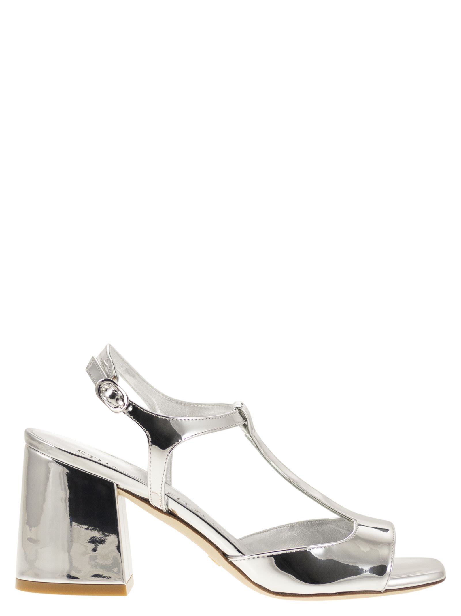 Stuart Weitzman Flareblock Mirrored Leather T Sandal