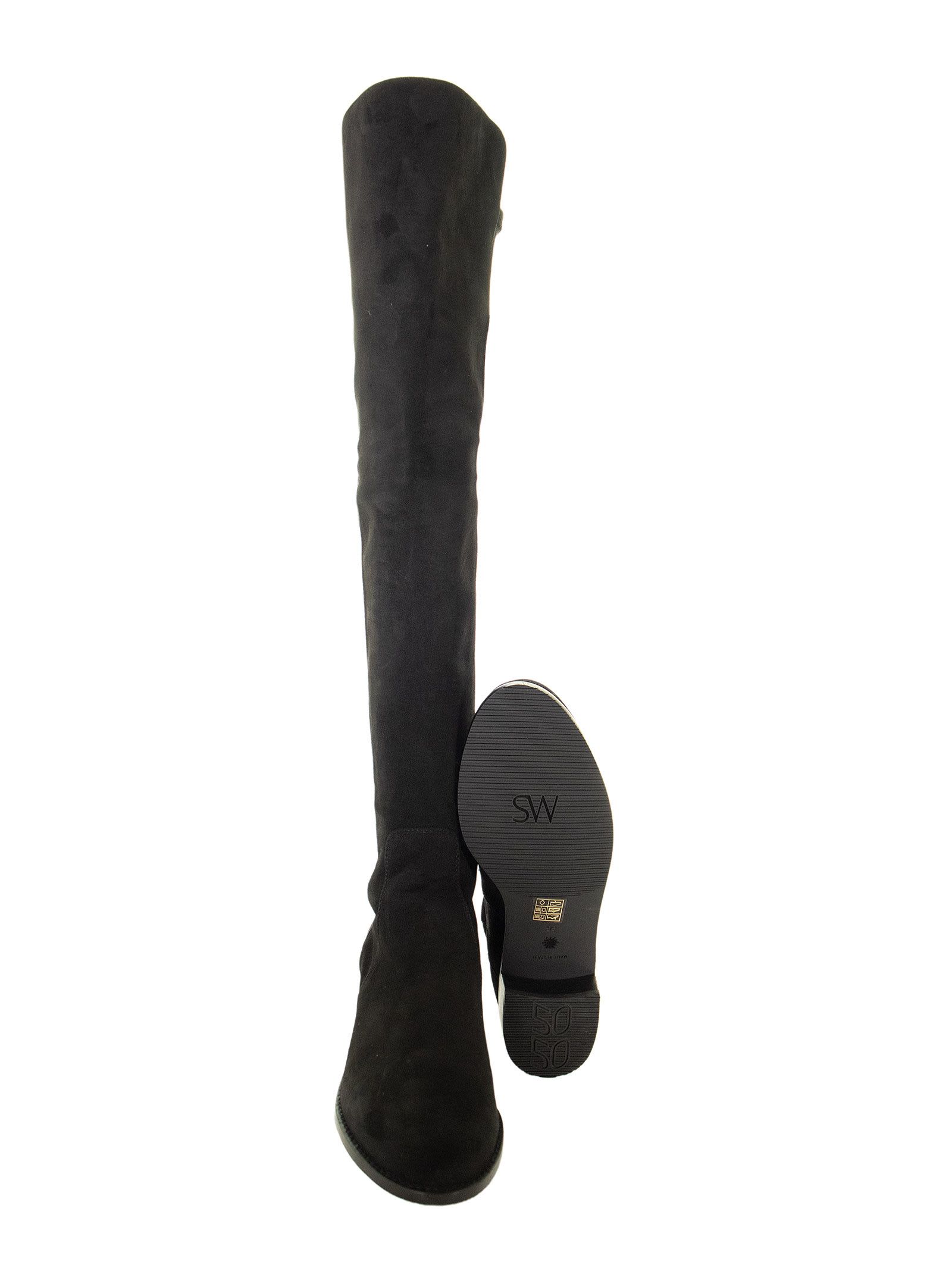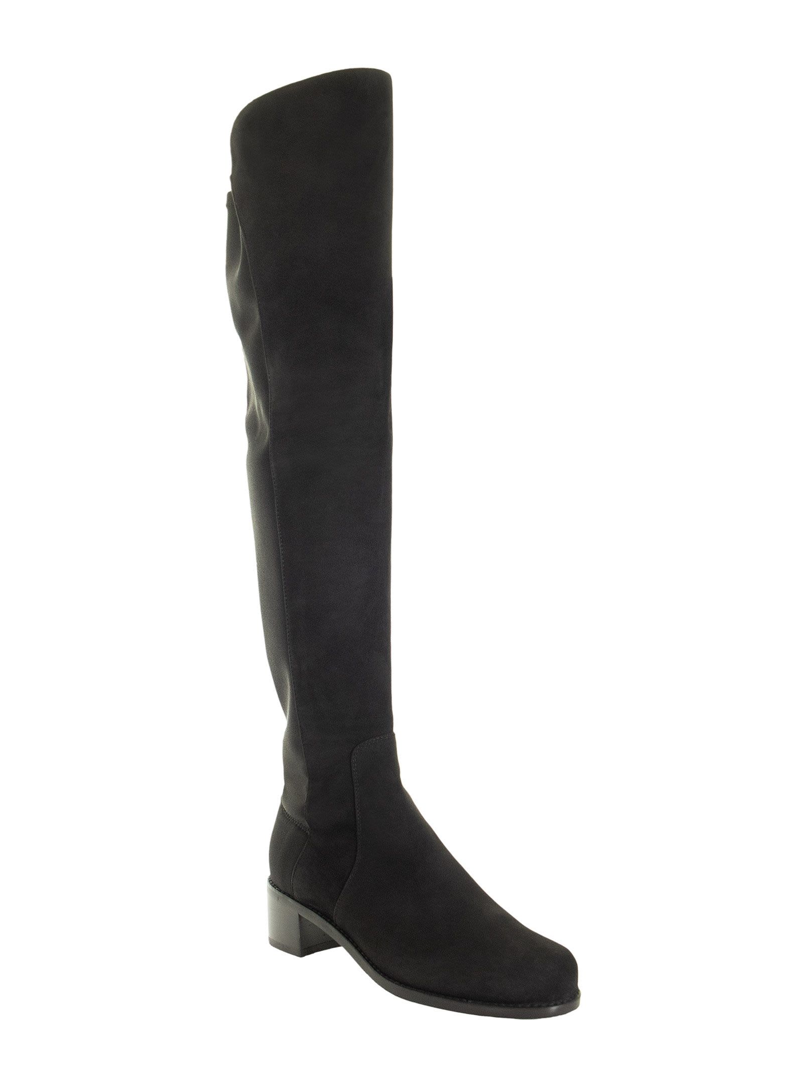 A reinterpretation of the iconic 5050, the RESERVE is a just-above-the-knee boot with a classic SW micro-stretch back leg, paired with a nappa leather or suede front. The block heel gives a stylish touch. Imagine it with leggings or skinny jeans during the day or a structured mini dress to make an impression at happy hour. DESIGNER ID: S4464 BLK