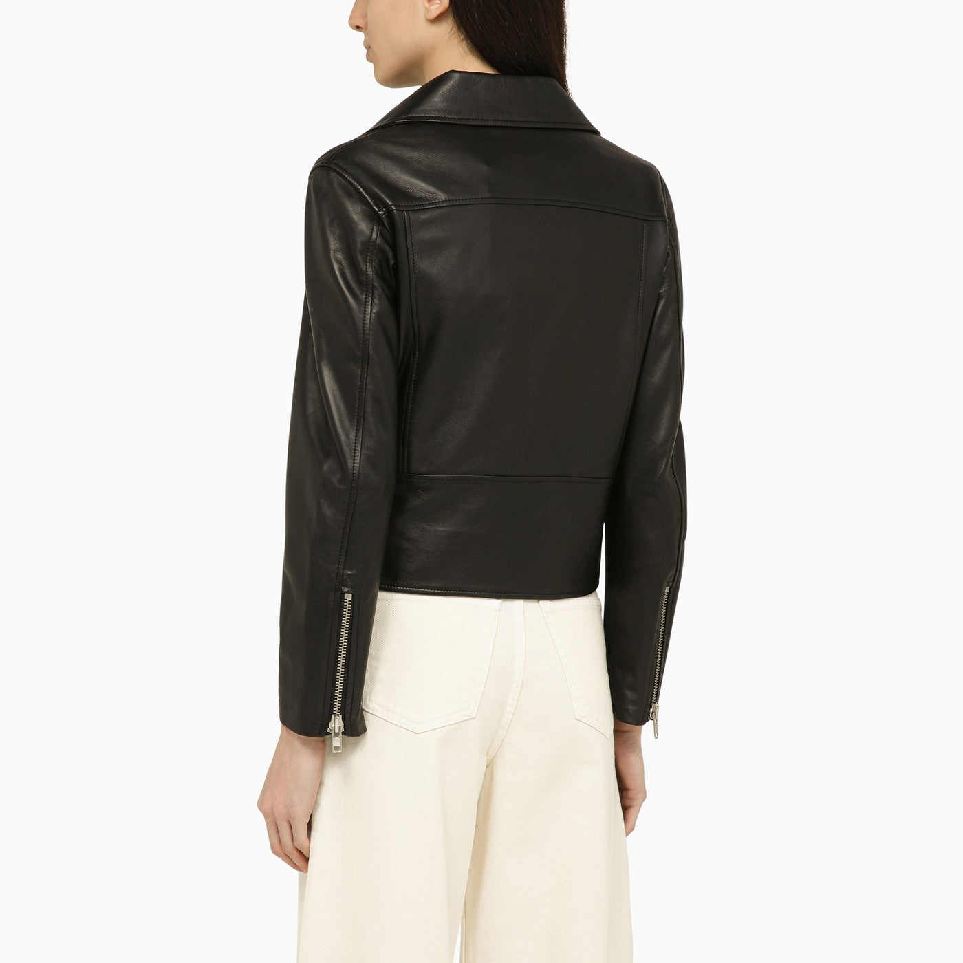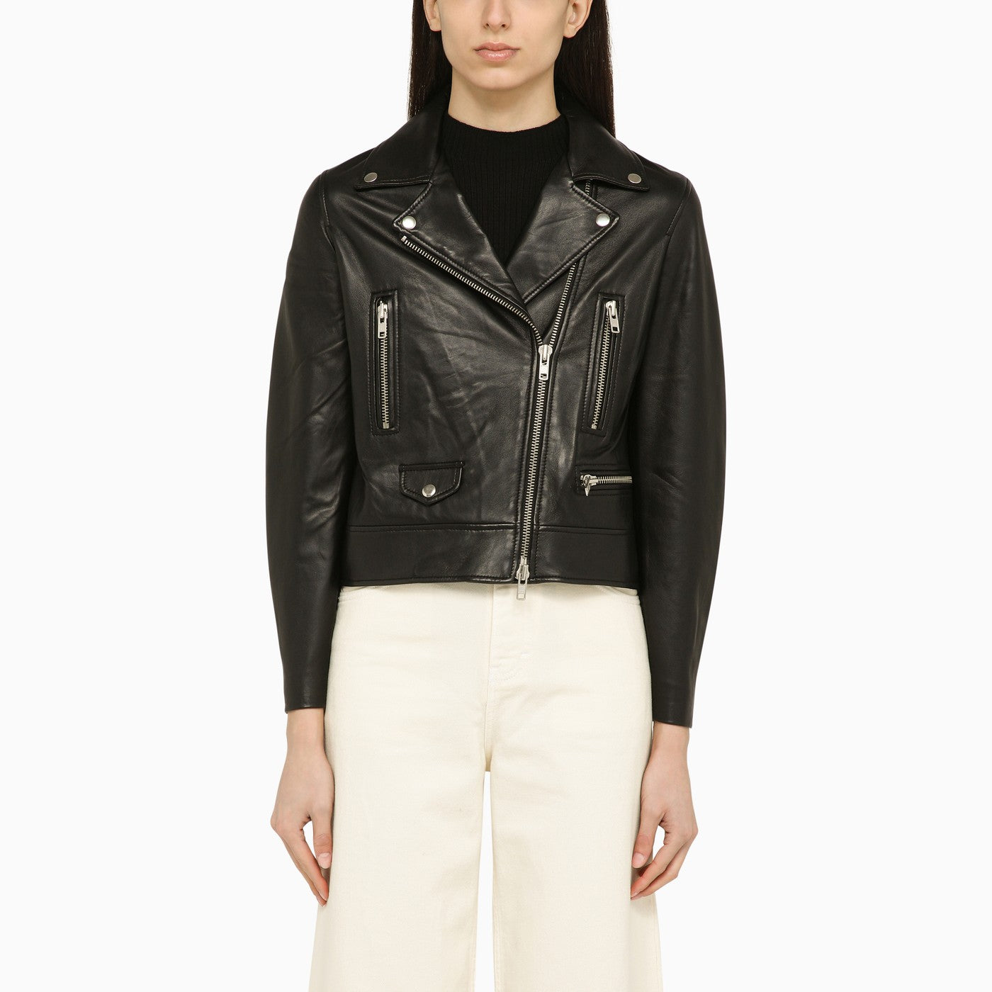 Black leather biker jacket from SWD by S.w.o.r.d. featuring a front zip fastening, long sleeves, front pockets and zipped cuffs.