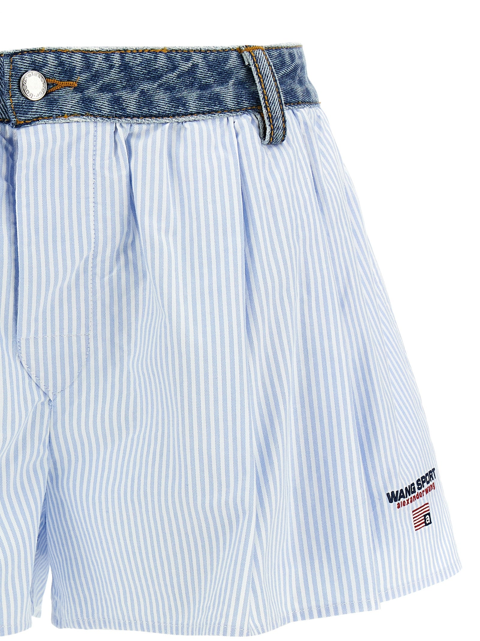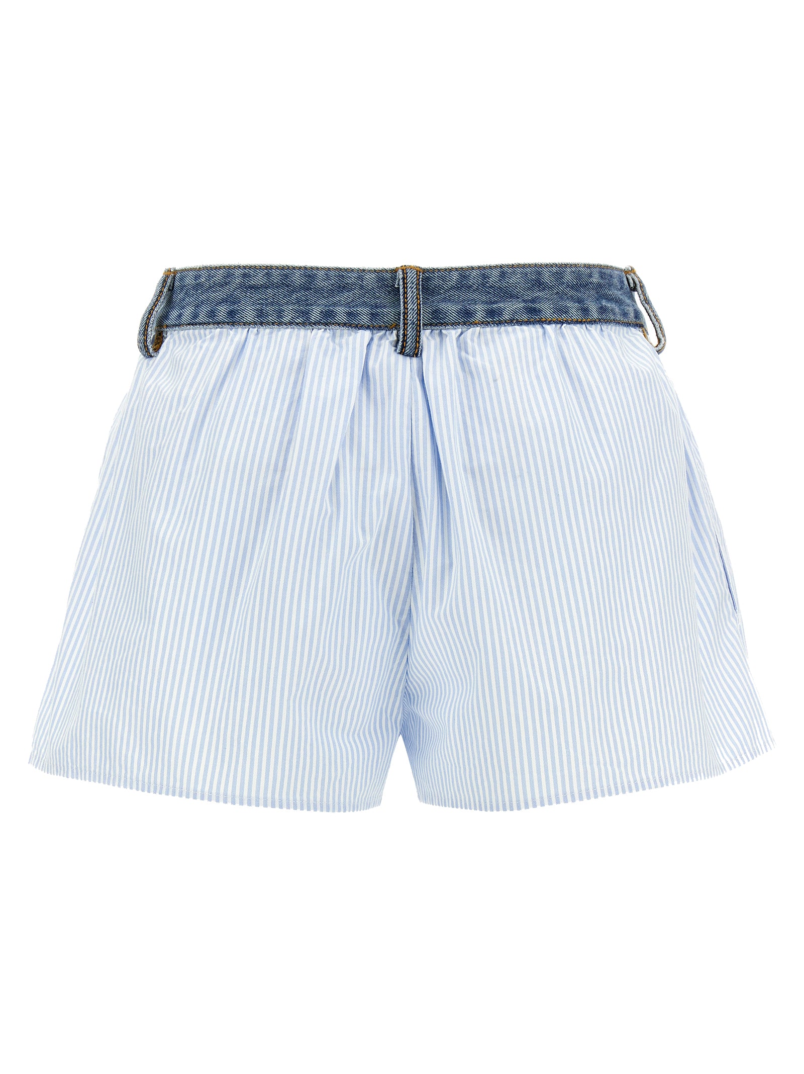 Oxford striped cotton shorts, boxer shorts with pleats and front logo embroidery, balloon silhouette, cotton denim waistband, front button closure.