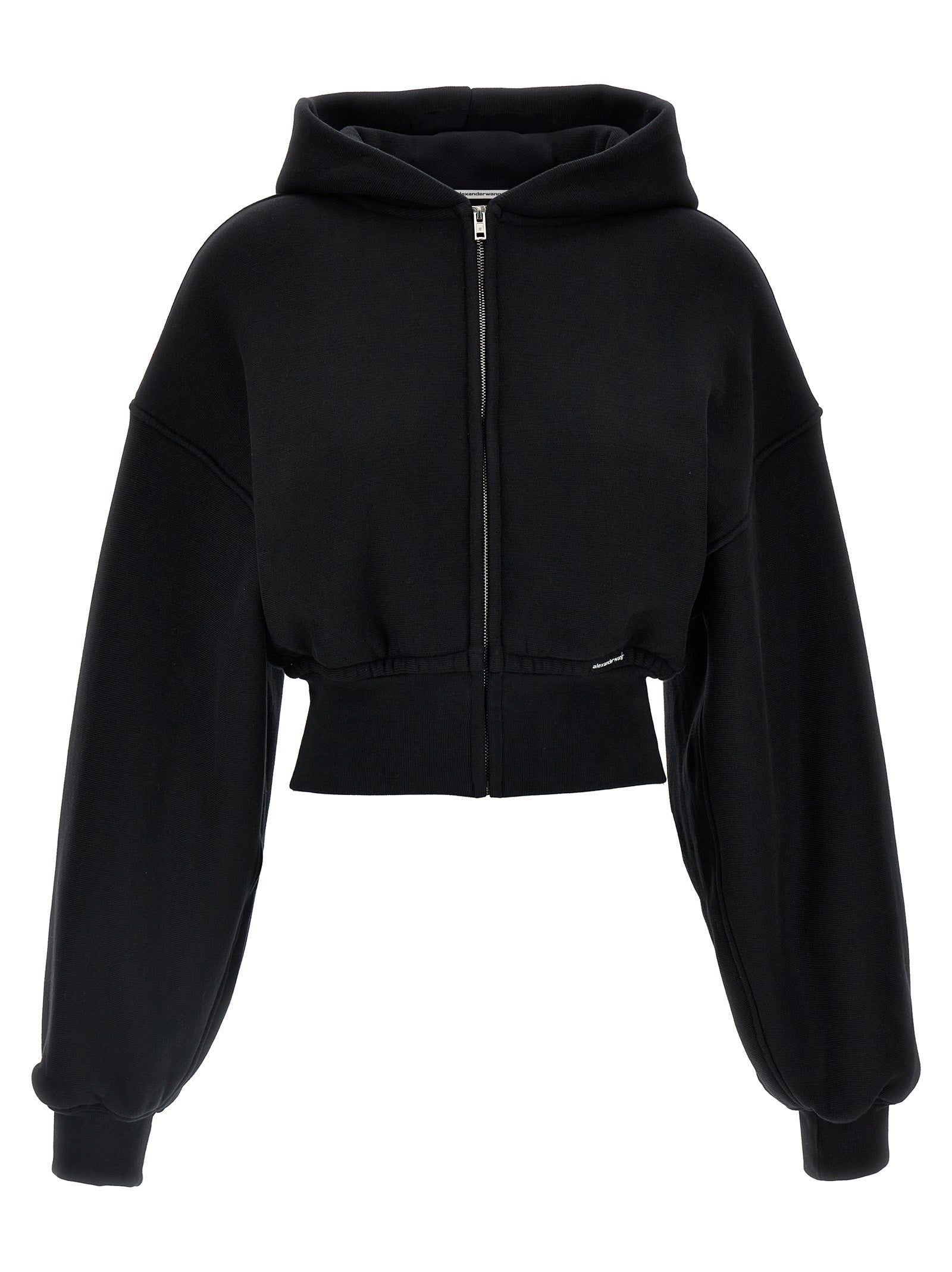 Cropped cotton hoodie with zip closure, long cuffed sleeves.