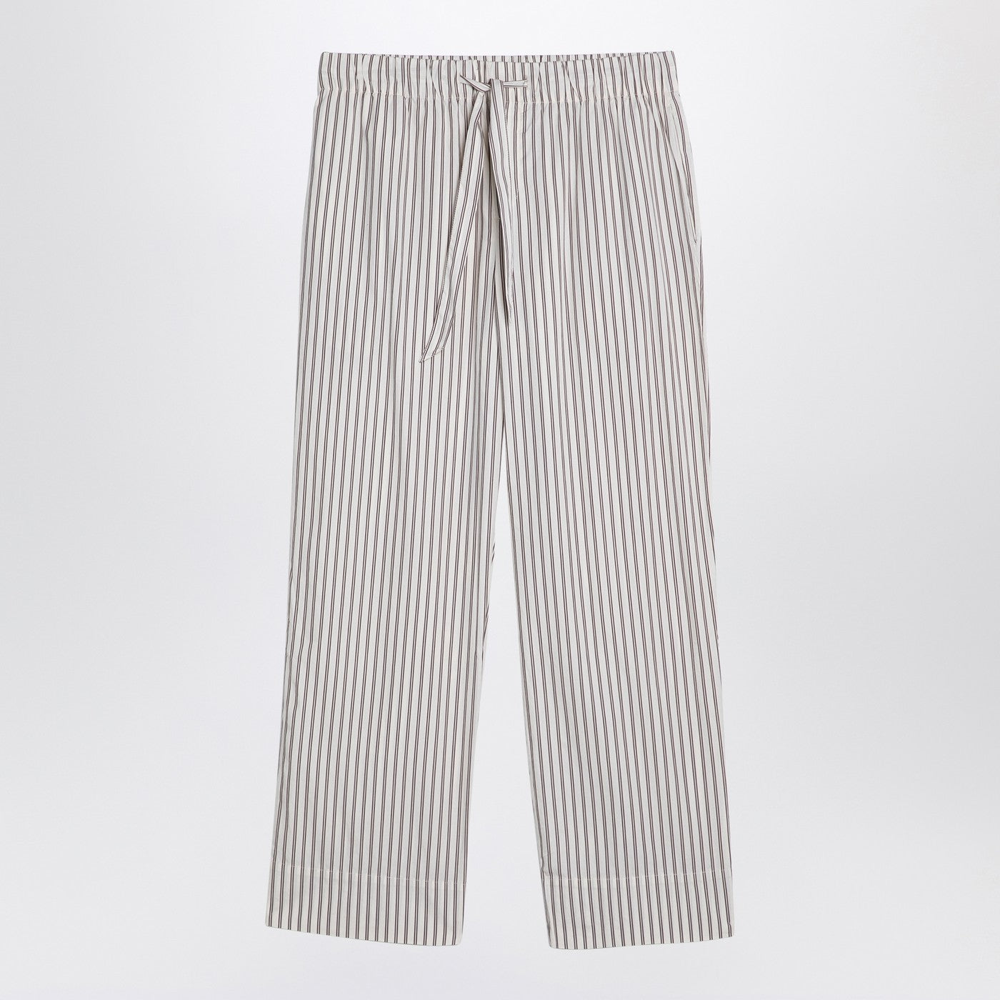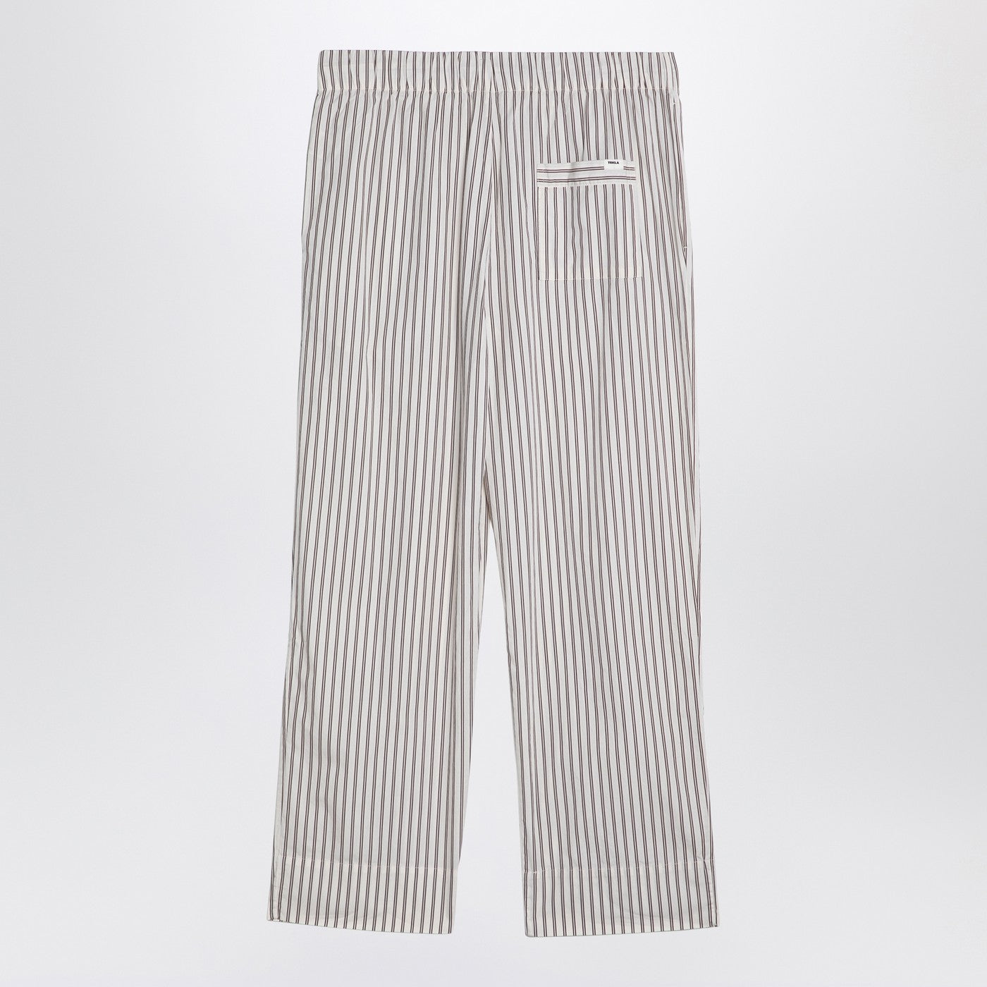 Wide pyjama trousers in beige striped organic cotton by Tekla, featuring a back patch pocket with lettering logo plaque, two side welt pockets and an elasticated waistband with drawstring.