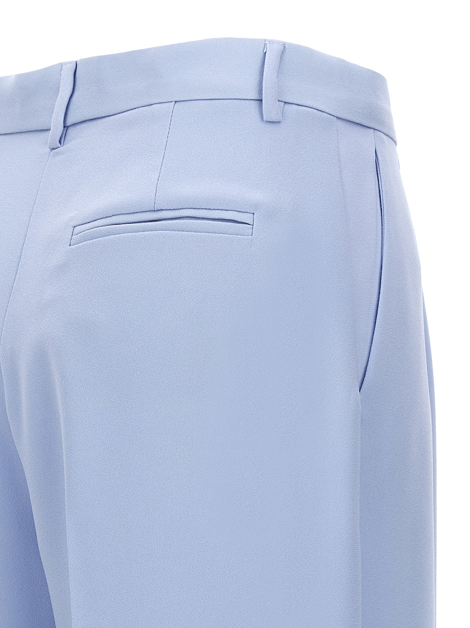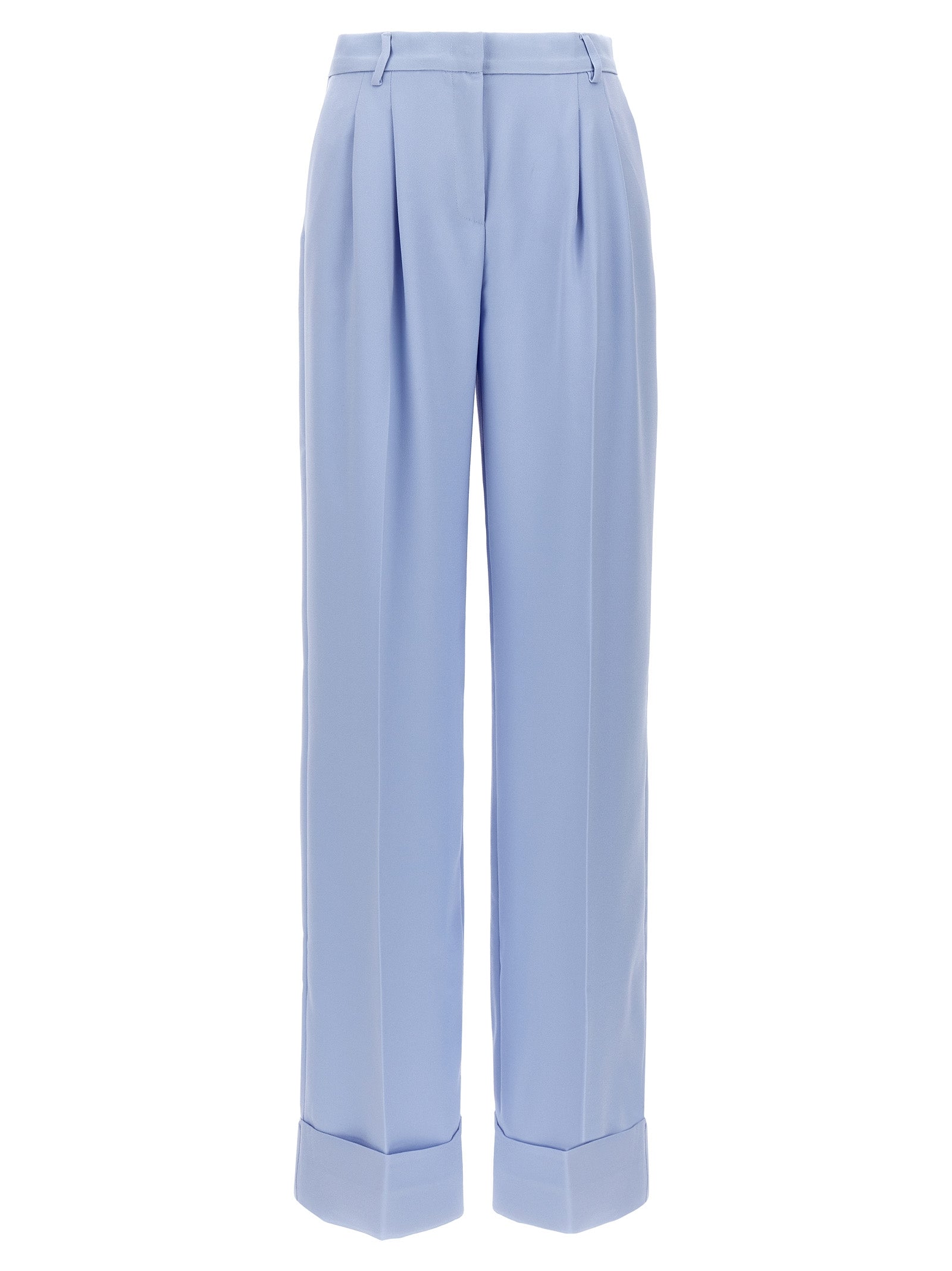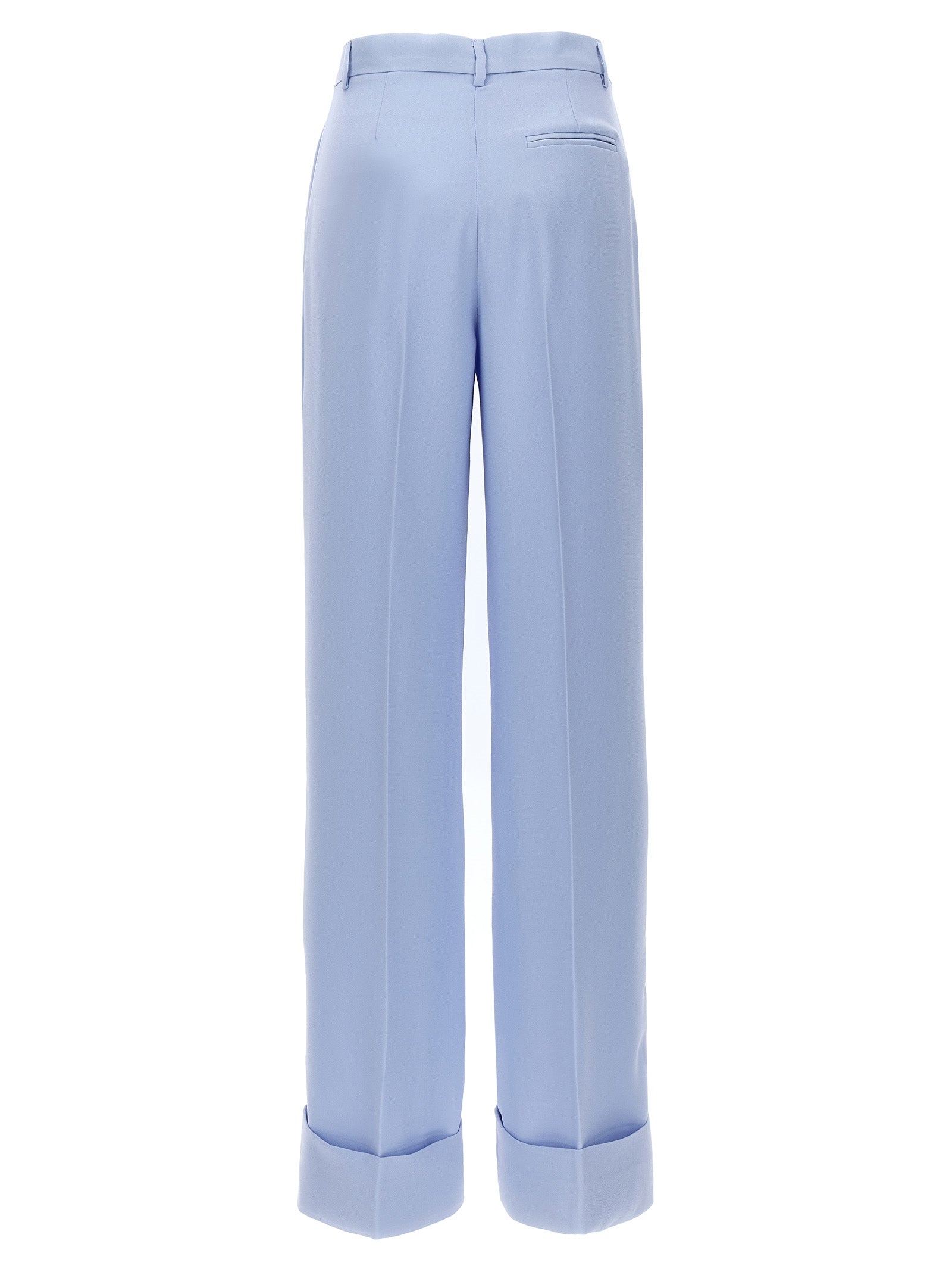 'Gladys' satin crepe pants, hook and button zip closure, pin tucks and stretched pleat, wide leg and turned-up hem, pockets.