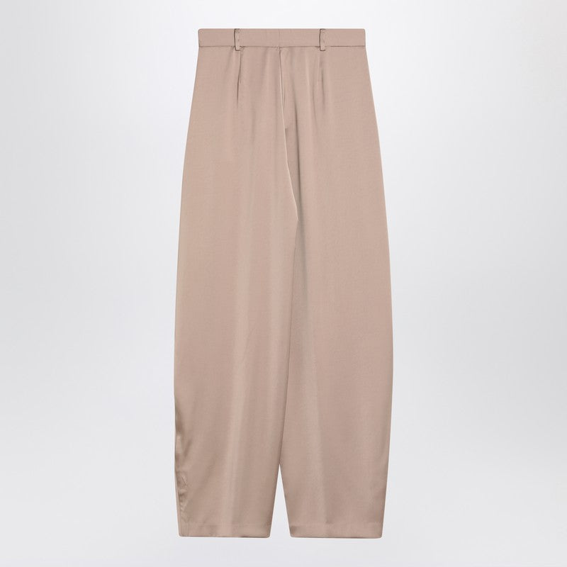 Wide trousers from The Andamane satin greige, featuring a high waist with belt loops, two side welt pockets, front pleats and a front zip and hook fastening.
