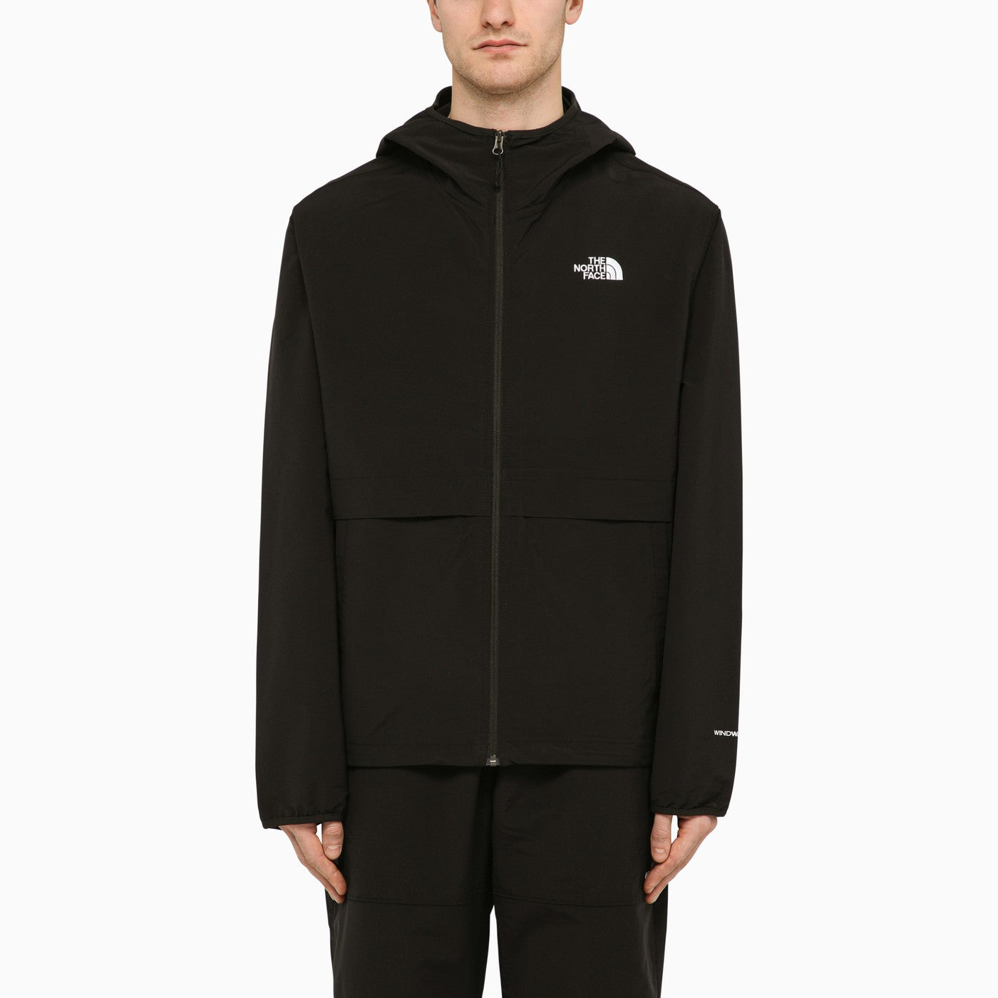 Sports jacket by The North Face in black WindWall technical fabric, featuring a fixed hood, front zip fastening, contrasting front and back lettering and two welt pockets.