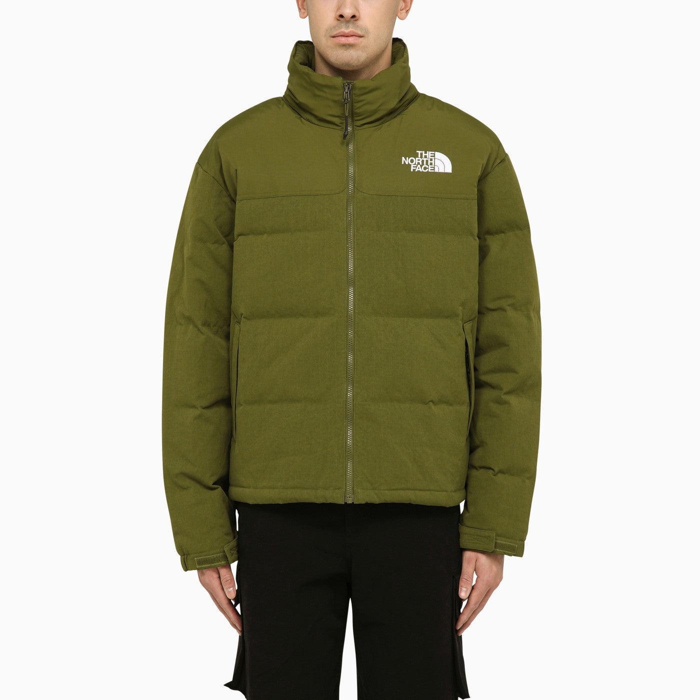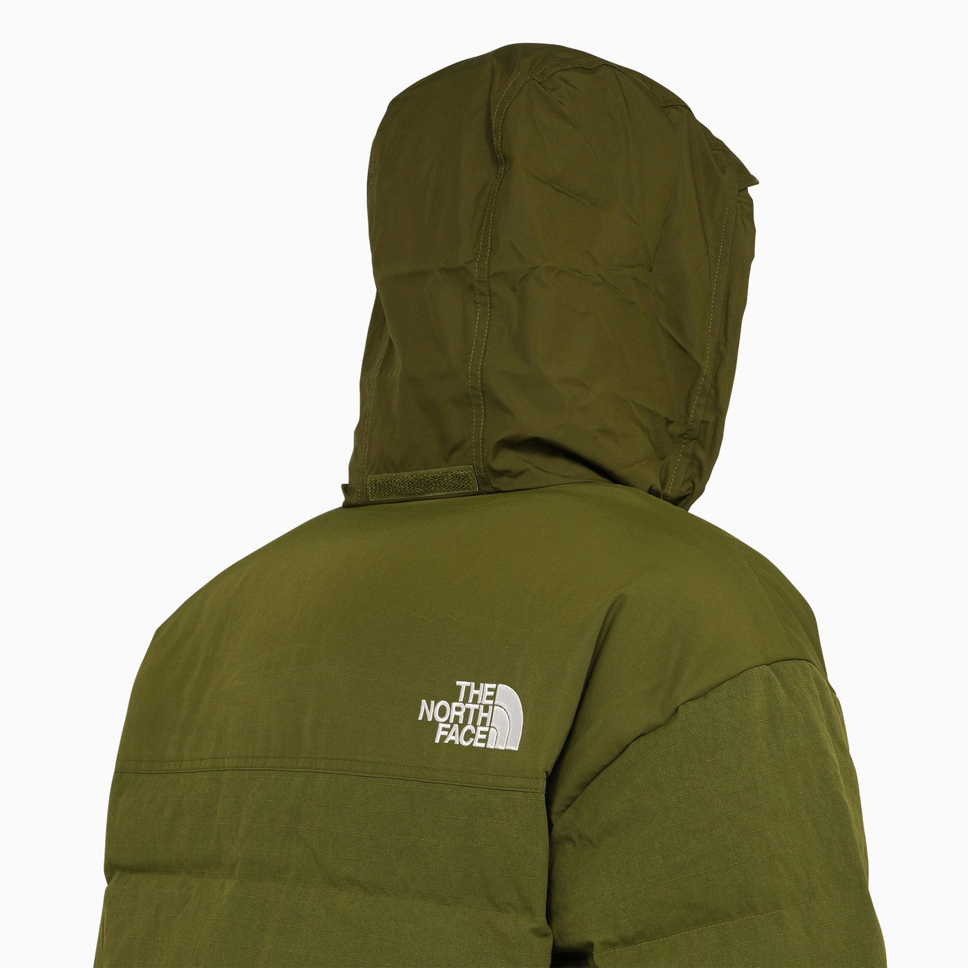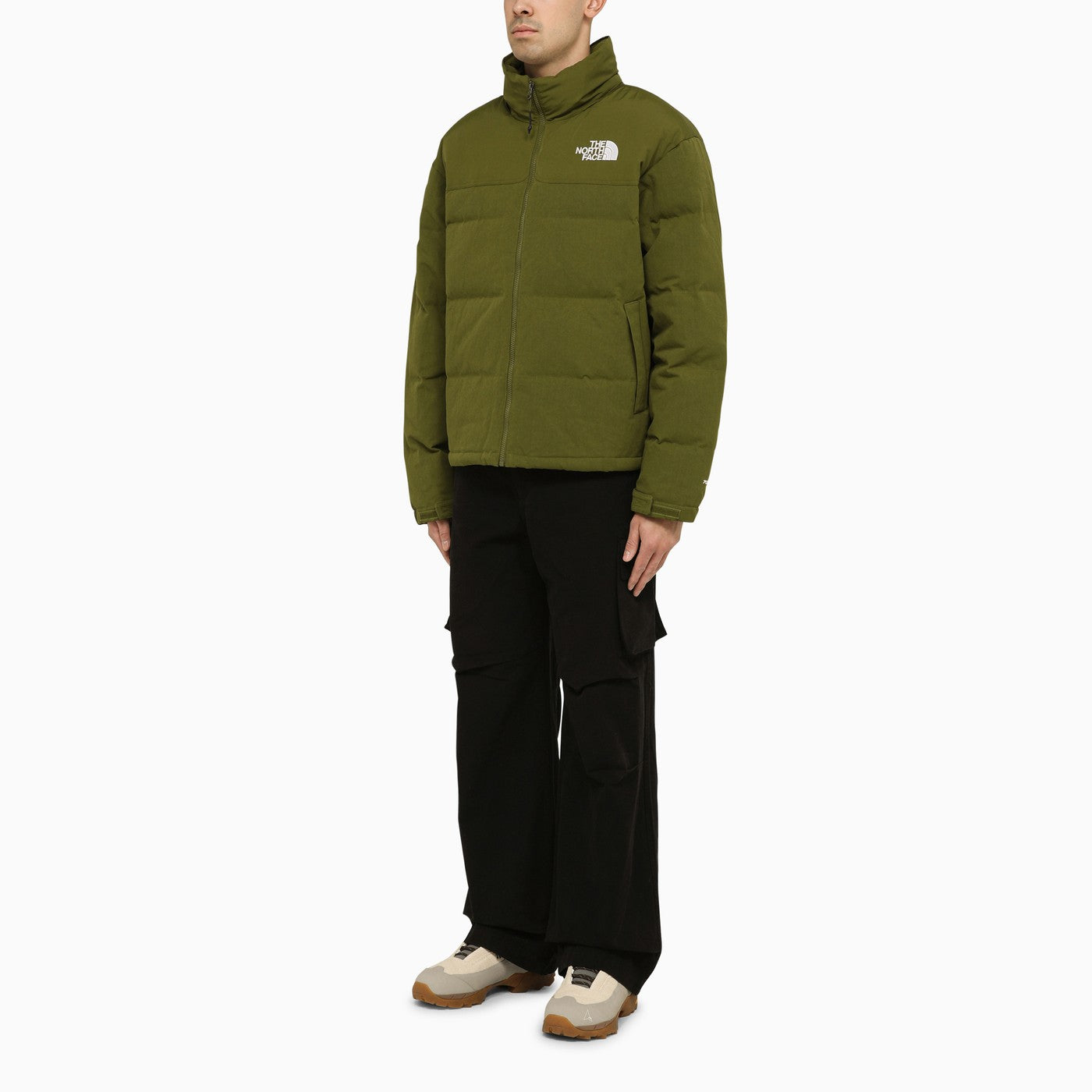 Forest green nylon down jacket by The North Face, featuring a removable hood, long sleeve with adjustable elasticated cuff with Velcro, front zip fastening, two welt pockets on the front and contrasting lettering on the front and back.