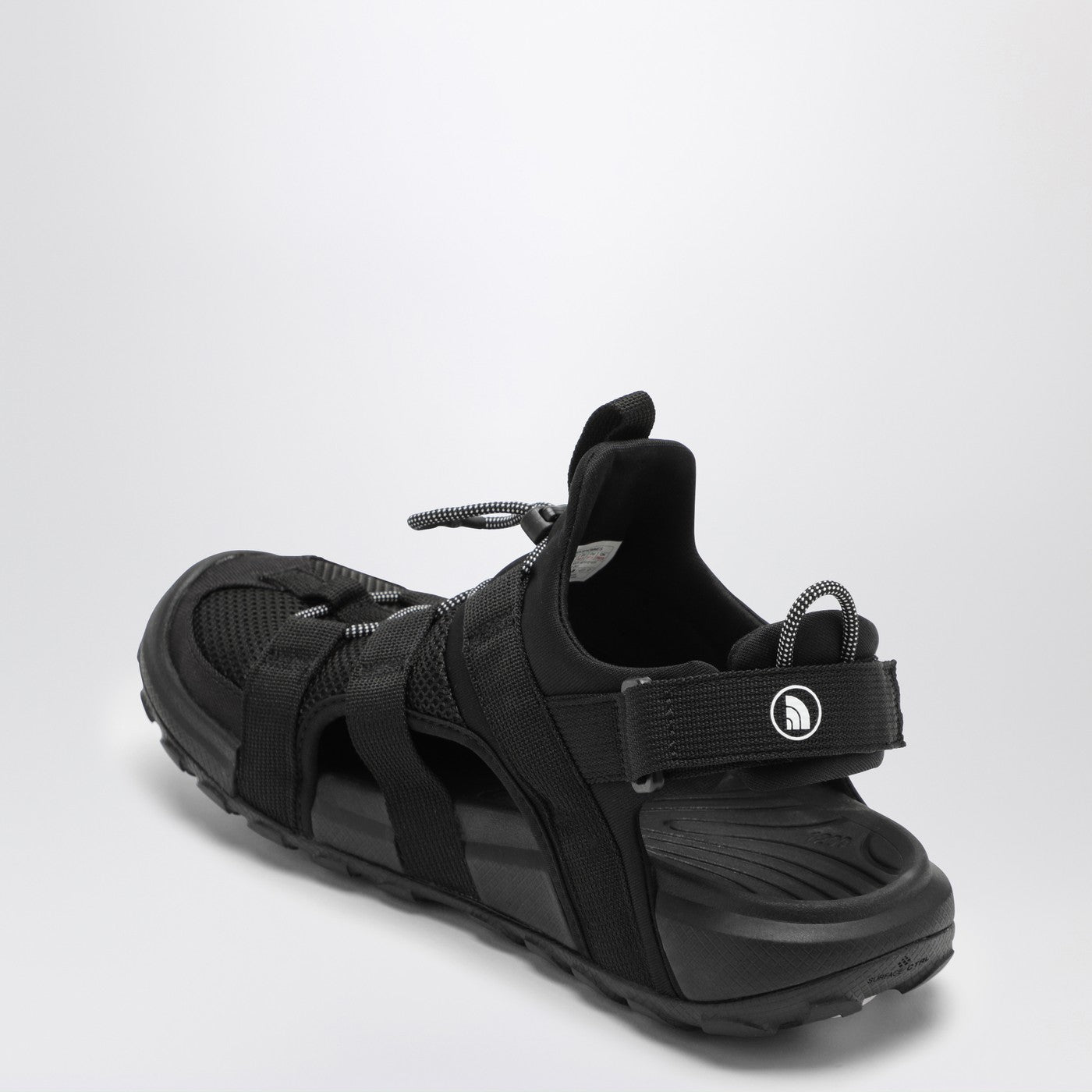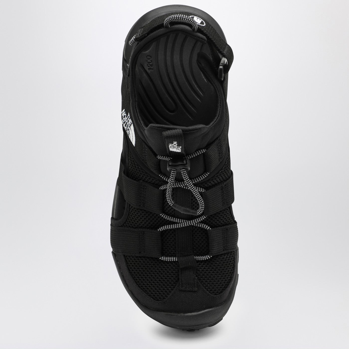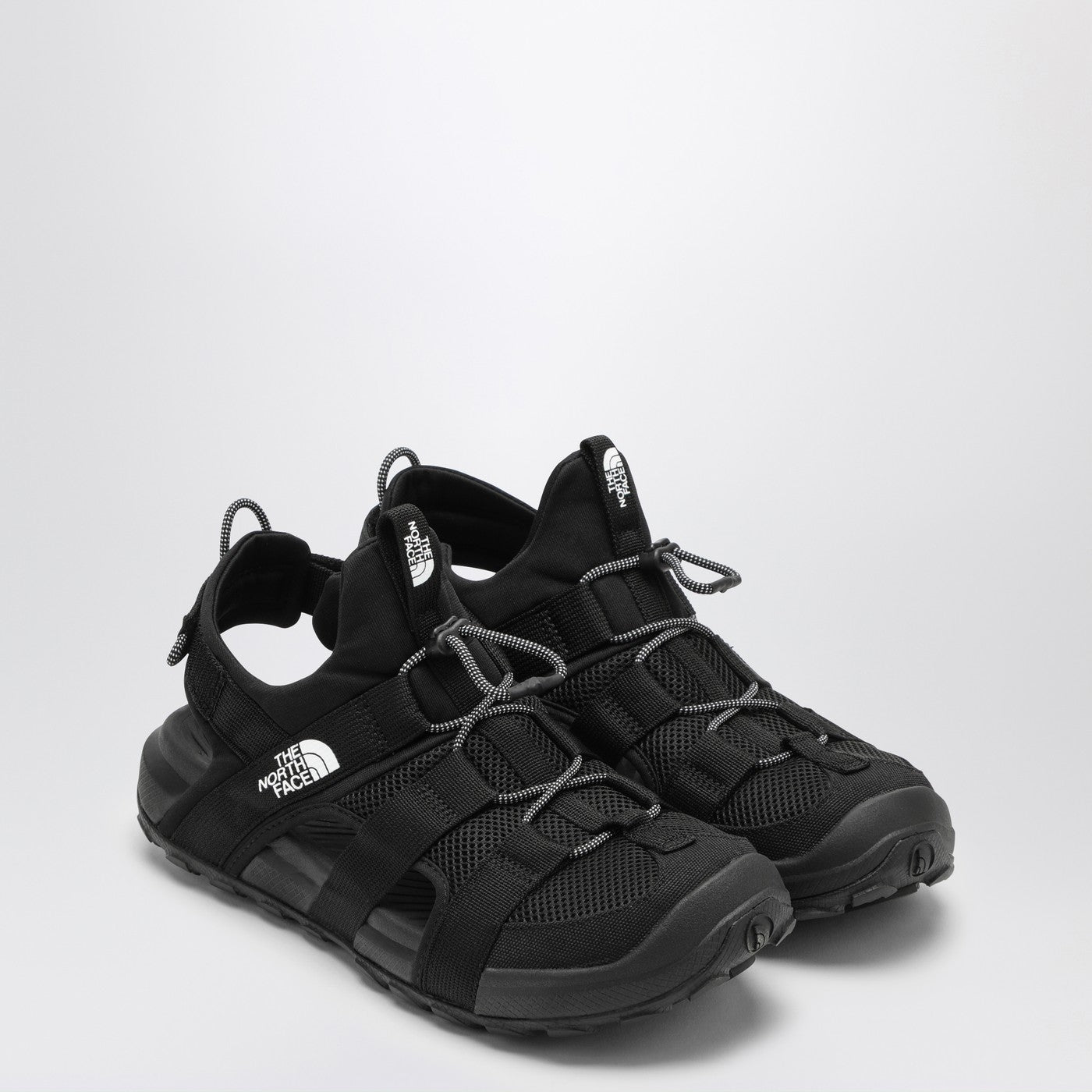 Sandal by The North Face in black recycled technical fabric, featuring a round toe, breathable and waterproof upper, front lace with cordlocker, adjustable heel strap with Velcro, contrasting lettering logo on the side and tongue, moulded EVA midsole and rubber sole.