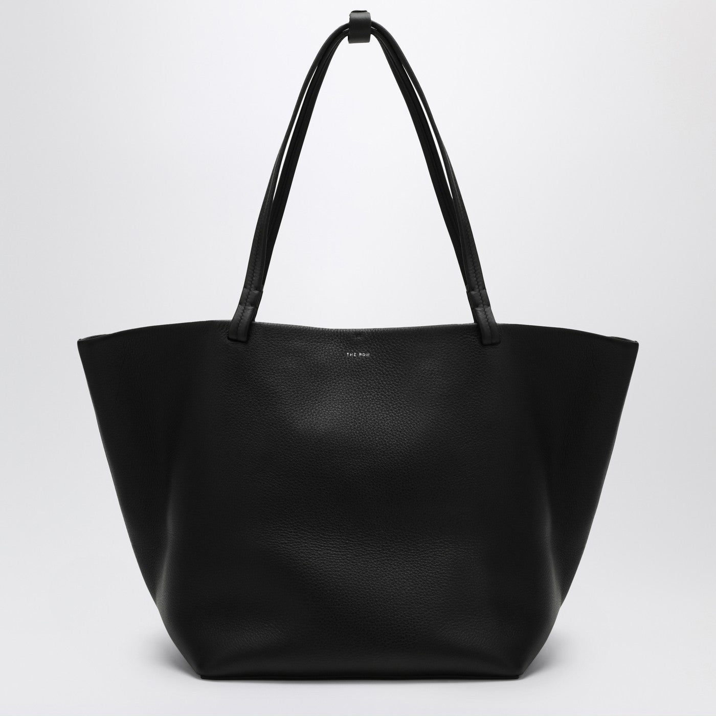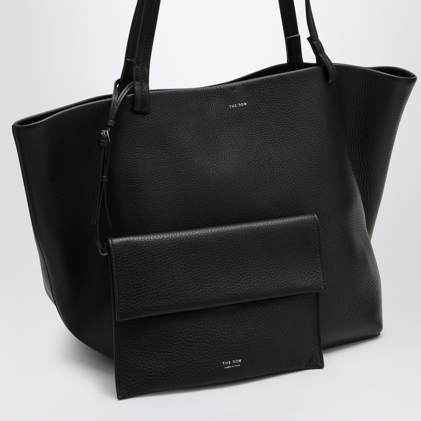 Tote bag by The Row in black leather, featuring two leather handles, lettering logo on the front, a claspless design and a removable zip pouch.