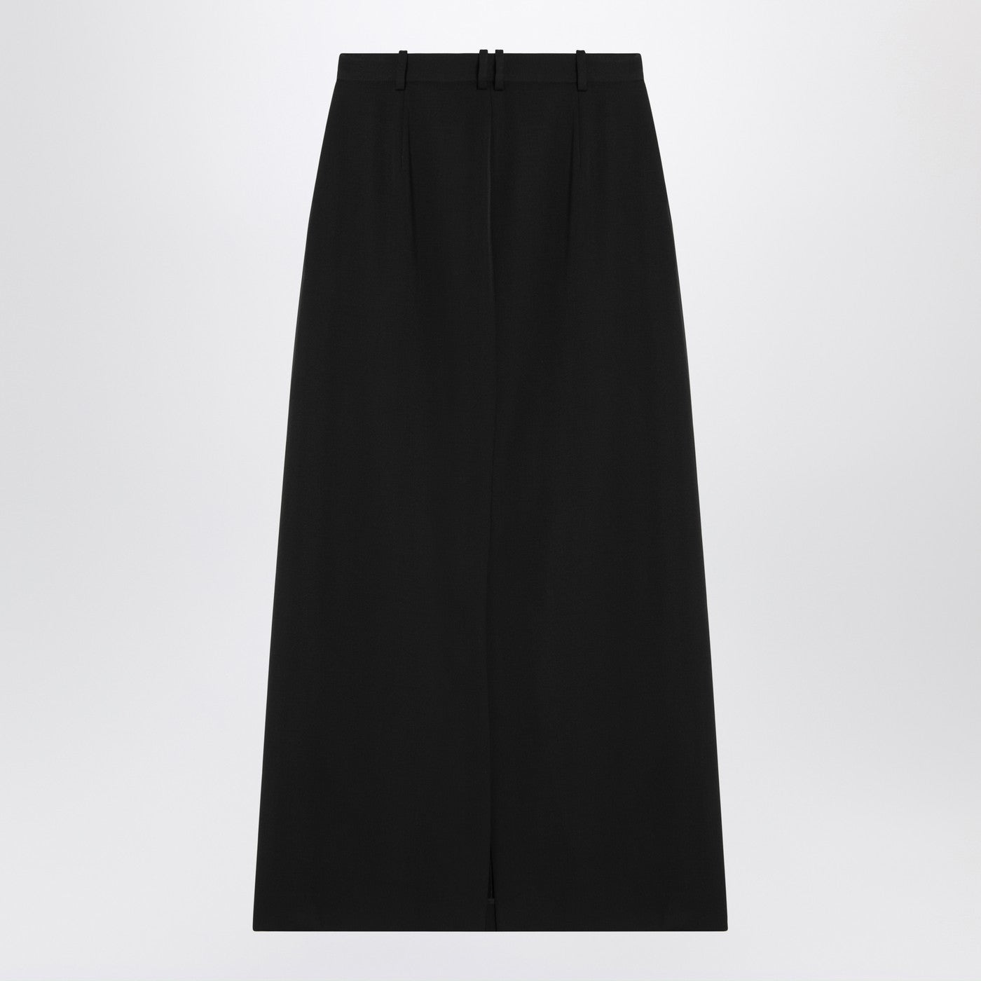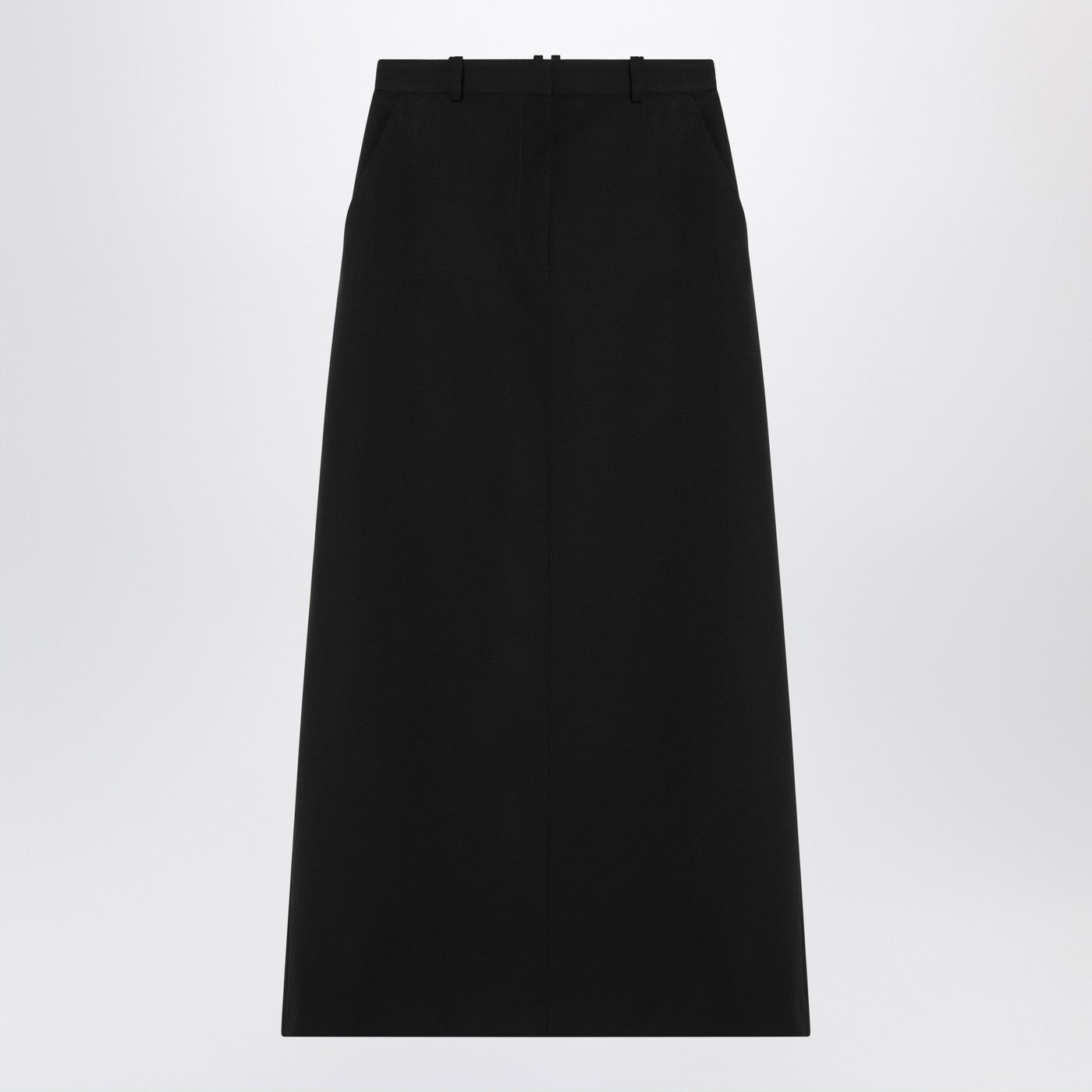 Black stretch virgin wool long skirt from The Row featuring a front zip and hook fastening, waist loops, two side welt pockets and a rear vent.