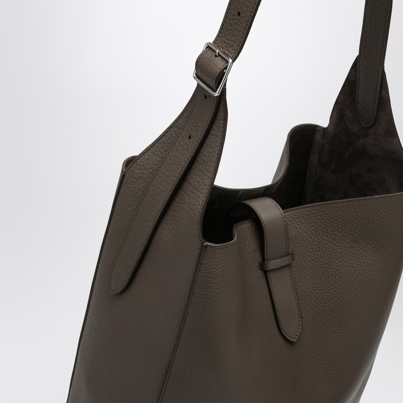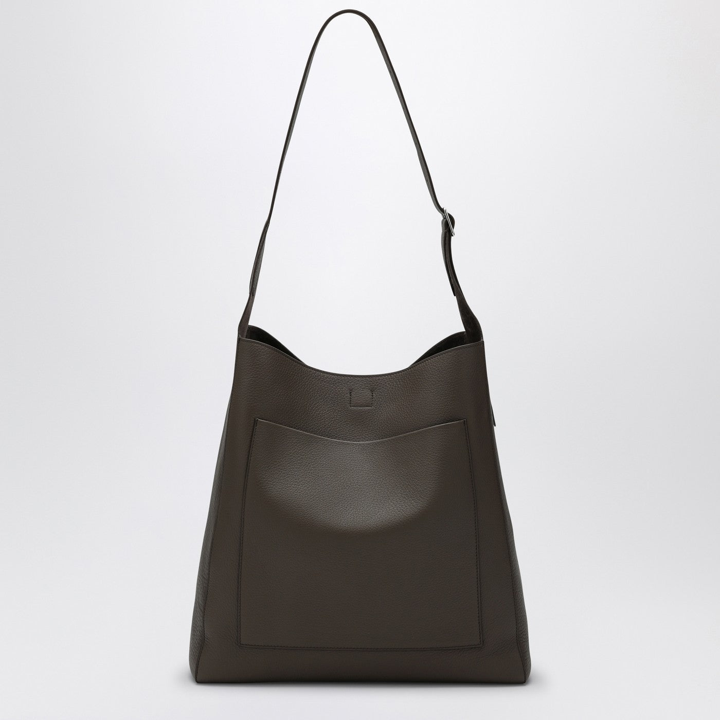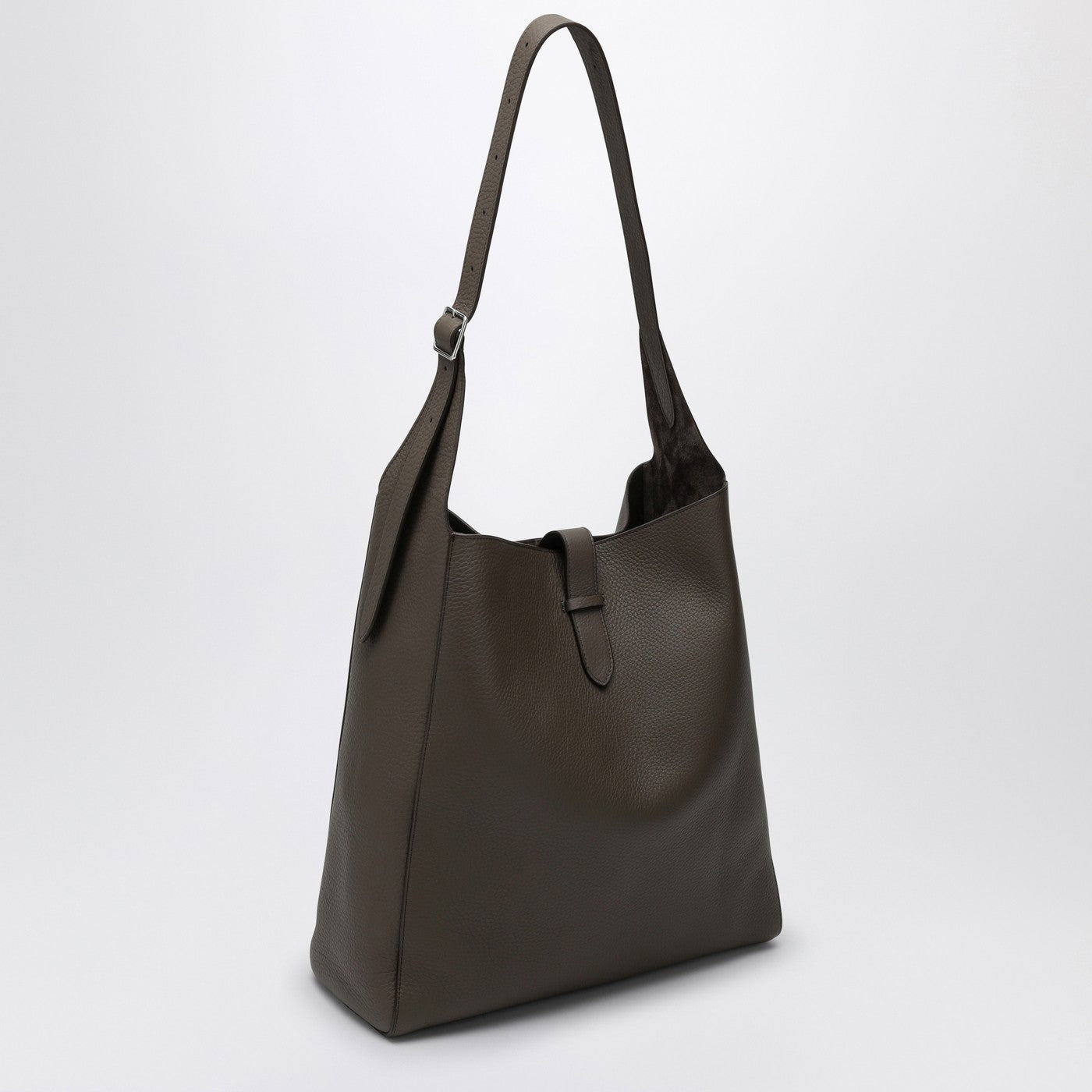 Brown grained calf leather bag from The Row featuring an adjustable shoulder strap, an exterior back pocket, a removable interior zip pouch and a magnetic closure.